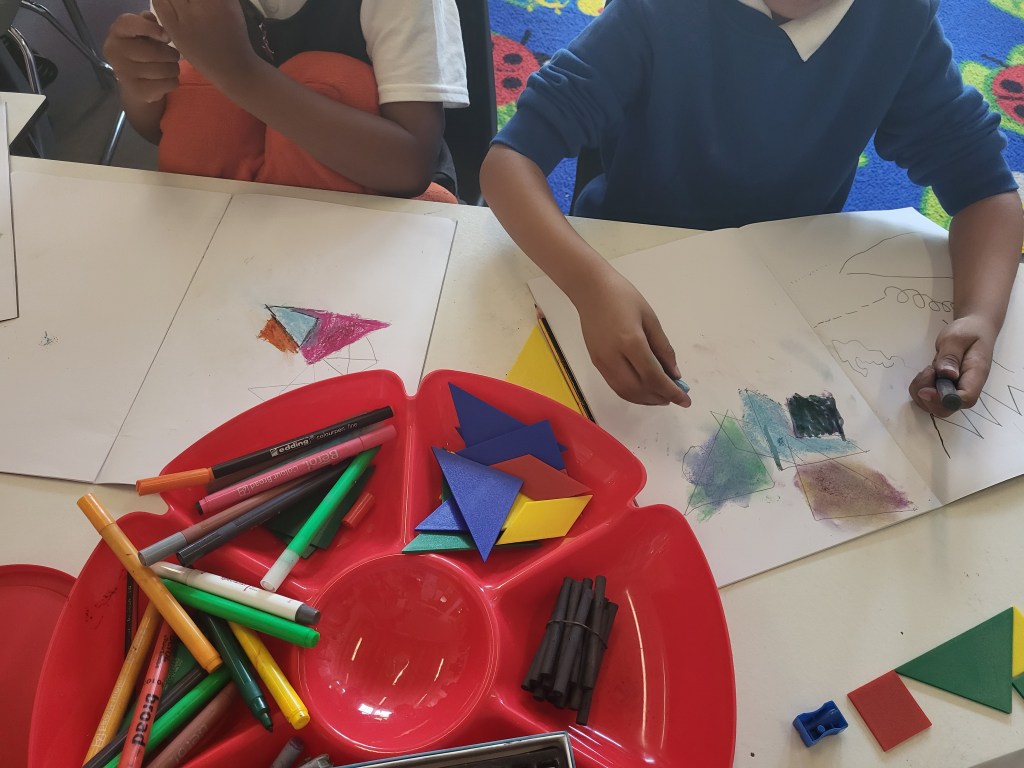 Our first task was to use pencils to draw 2D shapes and practice different types of lines we learned in a previous lesson. Then came the fun part: adding colour! We explored a variety of media, including charcoal, oil pastels, felt pens, soft pastels, and pencils.