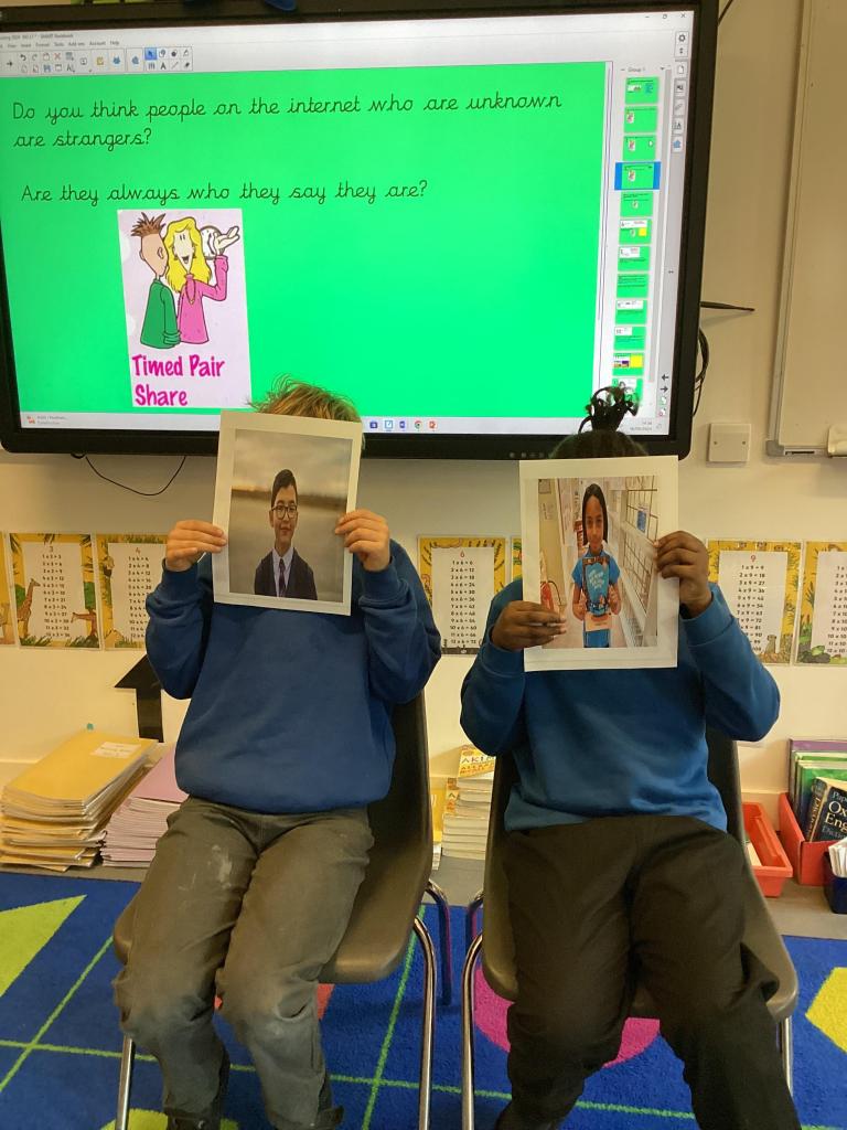 At the end of the exercise, the children revealed their true identities by turning the images around – they were not who they had been pretending to be. This simple but powerful role-play activity really helped our pupils grasp the importance of online safety, reinforcing our discussion in a memorable and engaging way.