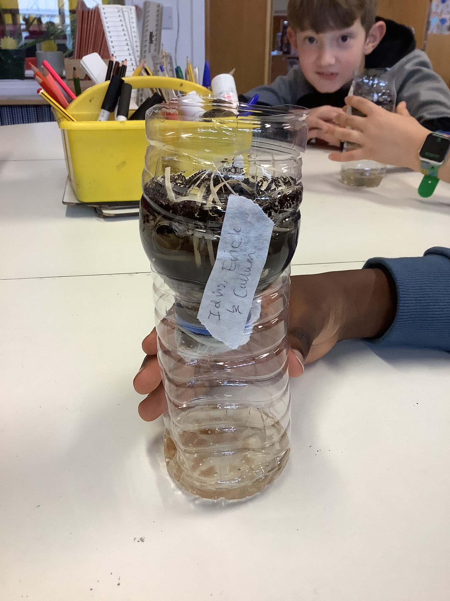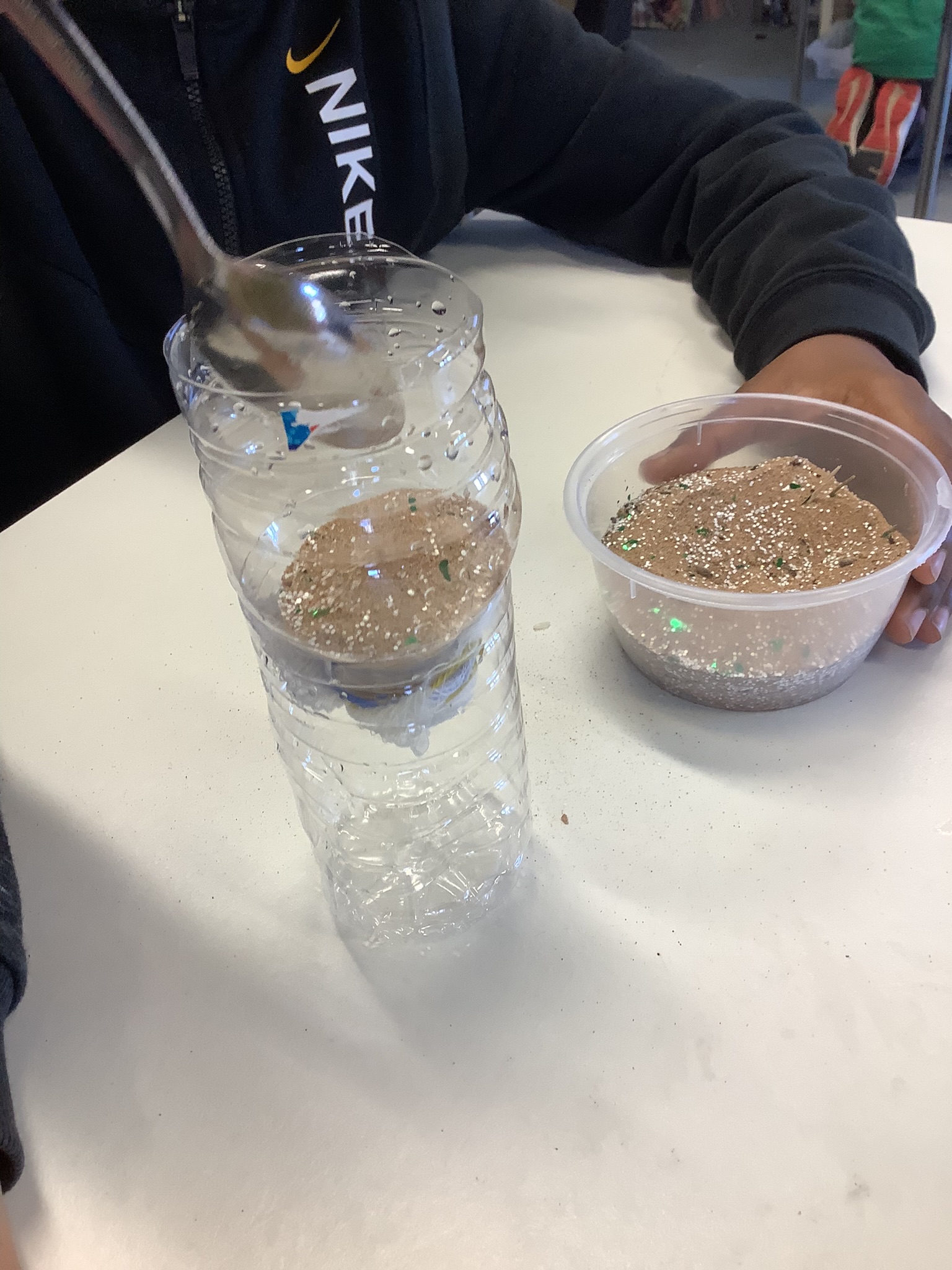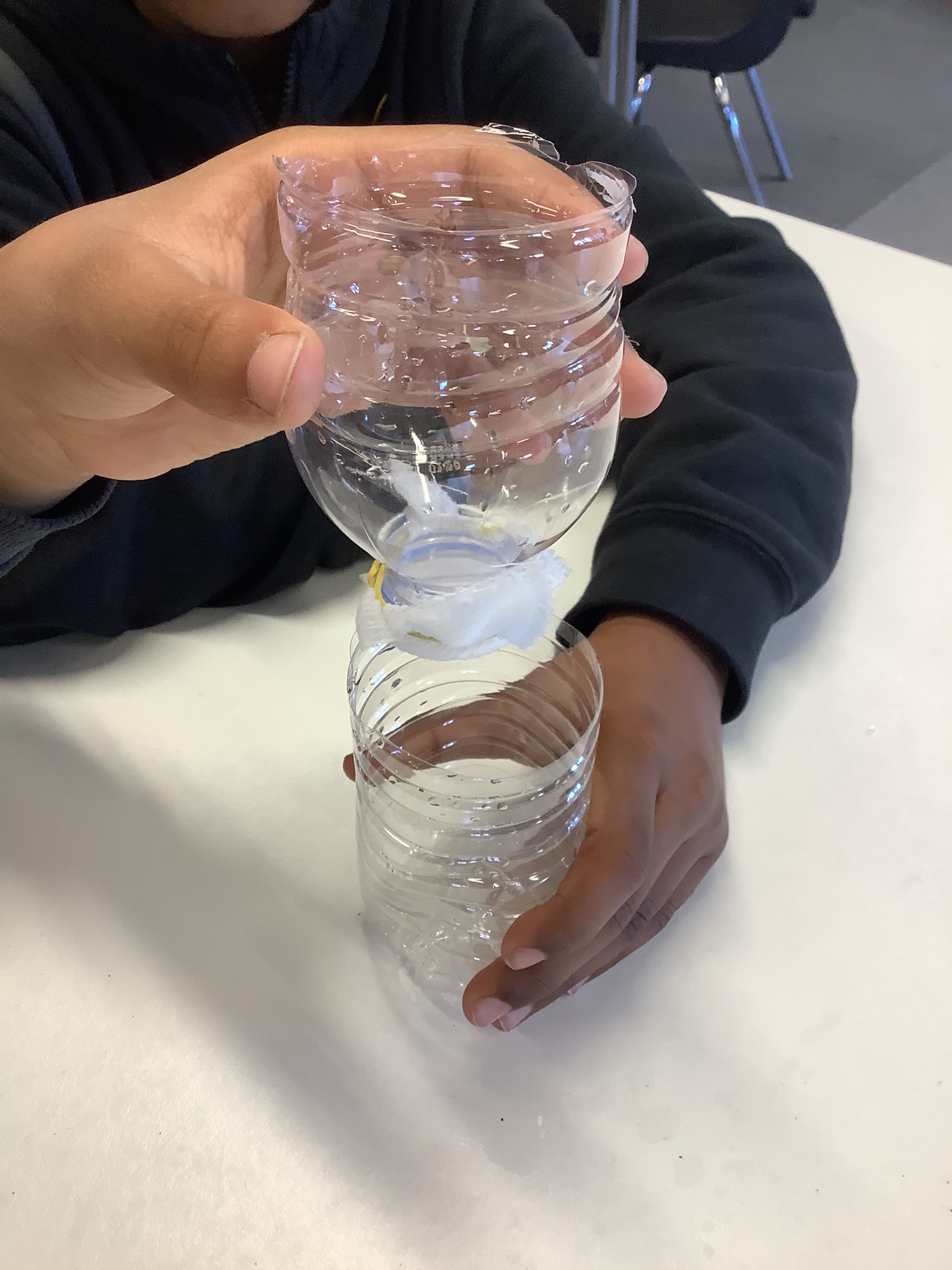 In class, we made our own water filters using plastic bottles, gauze, and different materials to help separate the soil and debris from muddy water. It was fascinating to see how some filters worked better than others depending on which materials we layered first! We discovered that the best filters had small-particle materials like sand or salt at the bottom, with larger materials like straw, lavender, and popcorn kernels at the top.