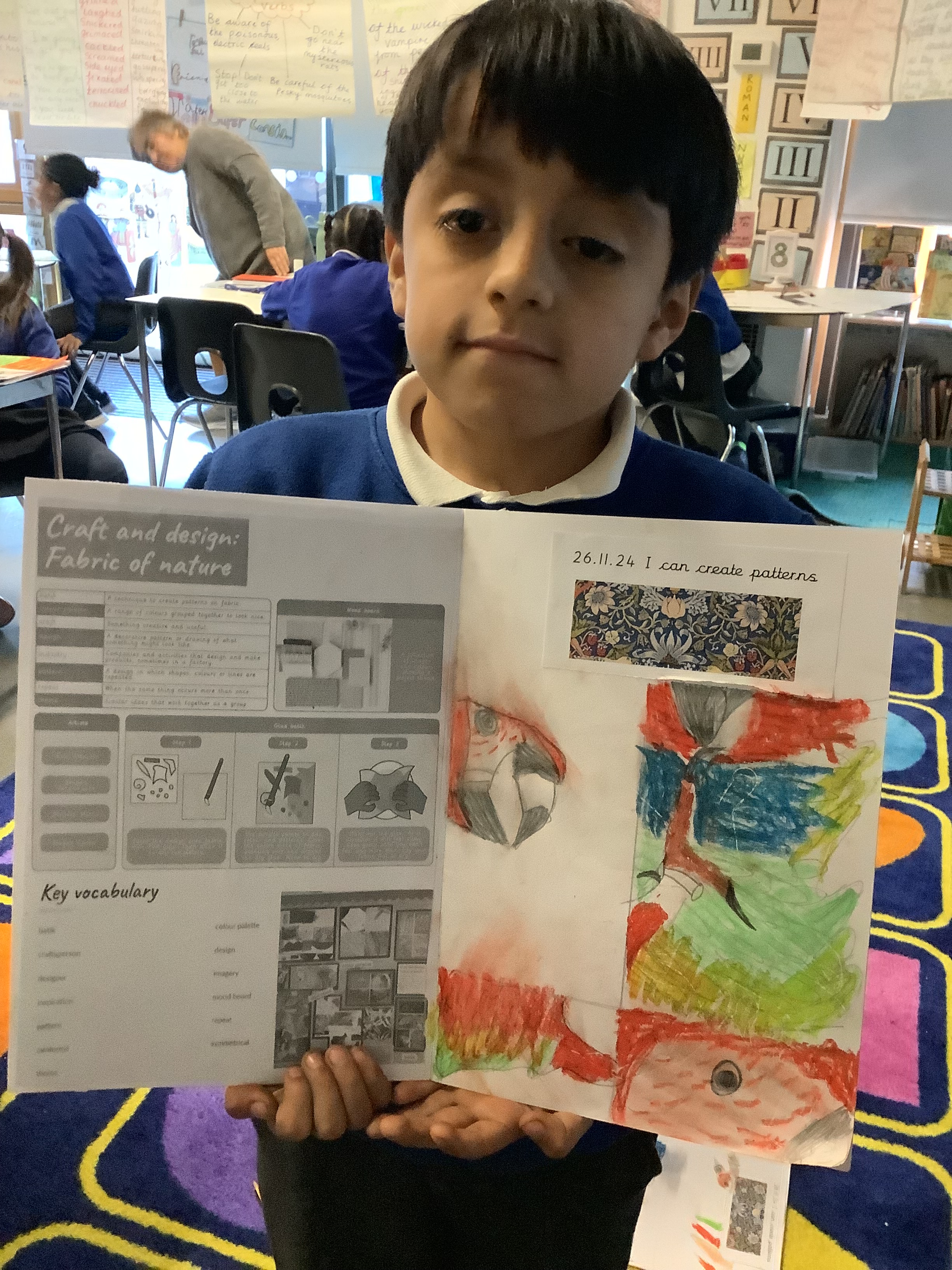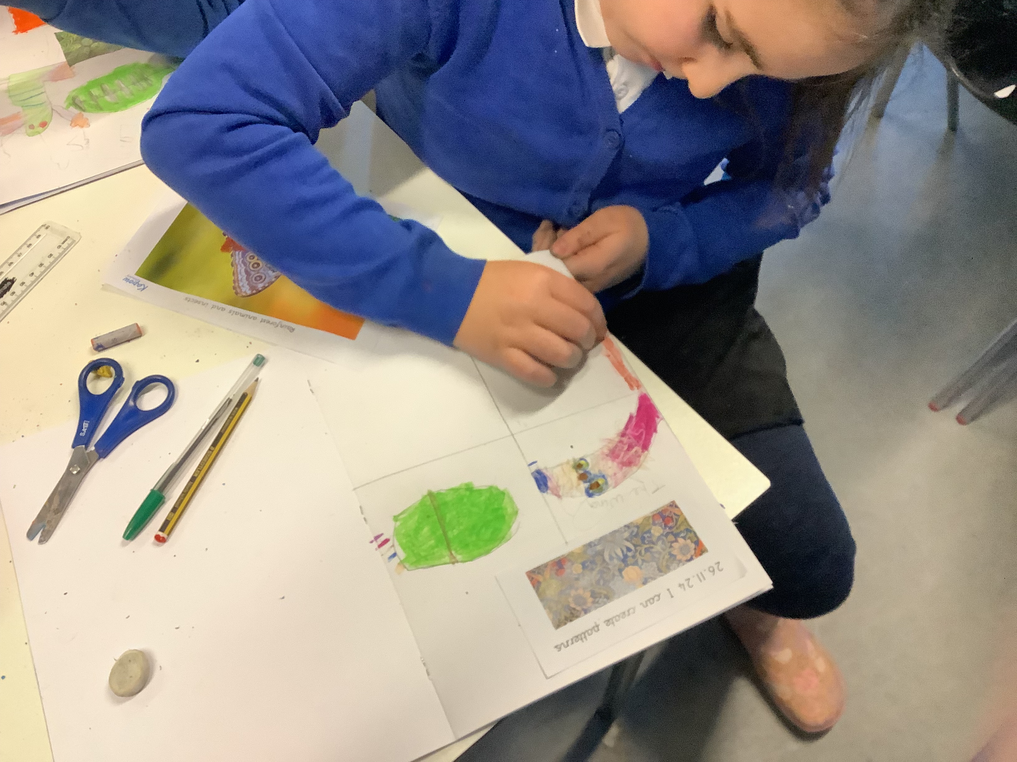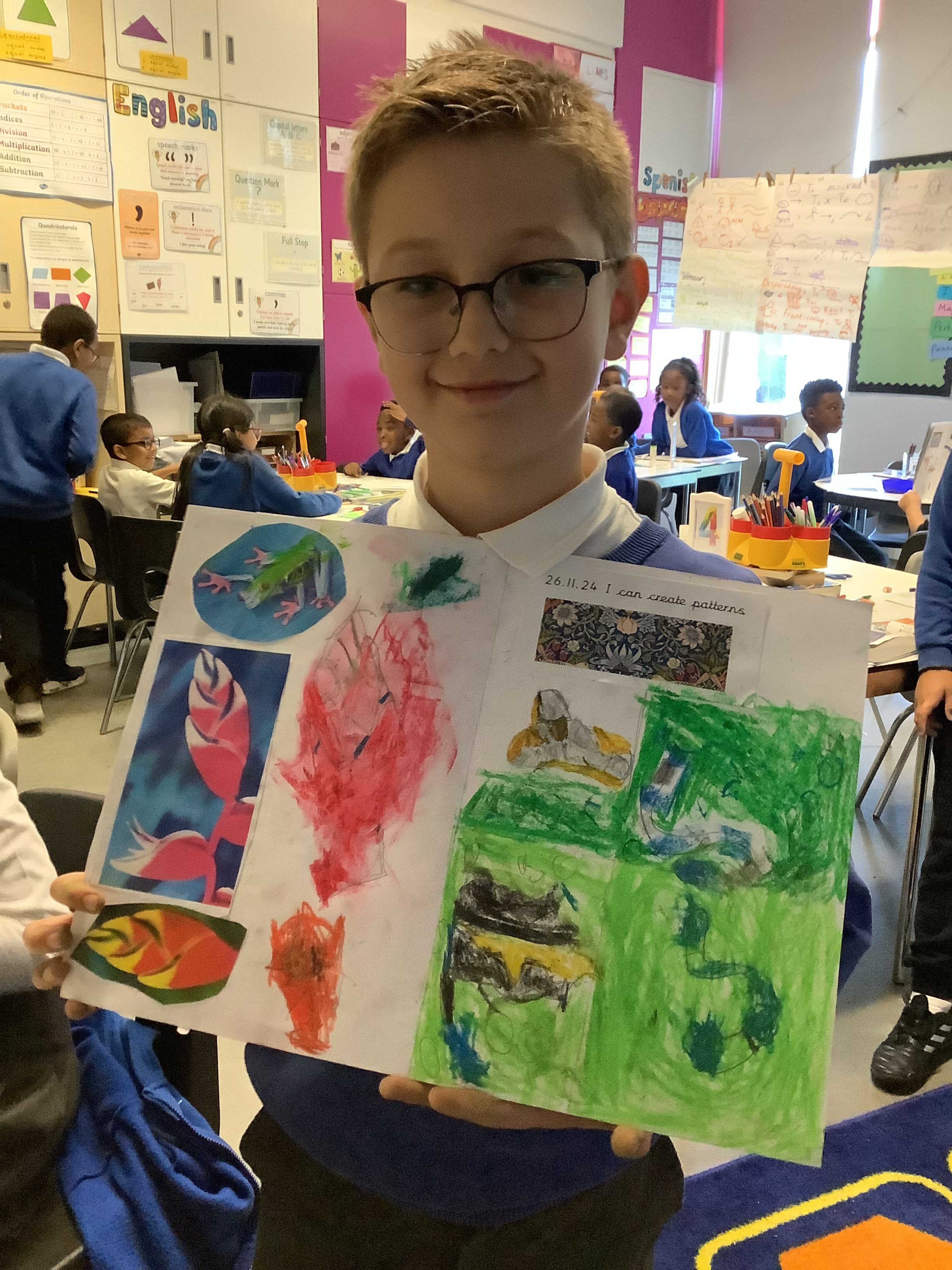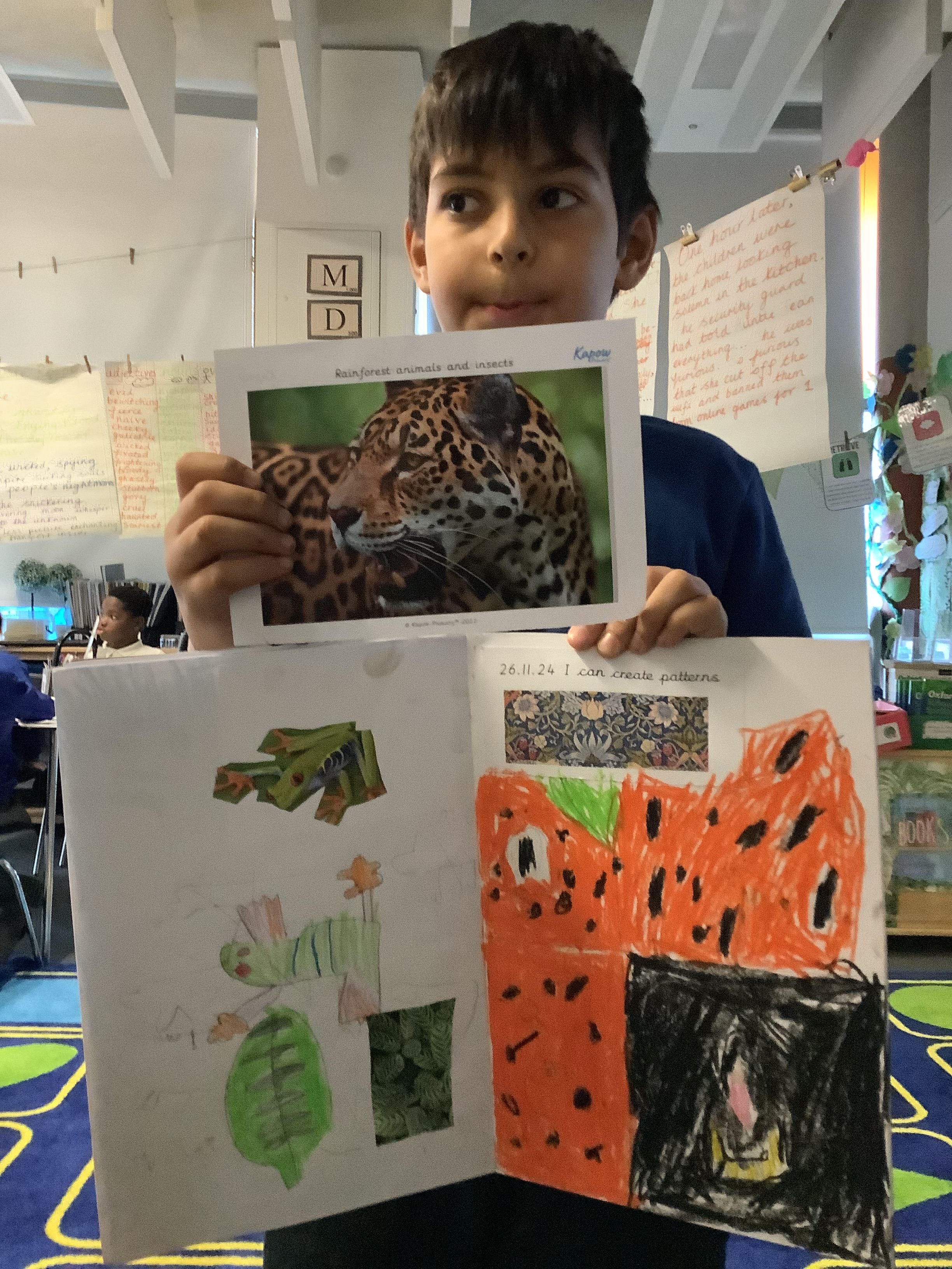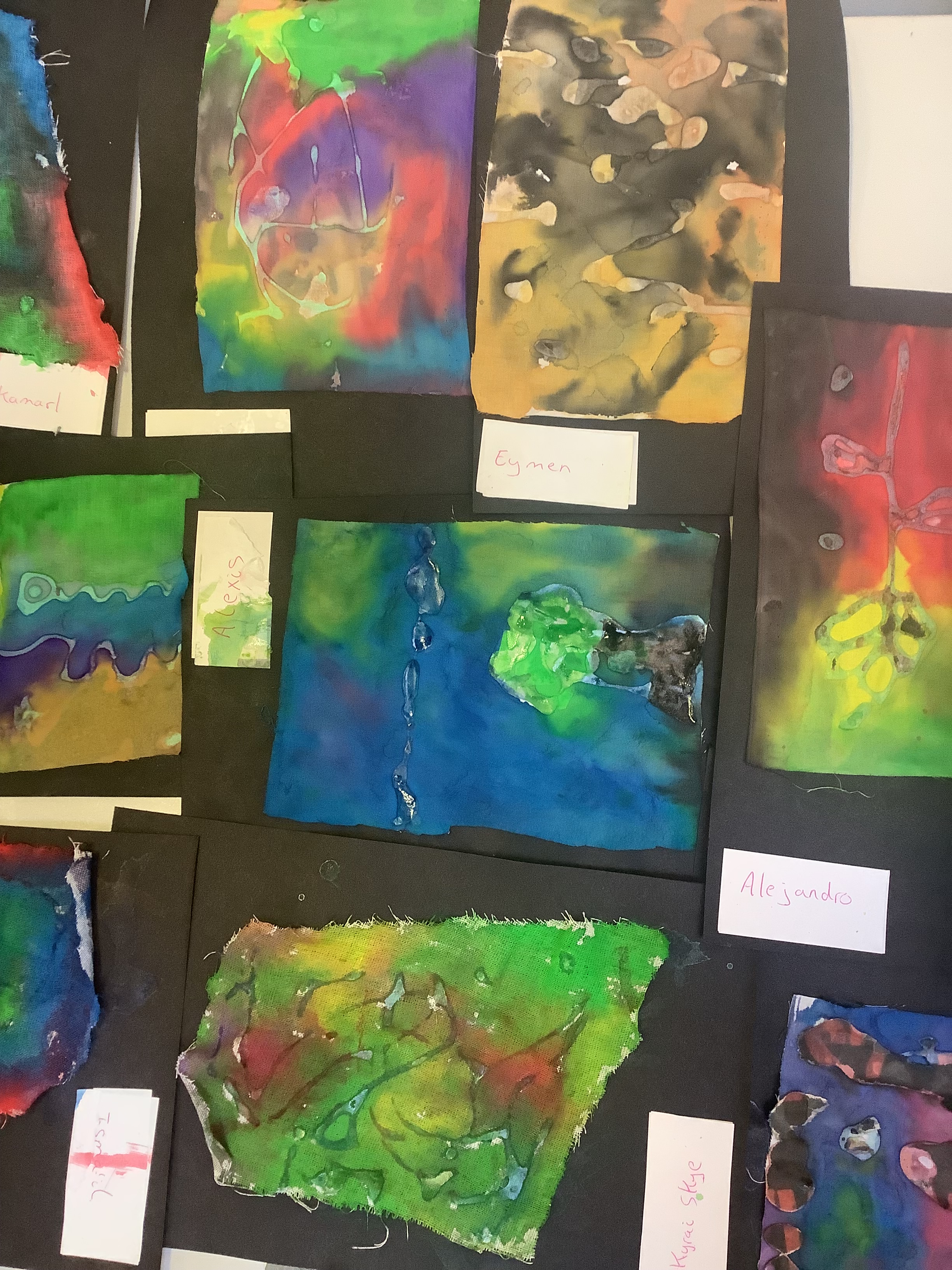 In Year 4, we’ve been having a lot of fun exploring the wonders of the rainforest through fabric art! We learned a fun technique called batik, where we use wax or glue and dye to create beautiful patterns on fabric.