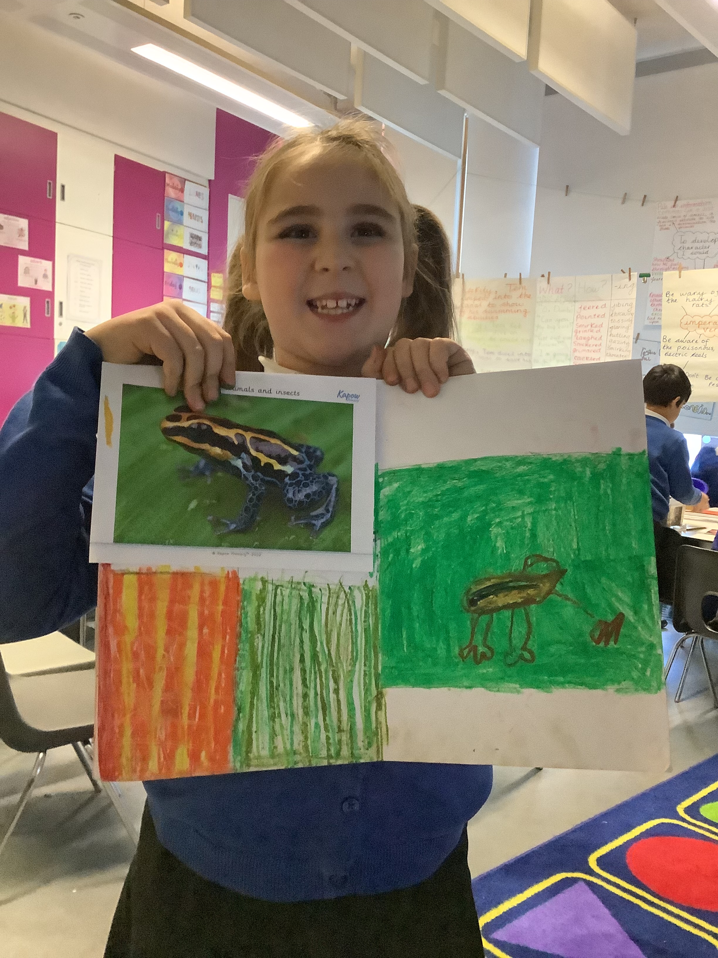 To start, we researched the rainforest and discovered all the amazing plants and animals that call it home. We were inspired by the bright colours, textures, and shapes we saw in our research.