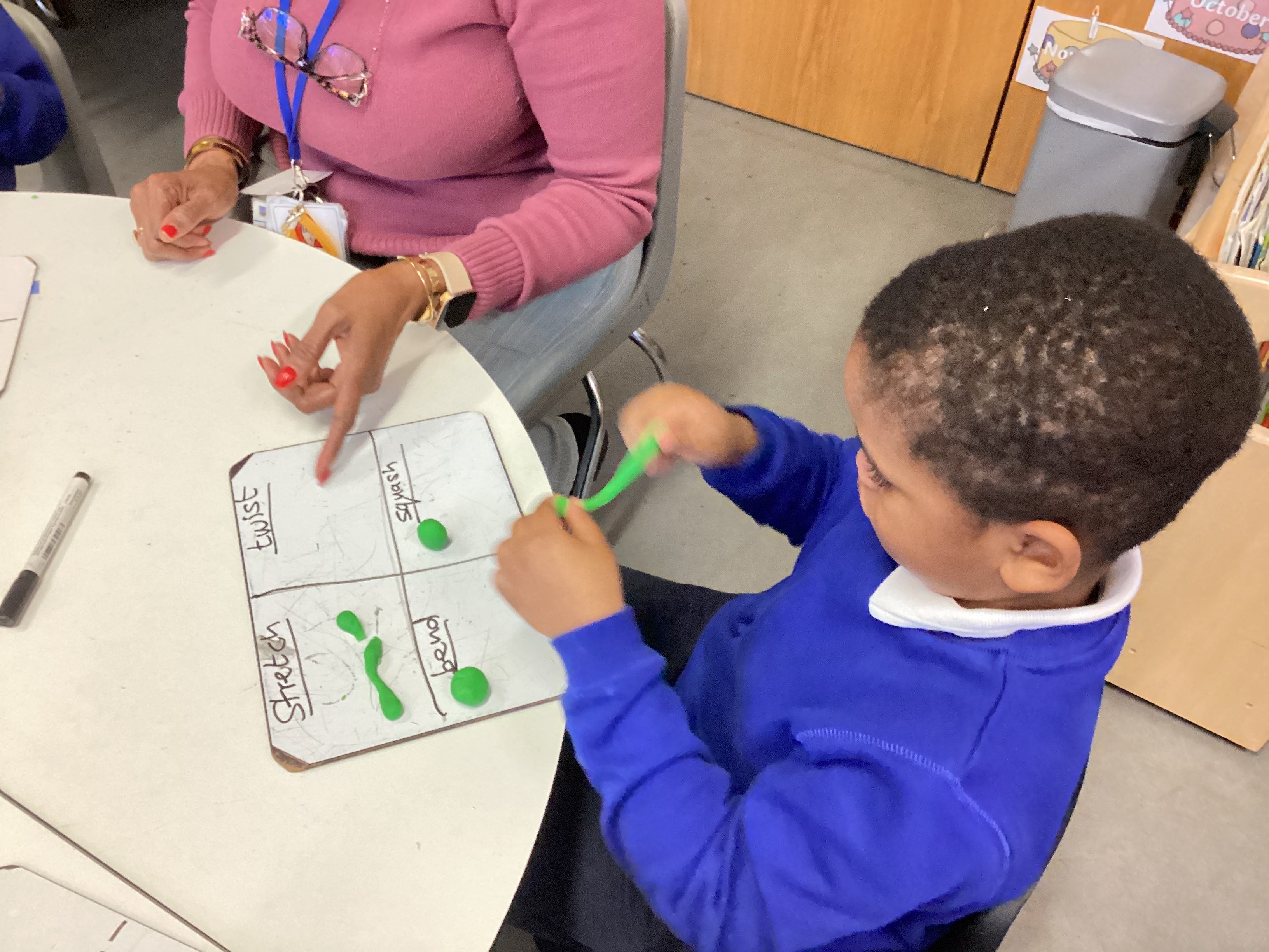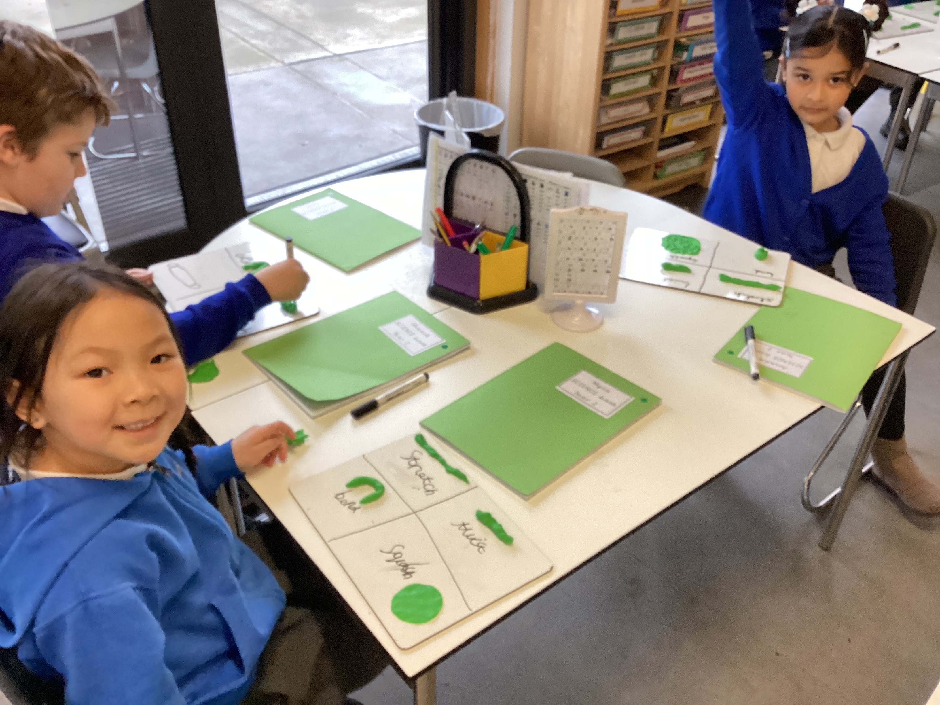 To start, we experimented with playdough, testing how we could change its shape using these actions. Then, we carried out the same tests on a range of materials and recorded our results in a table.
