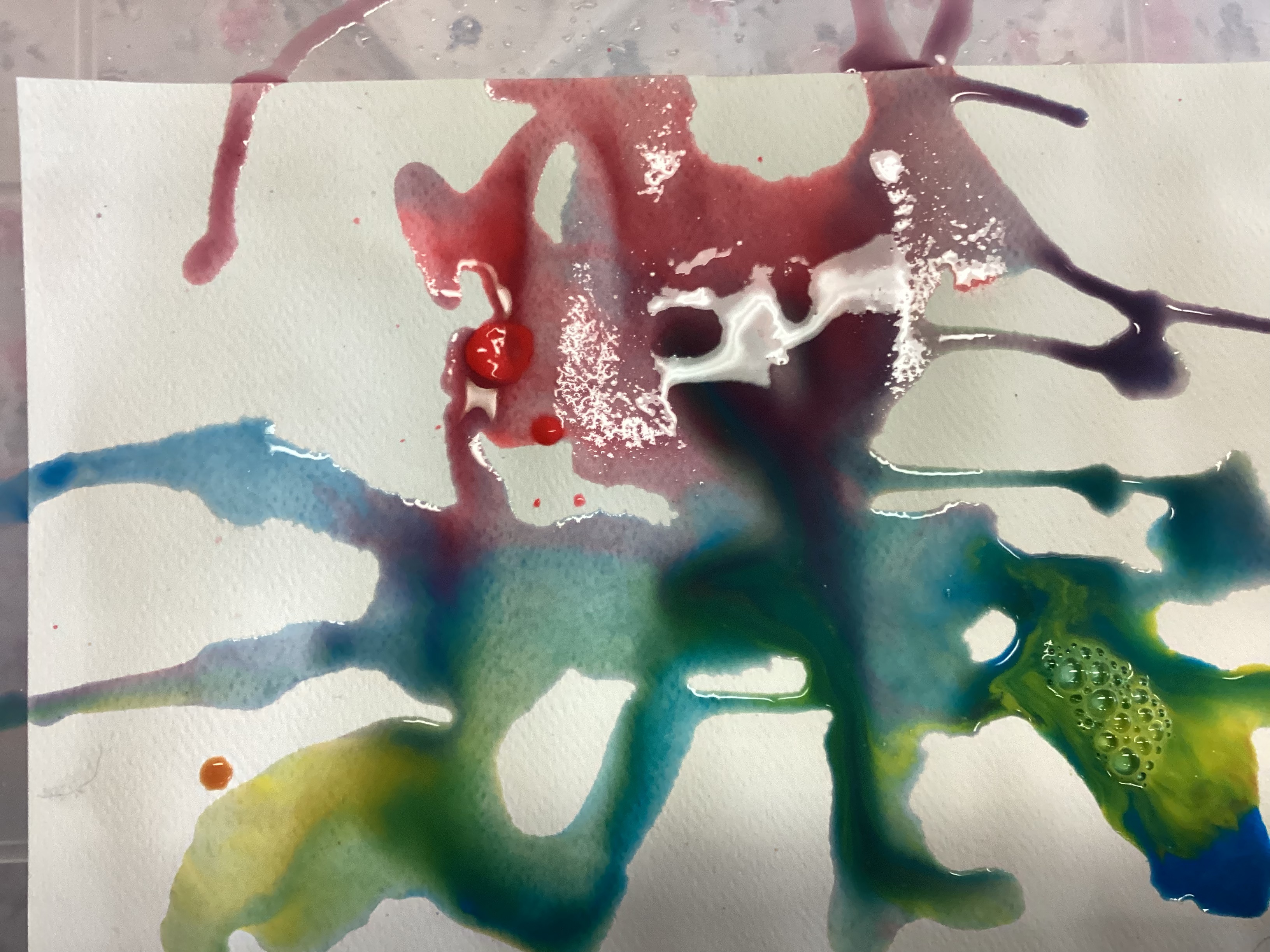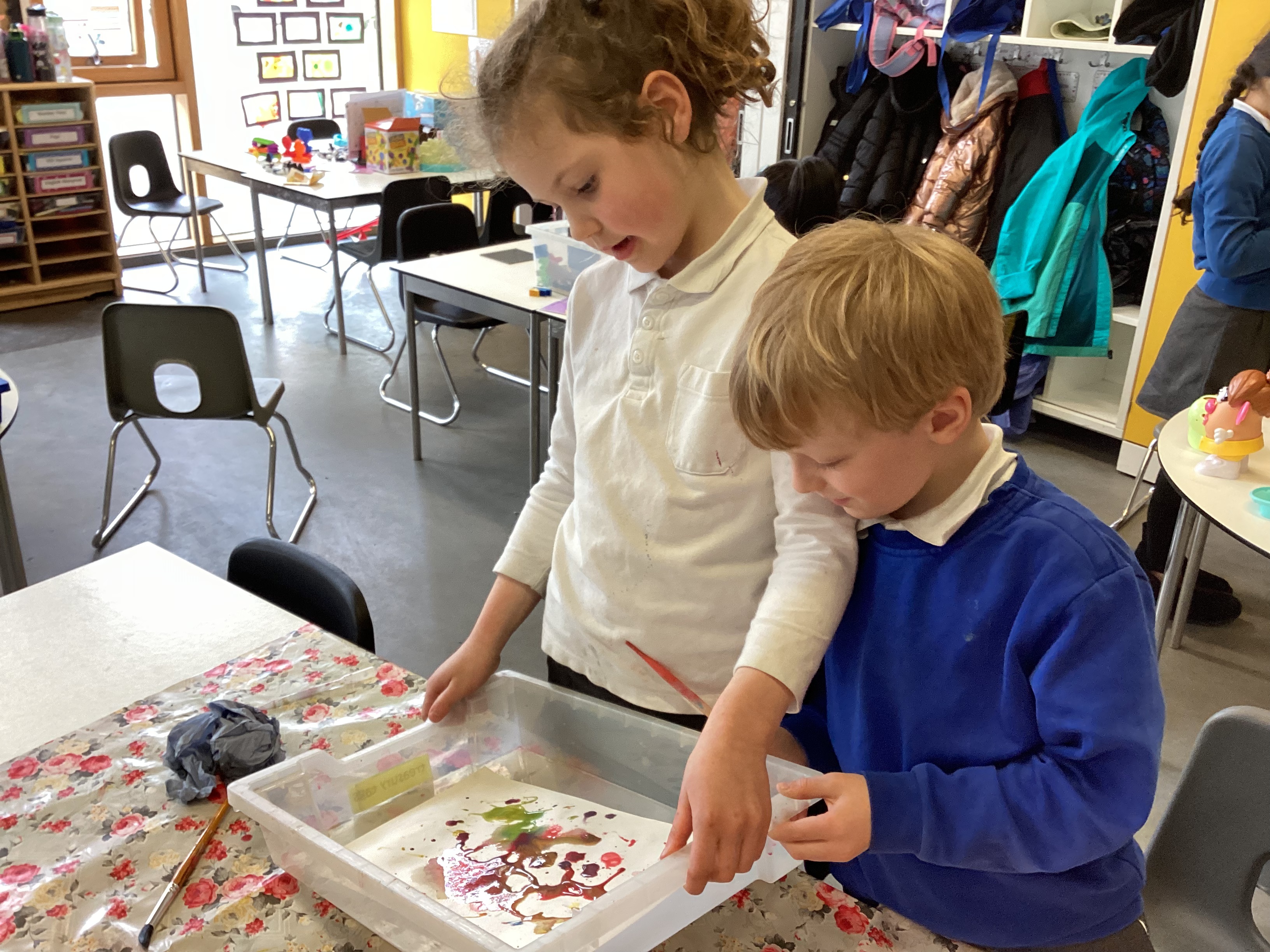 Using watery primary colours on wet paper, we tilted our trays and watched as the colours blended and swirled together. It was exciting to see new secondary colours appear before our eyes!