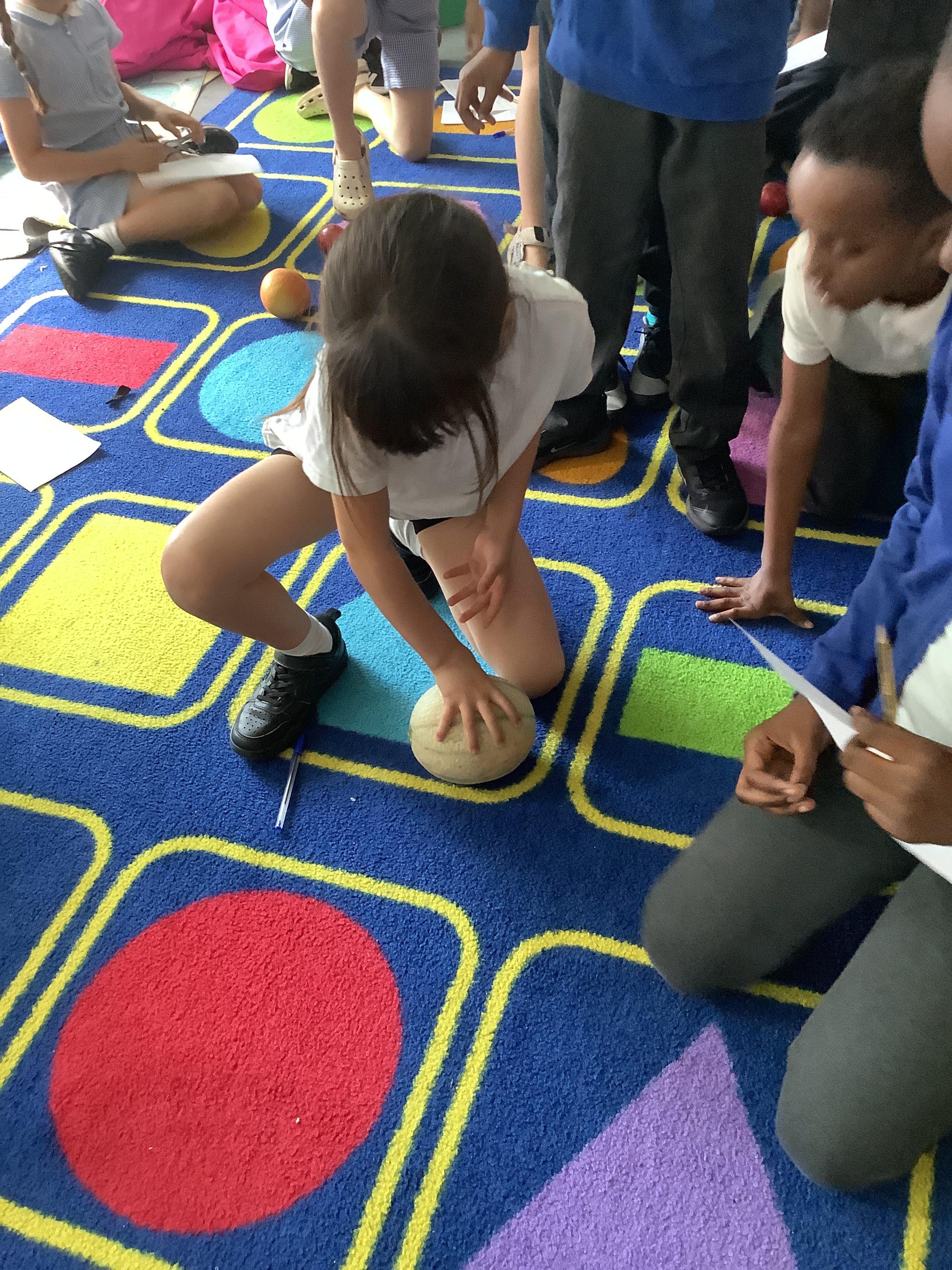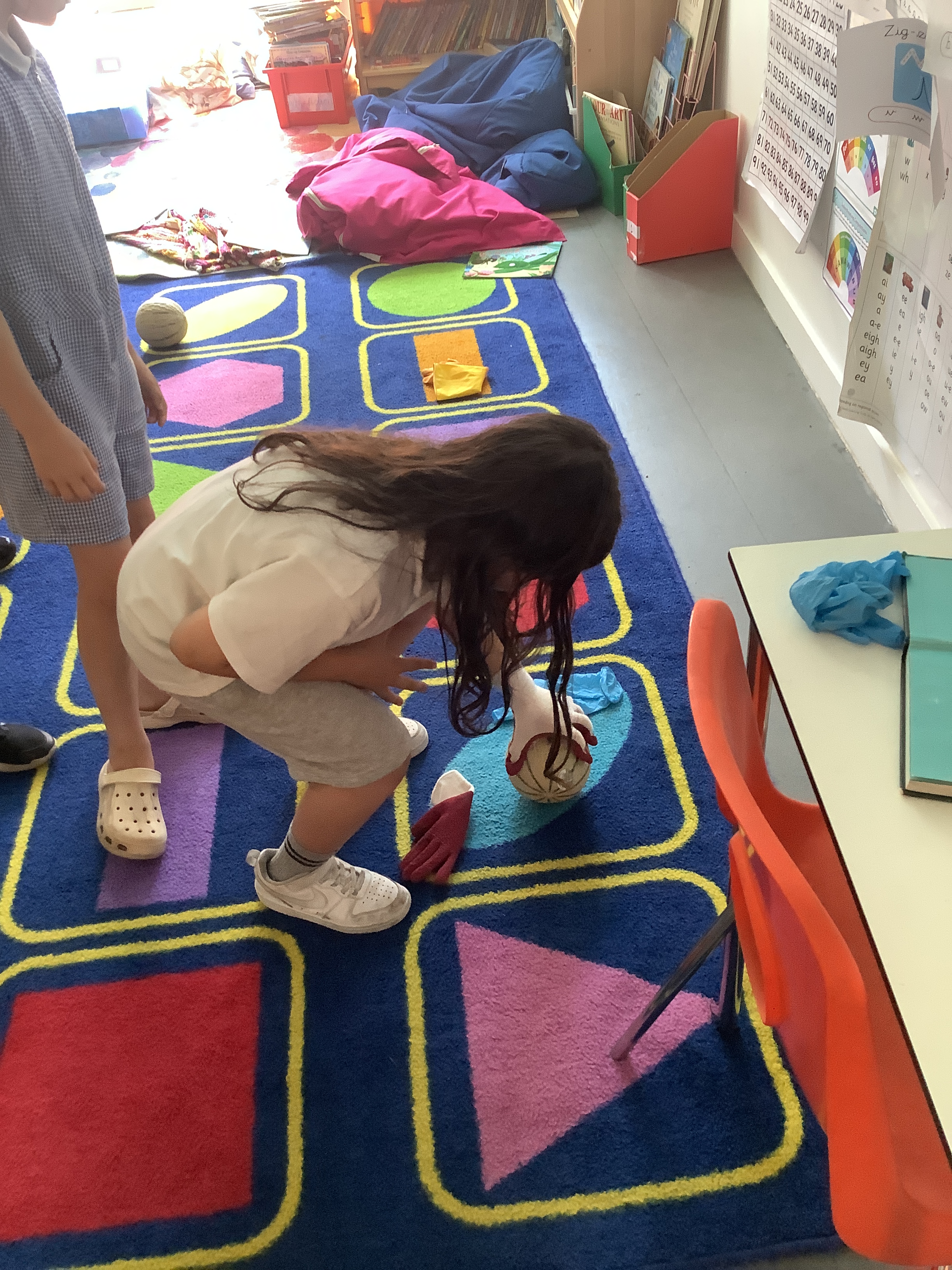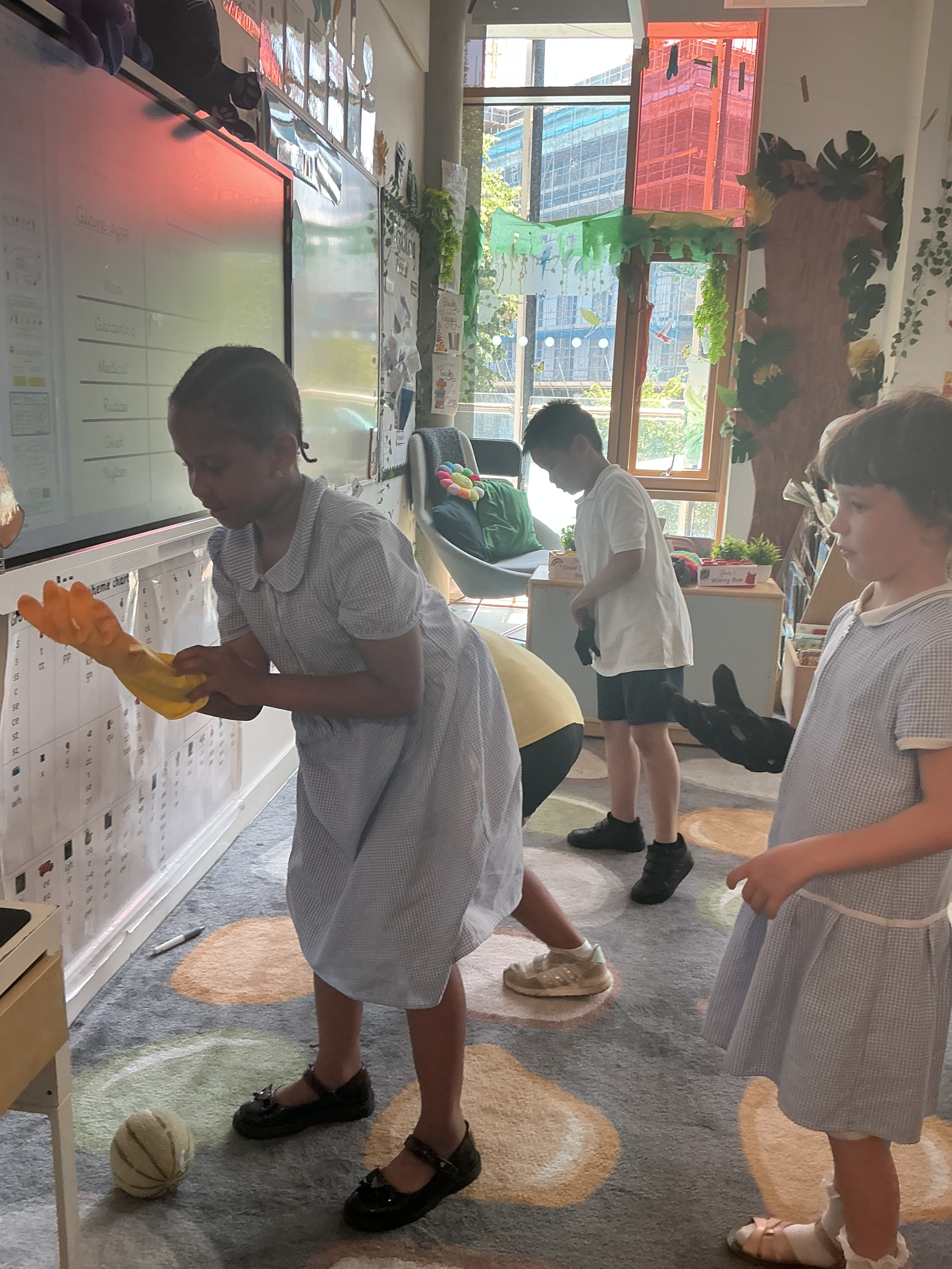 The following week we took our investigation further: Would gloves help or hinder our grip? We experimented with gloves of varying materials including gardening gloves, rubber gloves, medical gloves and woolen gloves. We even had a go with oven gloves! We determined that certain types of glove are rougher and therefore increase friction. Many children were able to lift the cantaloupe when they hadn’t been able to with their bare hands! We did have some near misses with melons on the carpet when they tried with the very smooth oven gloves, however…