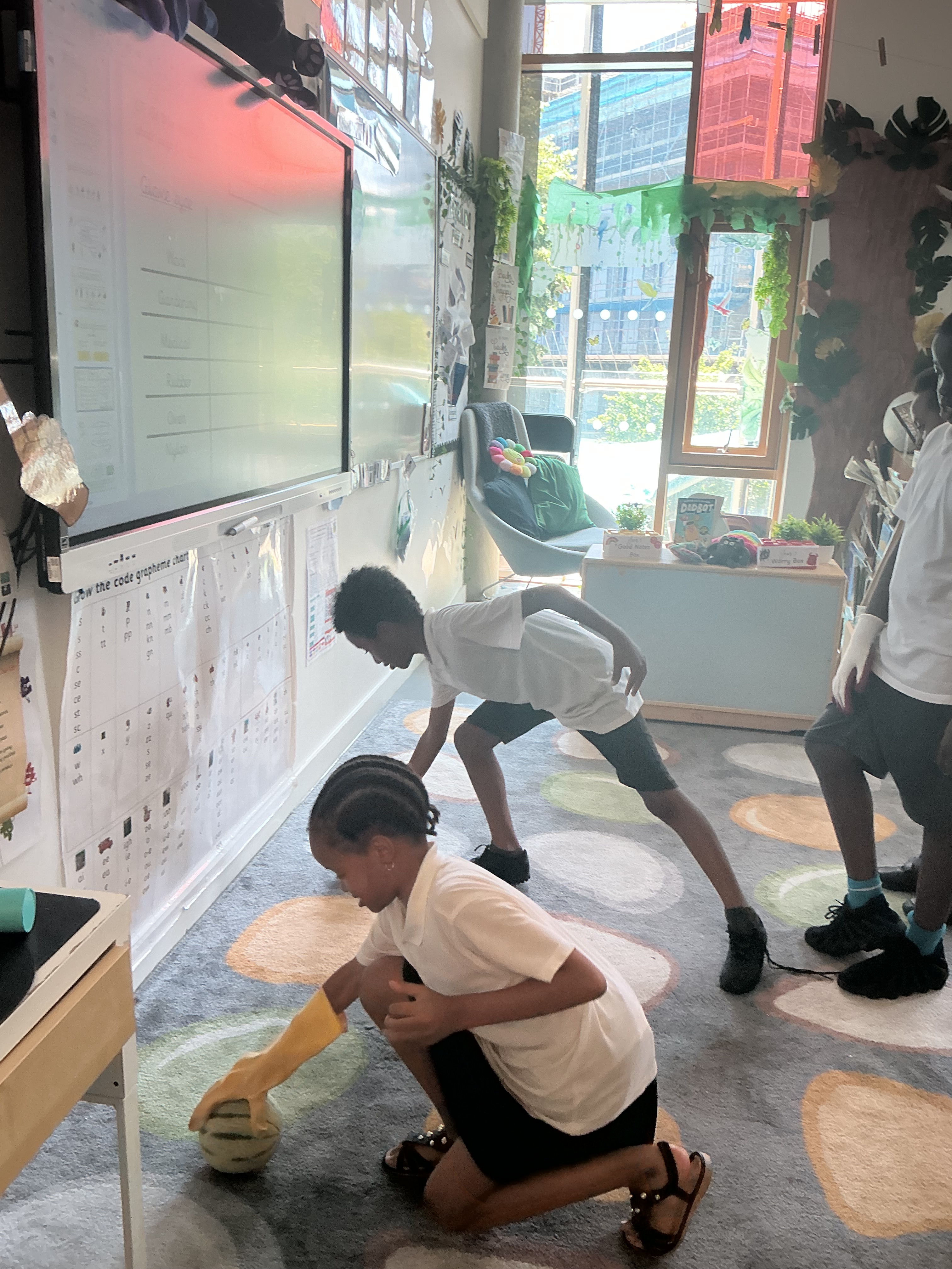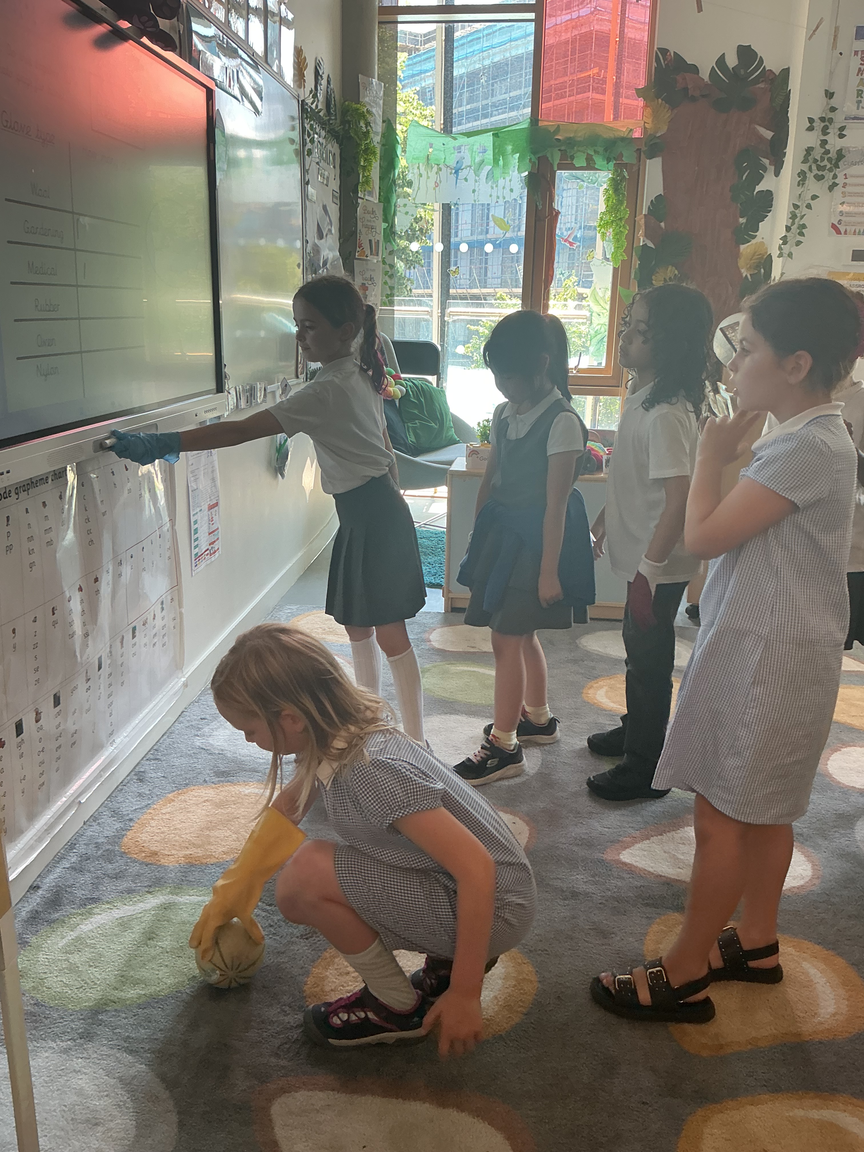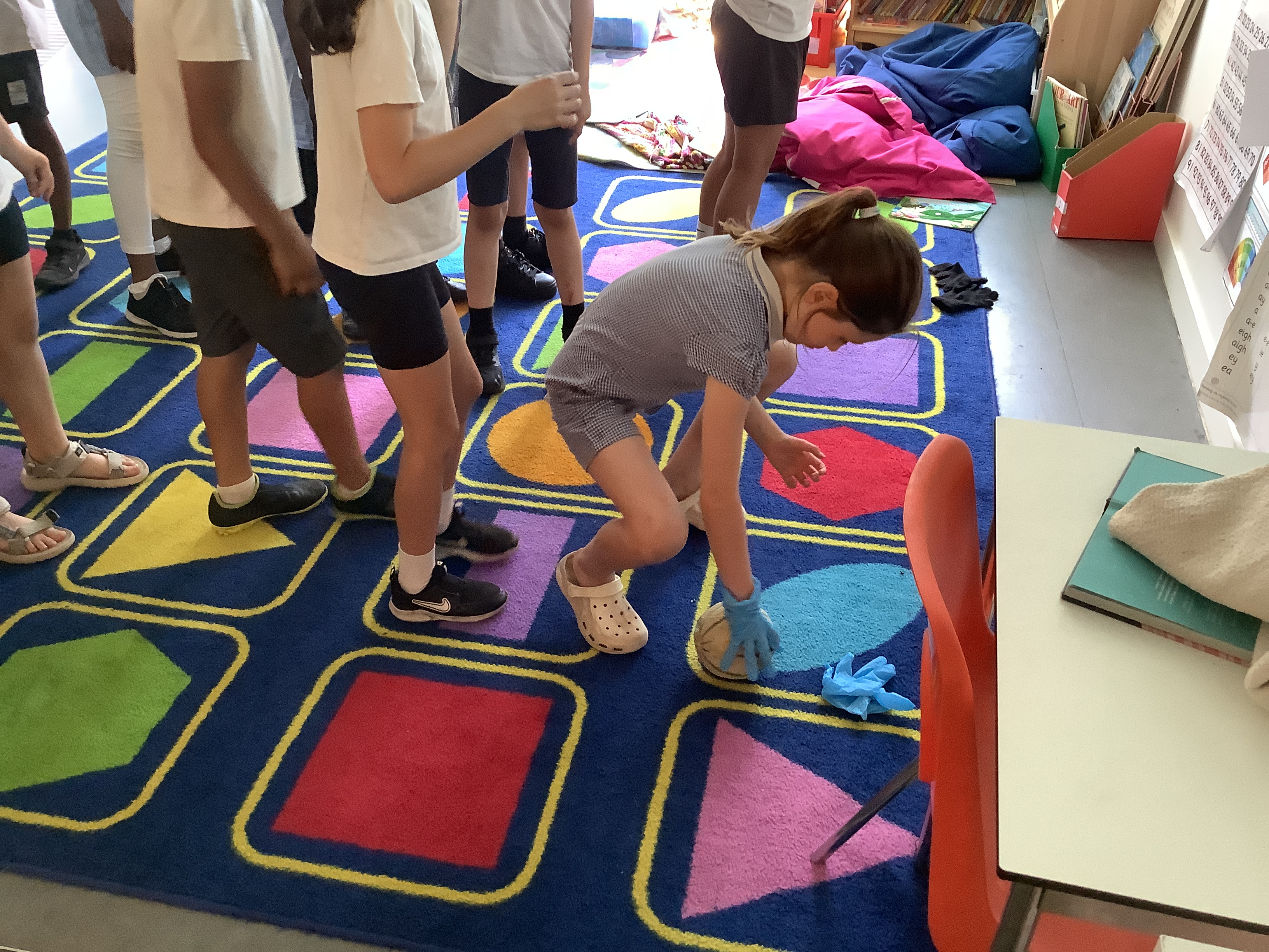 The following week we took our investigation further: Would gloves help or hinder our grip? We experimented with gloves of varying materials including gardening gloves, rubber gloves, medical gloves and woolen gloves. We even had a go with oven gloves! We determined that certain types of glove are rougher and therefore increase friction. Many children were able to lift the cantaloupe when they hadn’t been able to with their bare hands! We did have some near misses with melons on the carpet when they tried with the very smooth oven gloves, however…