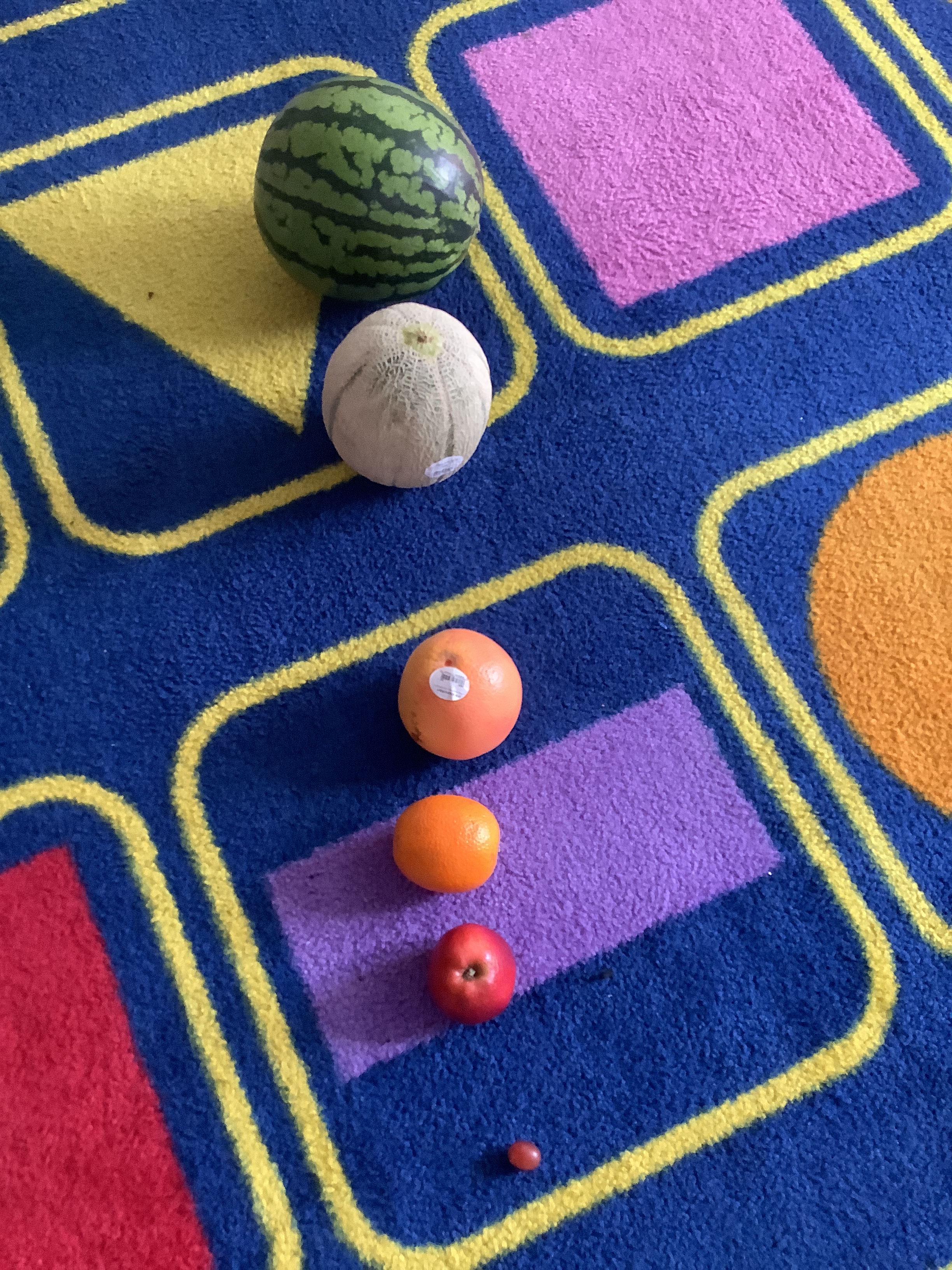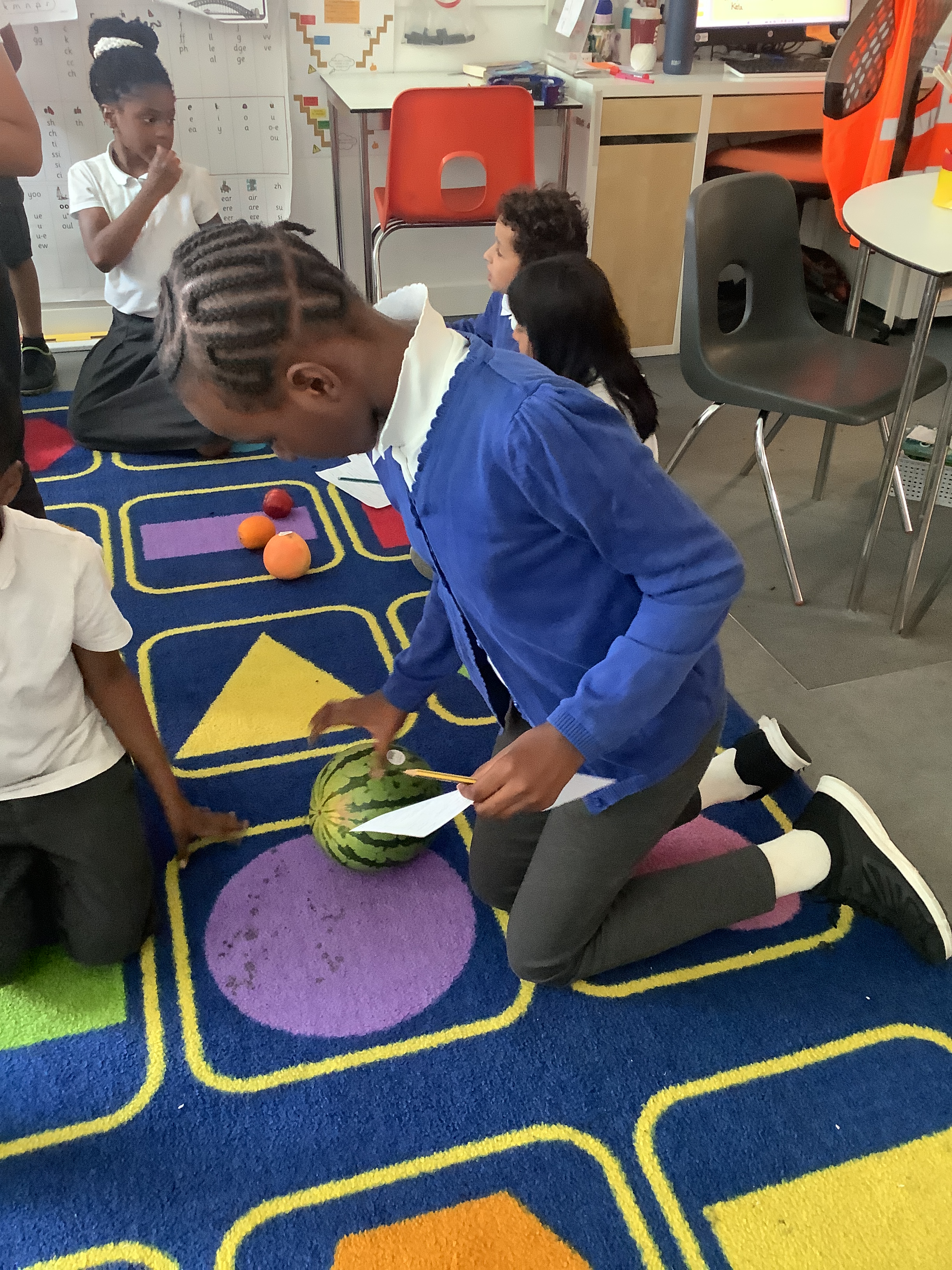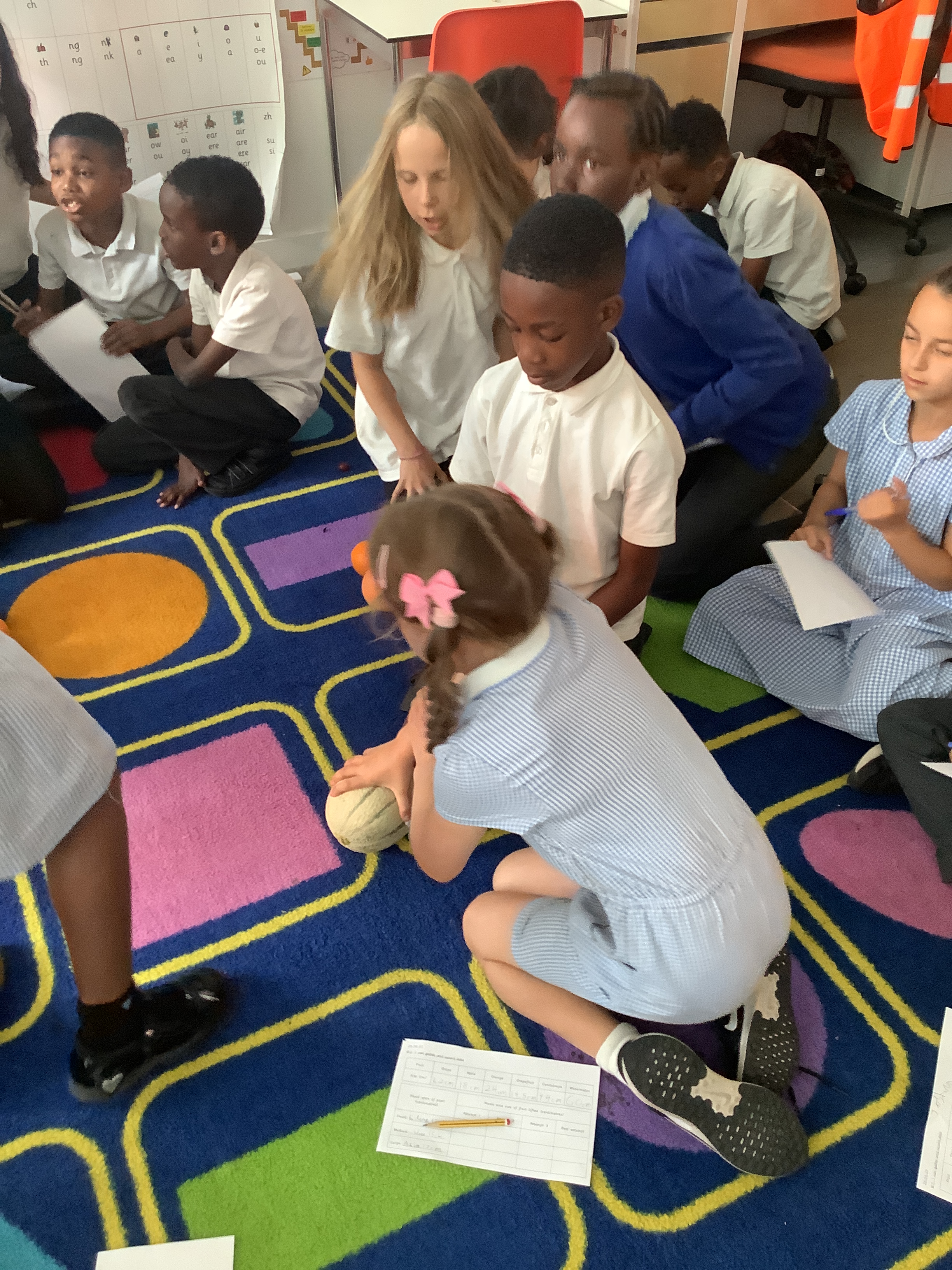 We started by measuring the children’s hand spans and separating them into groups based on size. We then did an experiment where the children attempted to lift fruit of increasing size in order to see which was the largest fruit they could successfully lift from above, in one hand, for 3 seconds. We discovered that indeed, there is a relationship! The children had predicted that those with larger hand spans would be able to lift the larger fruit – in our case, the cantaloupe – because larger hand spans would provide more points of contact, therefore more friction between the surfaces. Our prediction turned out to be correct!