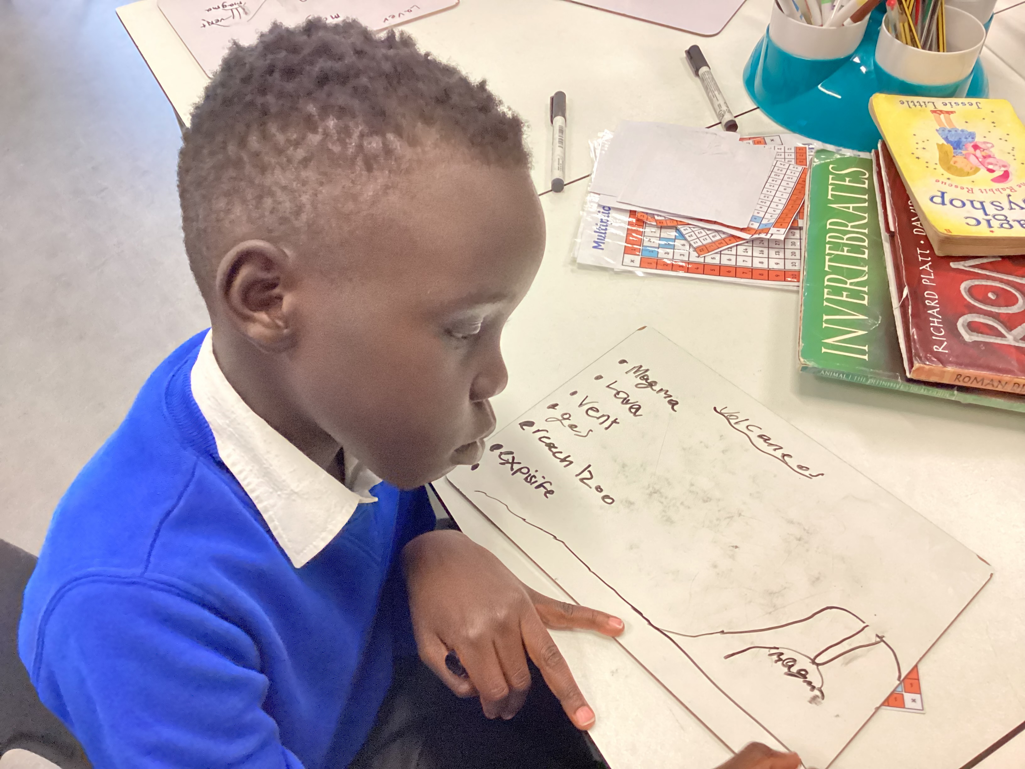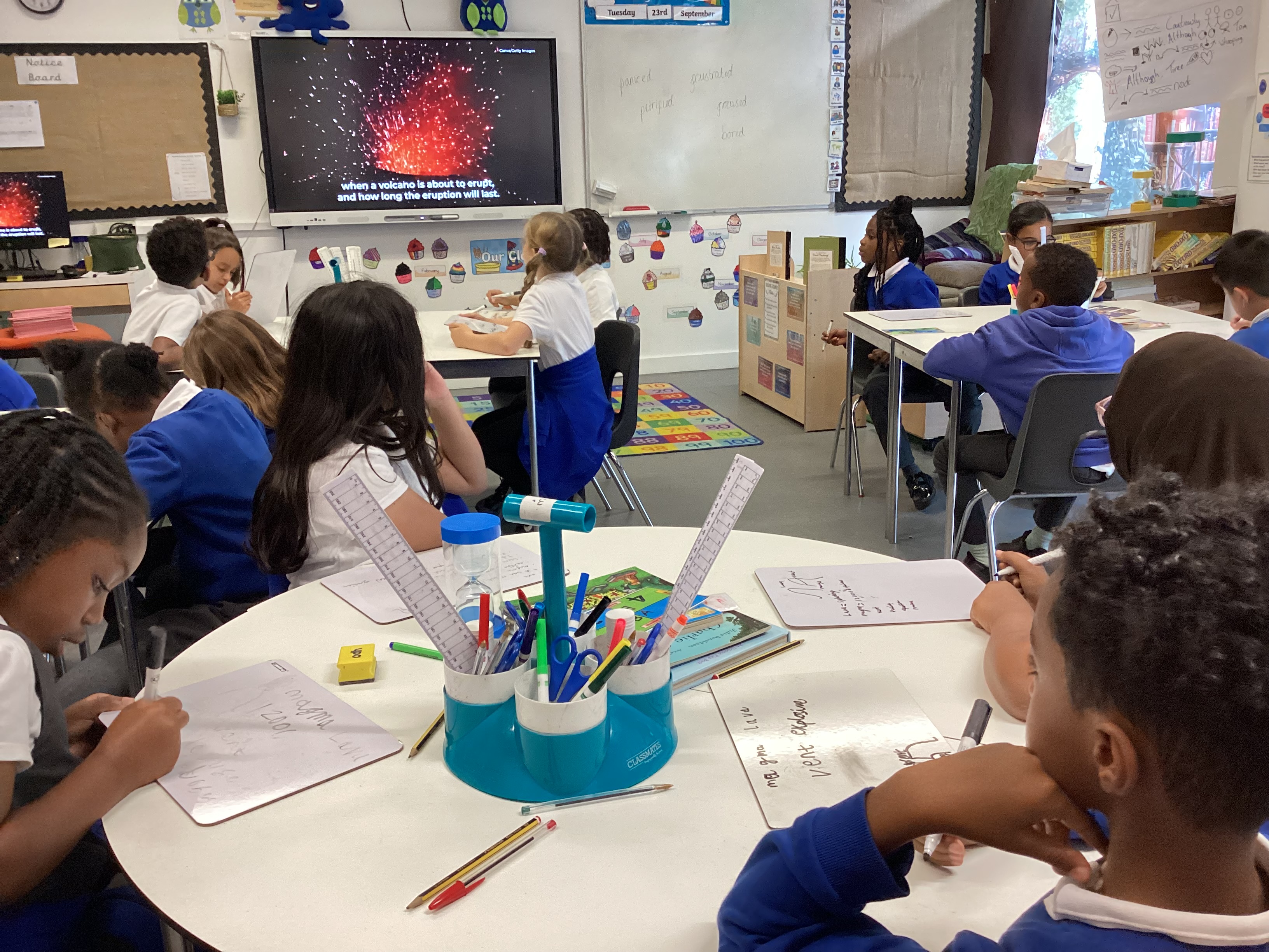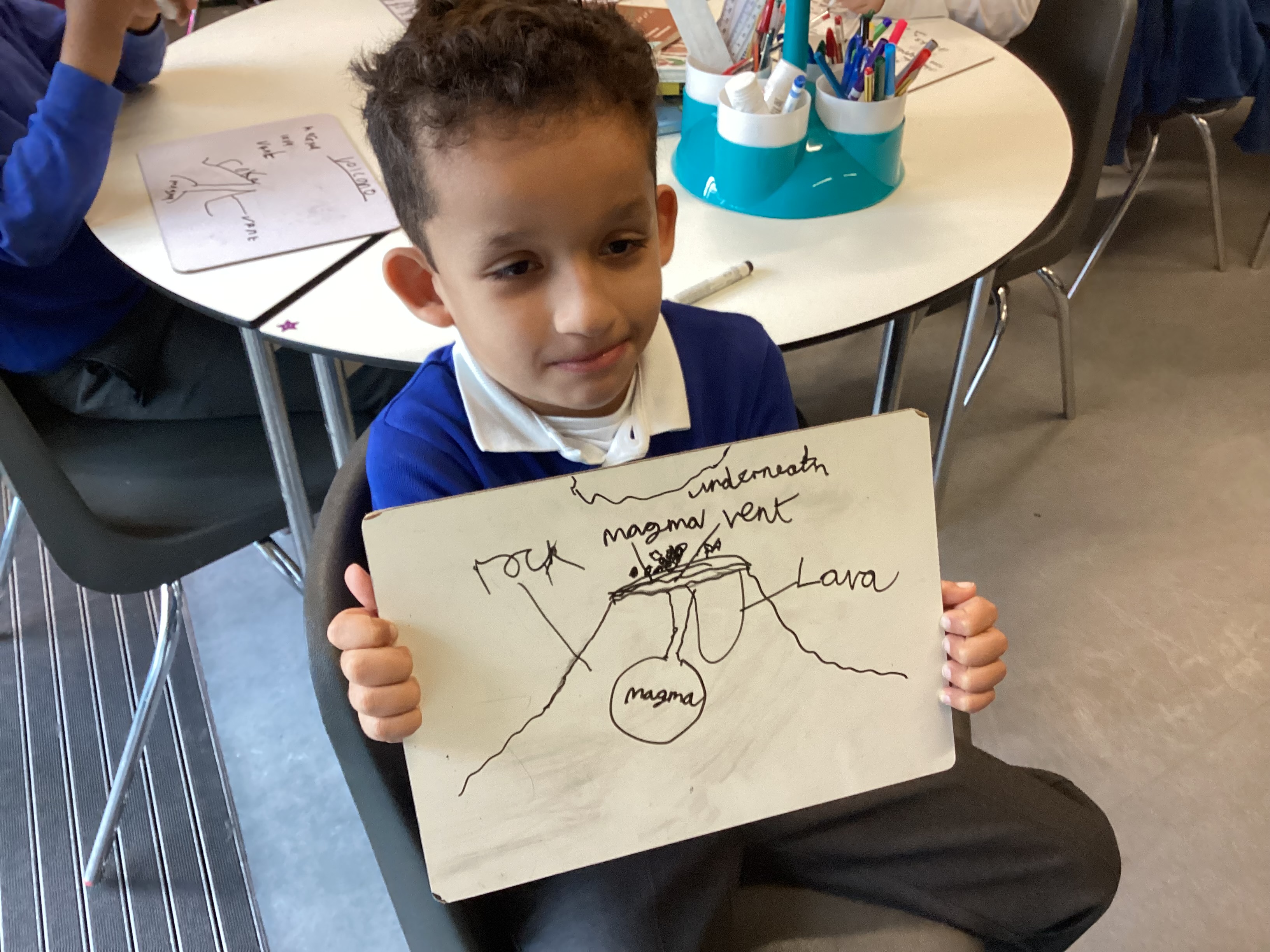 In this lesson, the children worked together to jot down key facts about volcanoes, before labelling the different parts in their diagrams. There was lots of fantastic discussion as they pieced together their knowledge and built a clear picture.