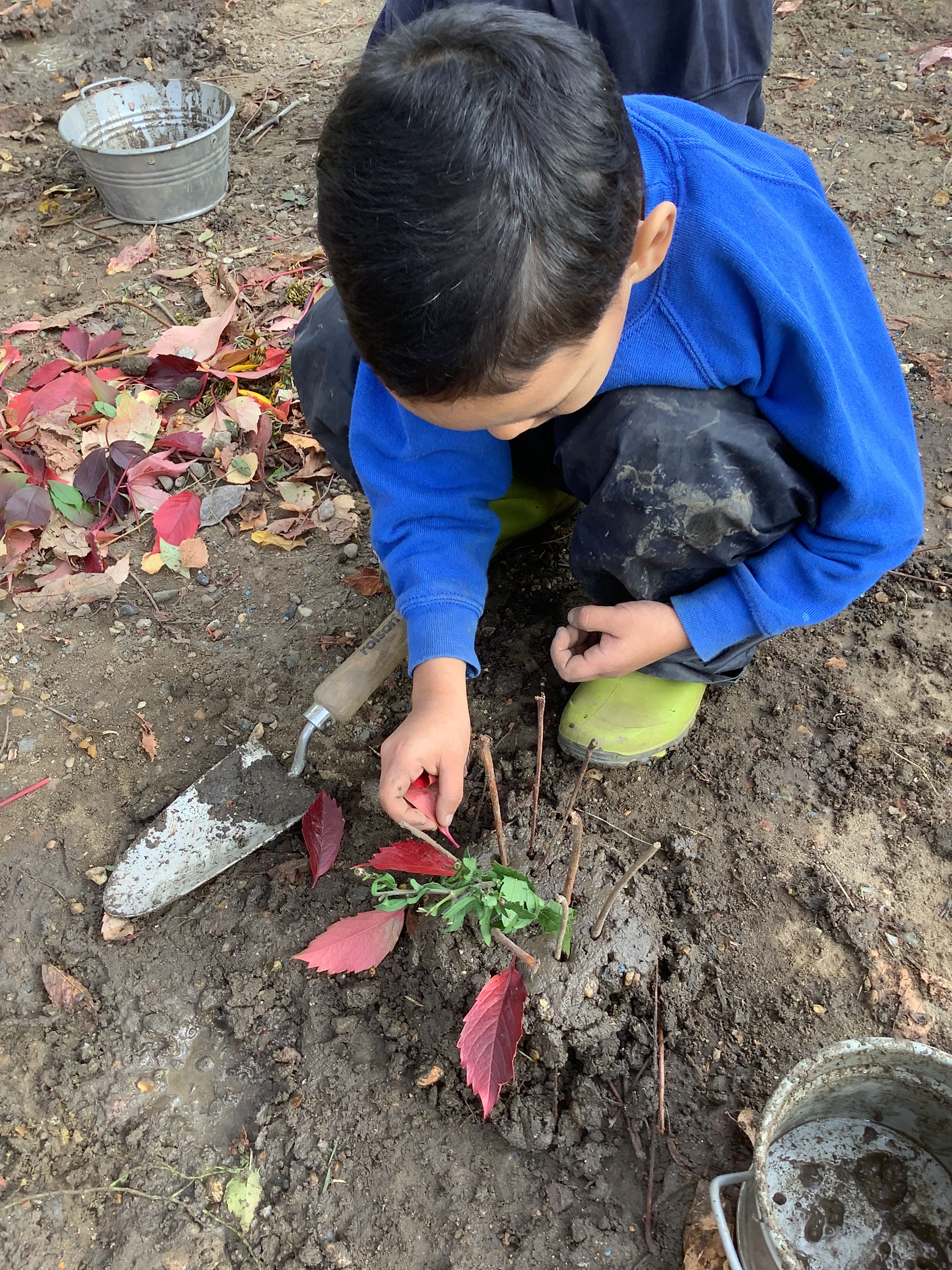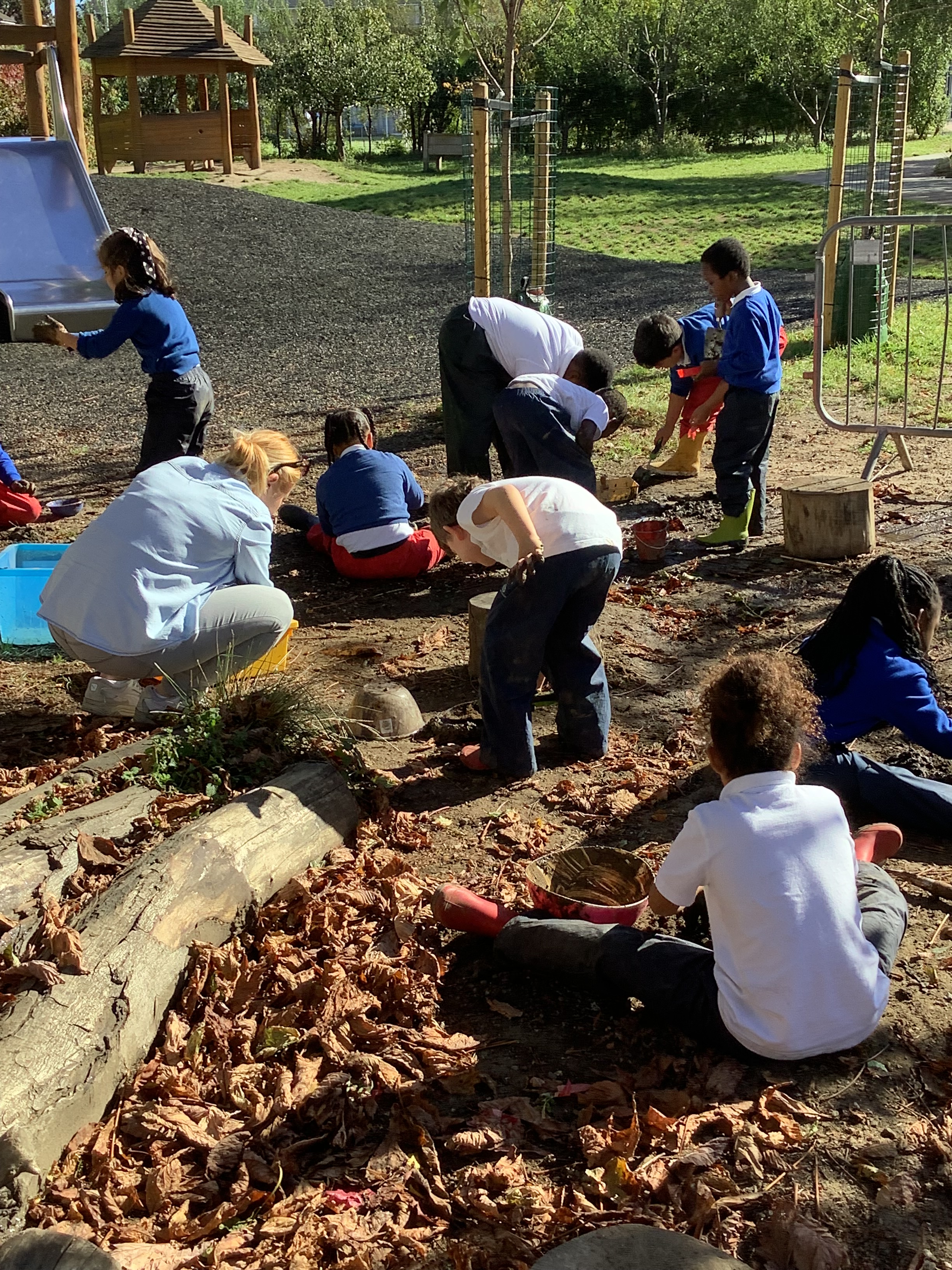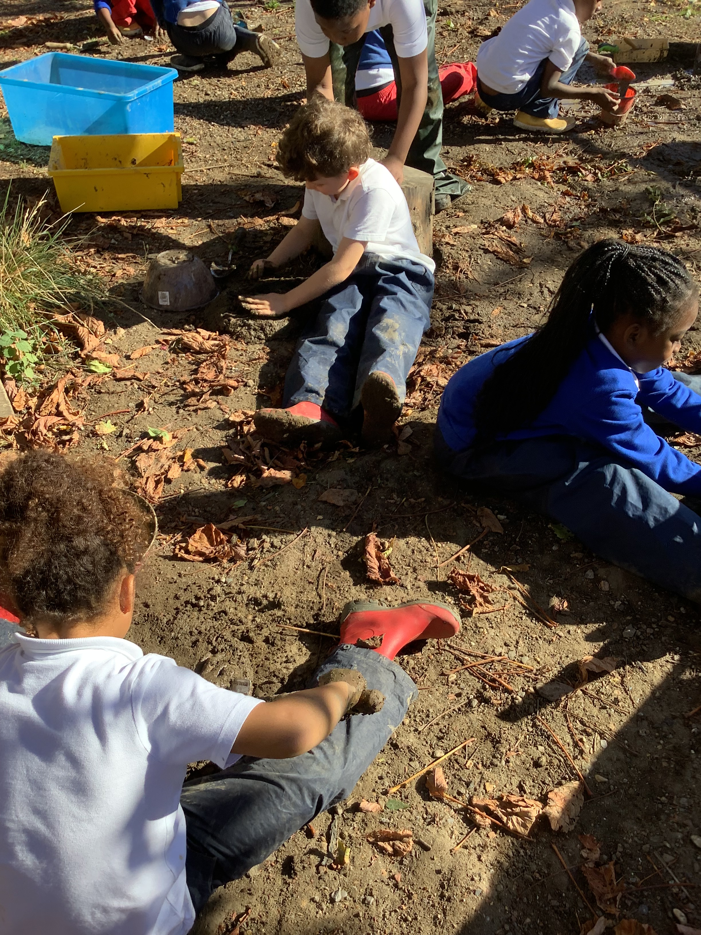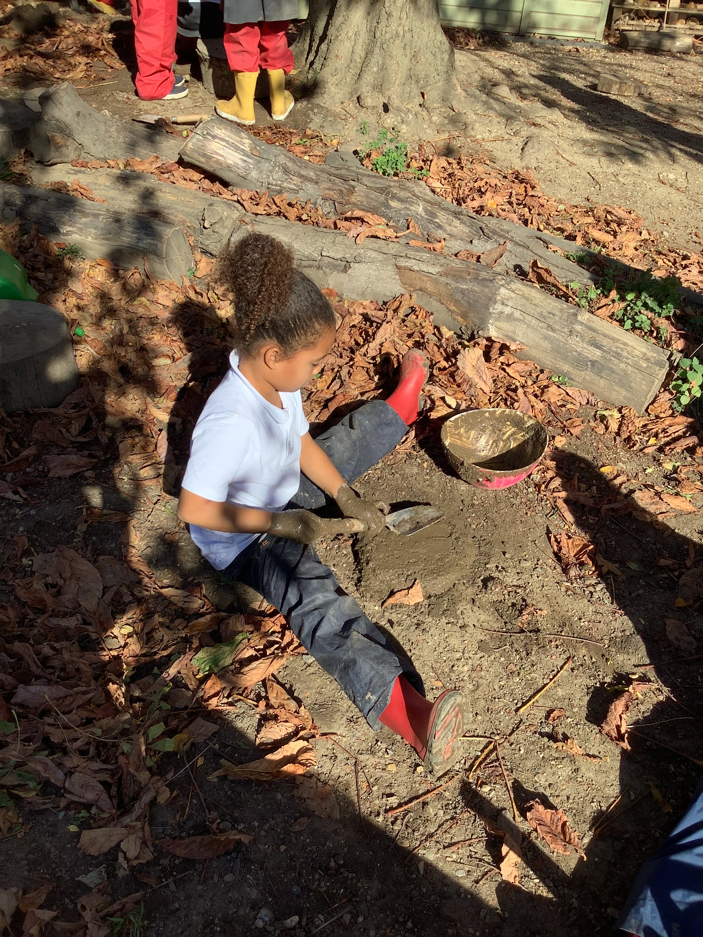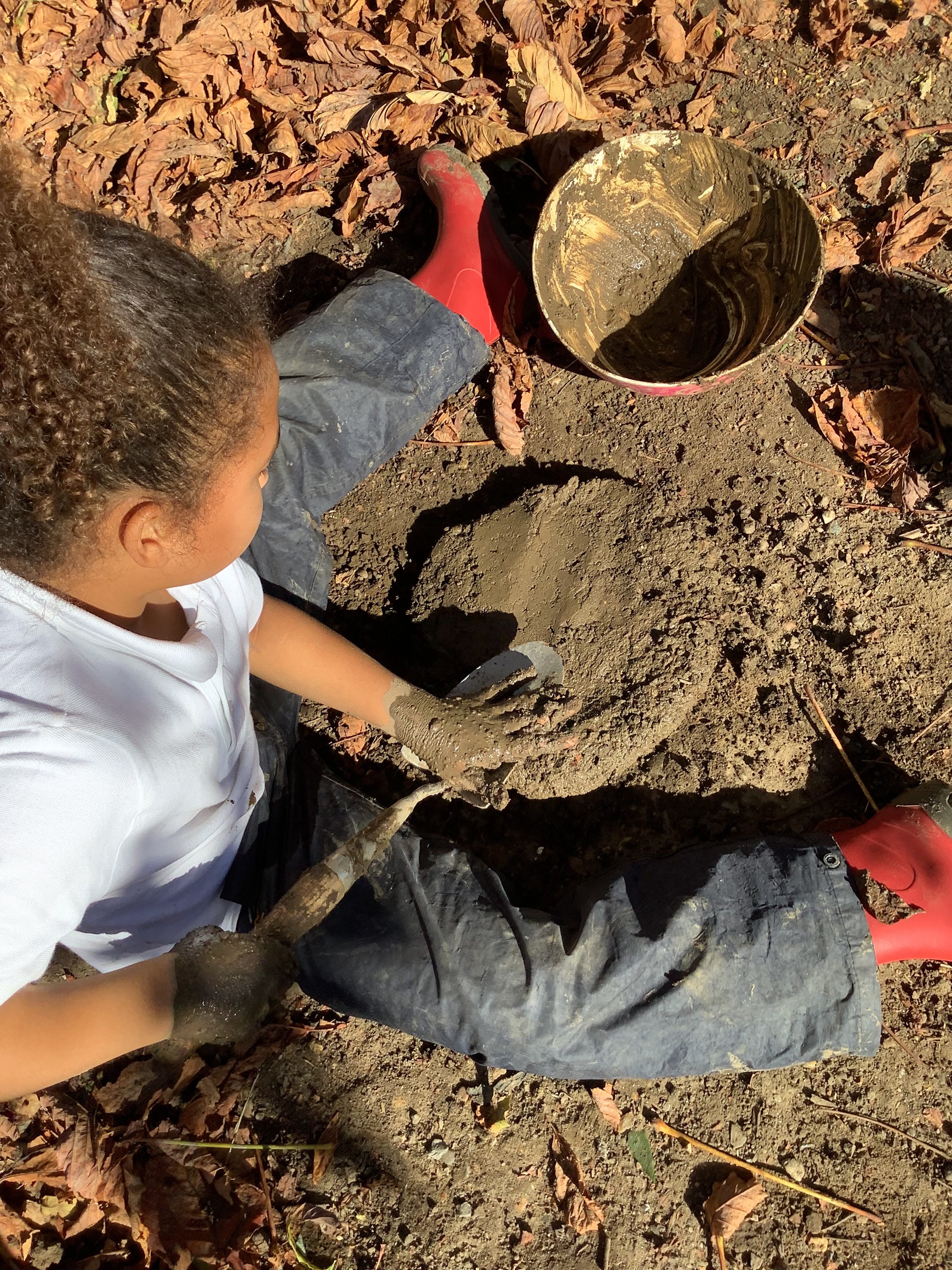 Of course, no outdoor learning would be complete without a little messy fun – and the children loved experimenting with soil + water = mud! They used mud to make imaginative creations, learning through play and sensory exploration.