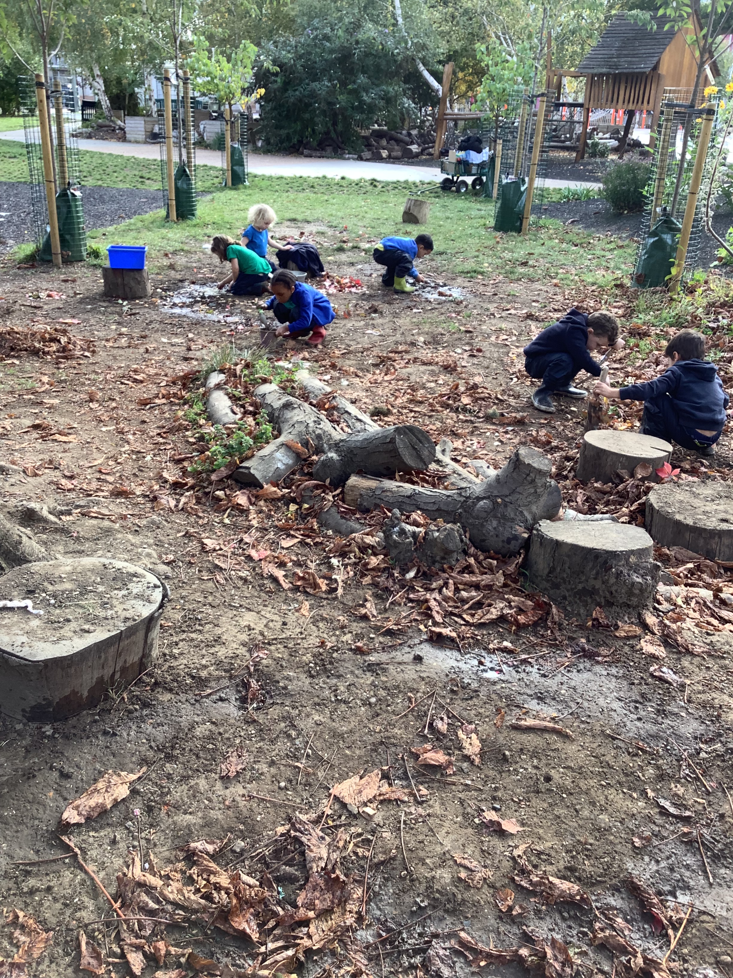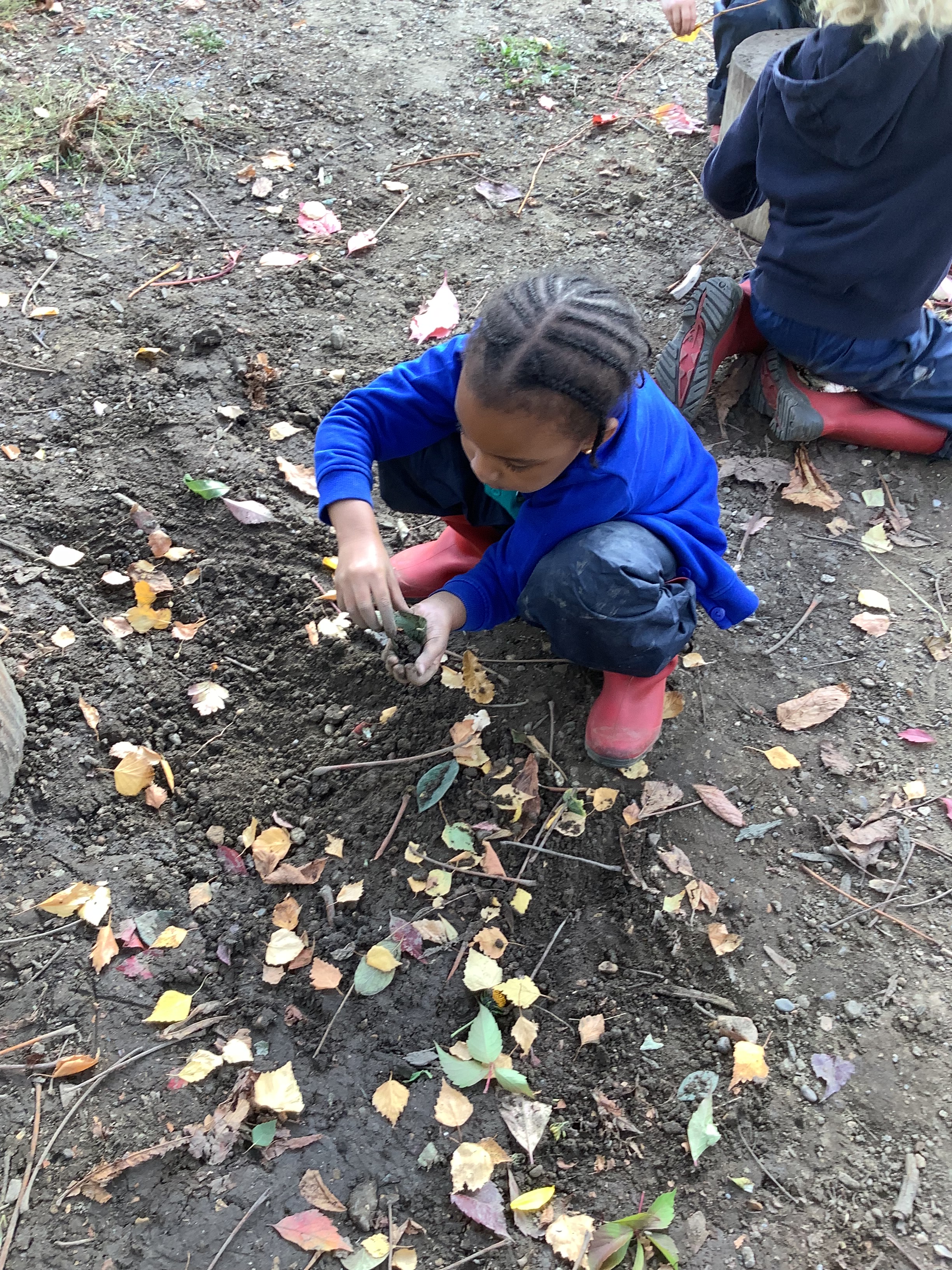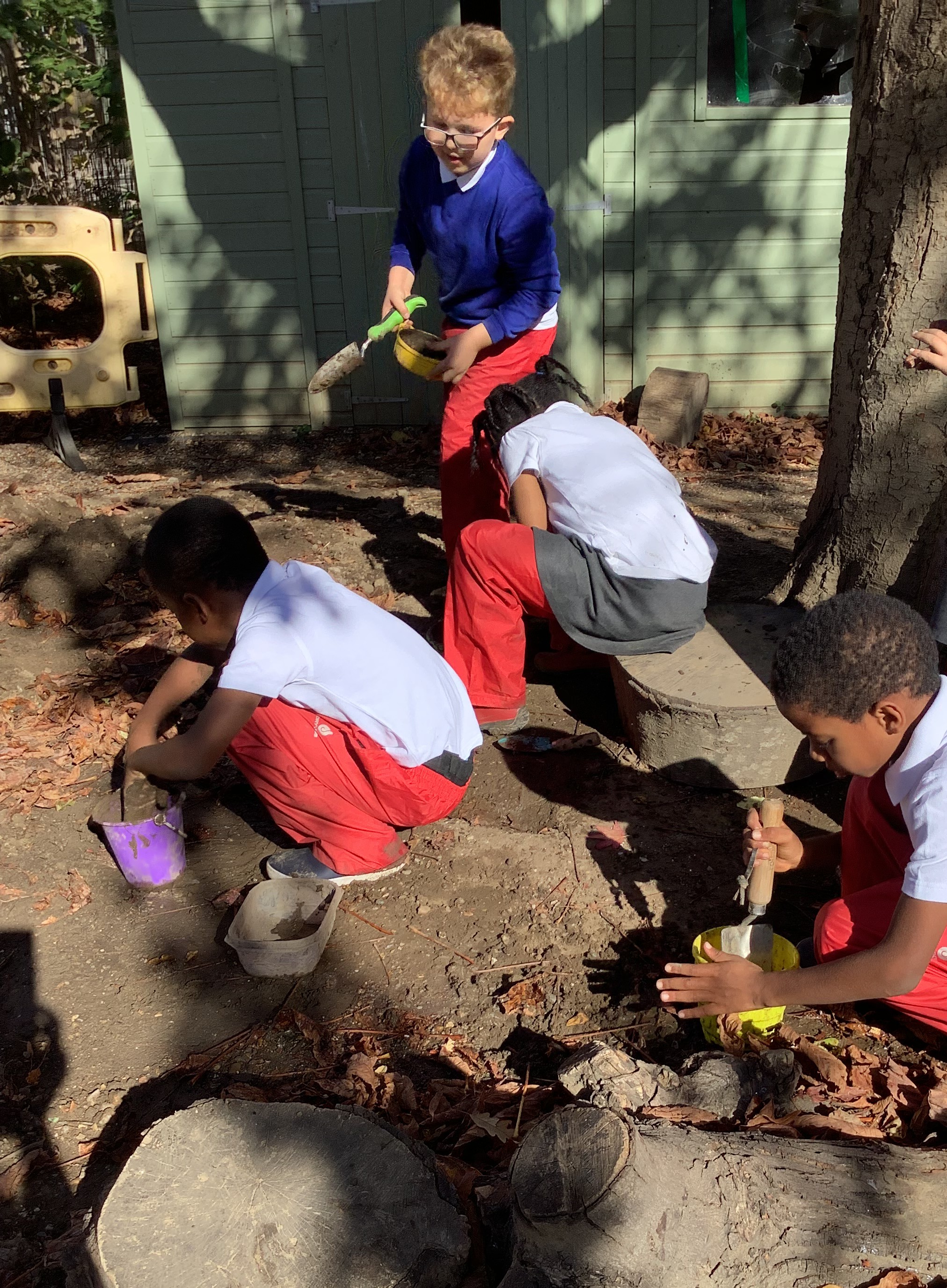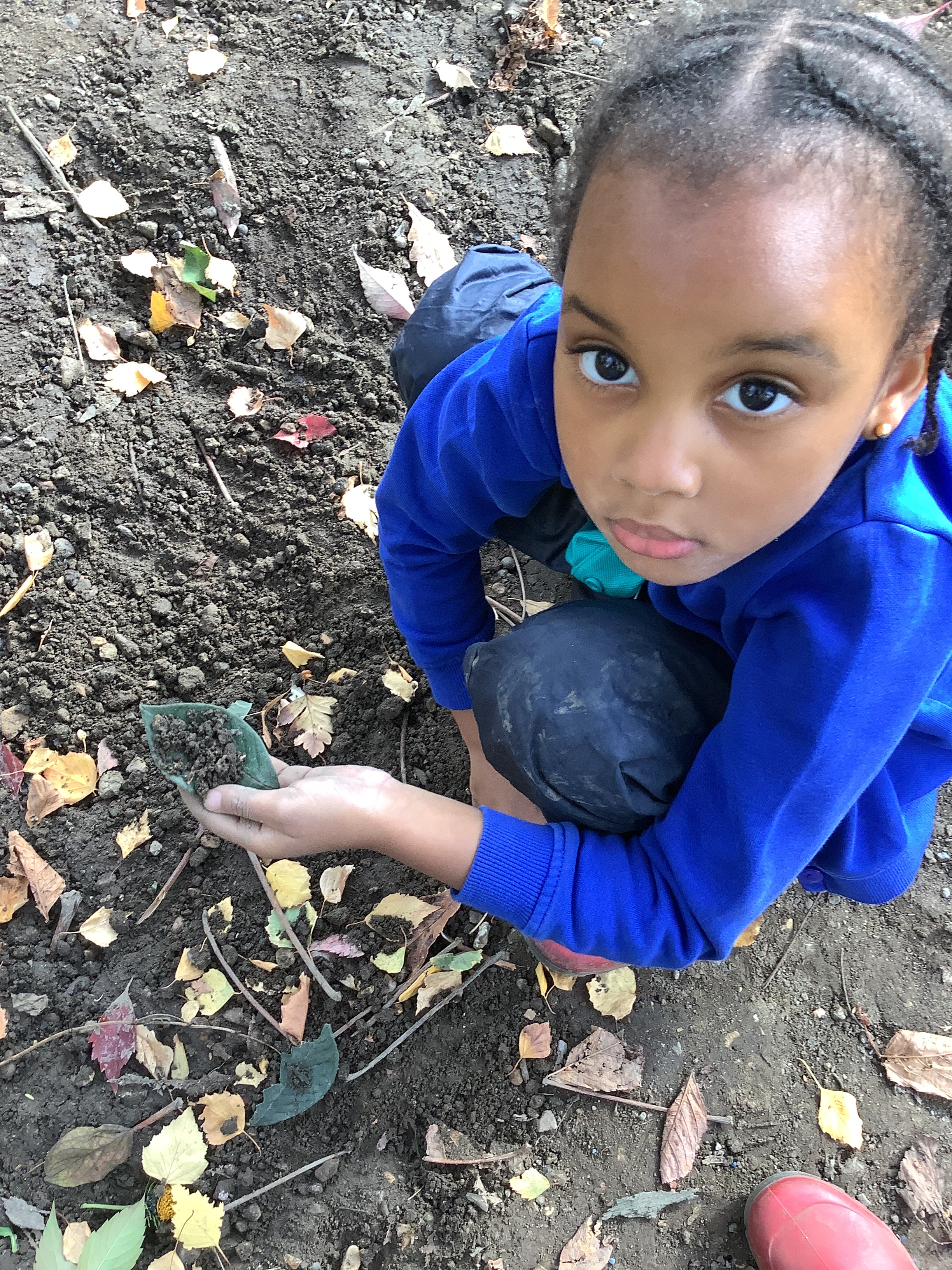 Of course, no outdoor learning would be complete without a little messy fun – and the children loved experimenting with soil + water = mud! They used mud to make imaginative creations, learning through play and sensory exploration.
