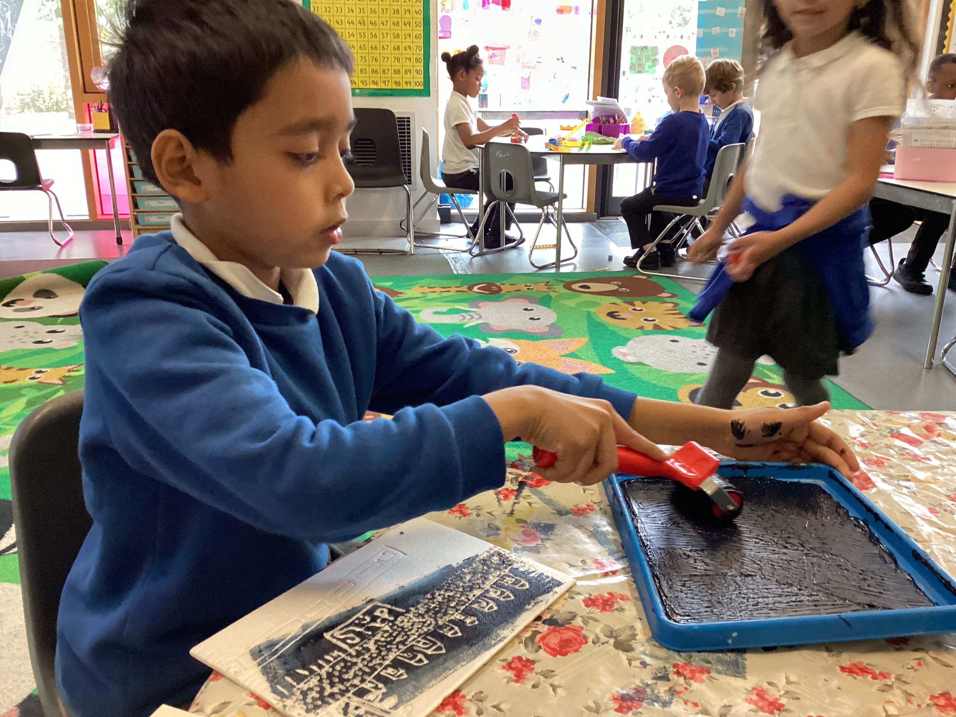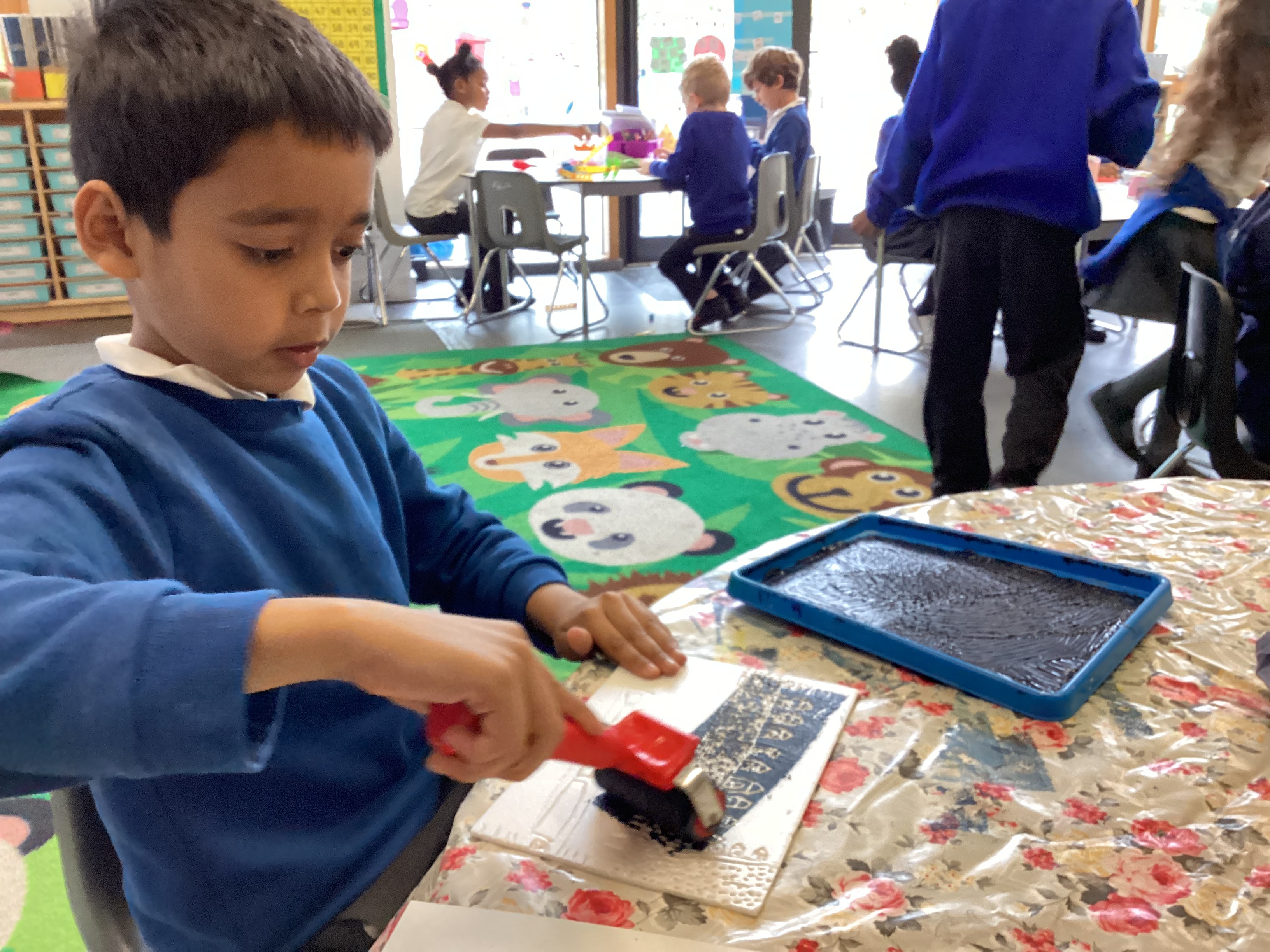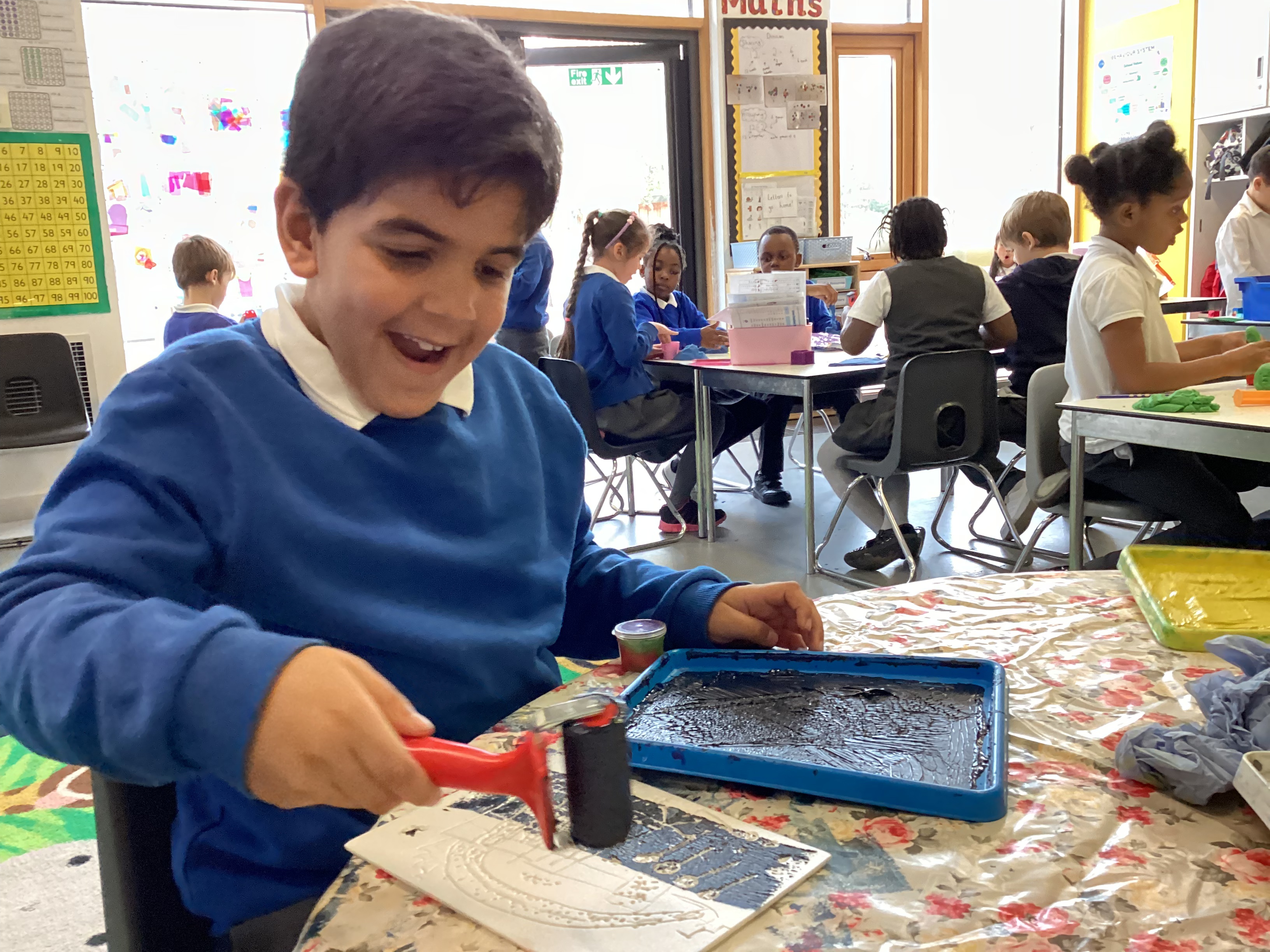 Year 2 have been exploring printing techniques as part of our Art learning. Linking to the National Curriculum objective to develop a wide range of art and design techniques using colour, pattern, texture, line, shape, form and space, the children took a small section of their previously drawn maps and transformed it into a design on a polystyrene tile.