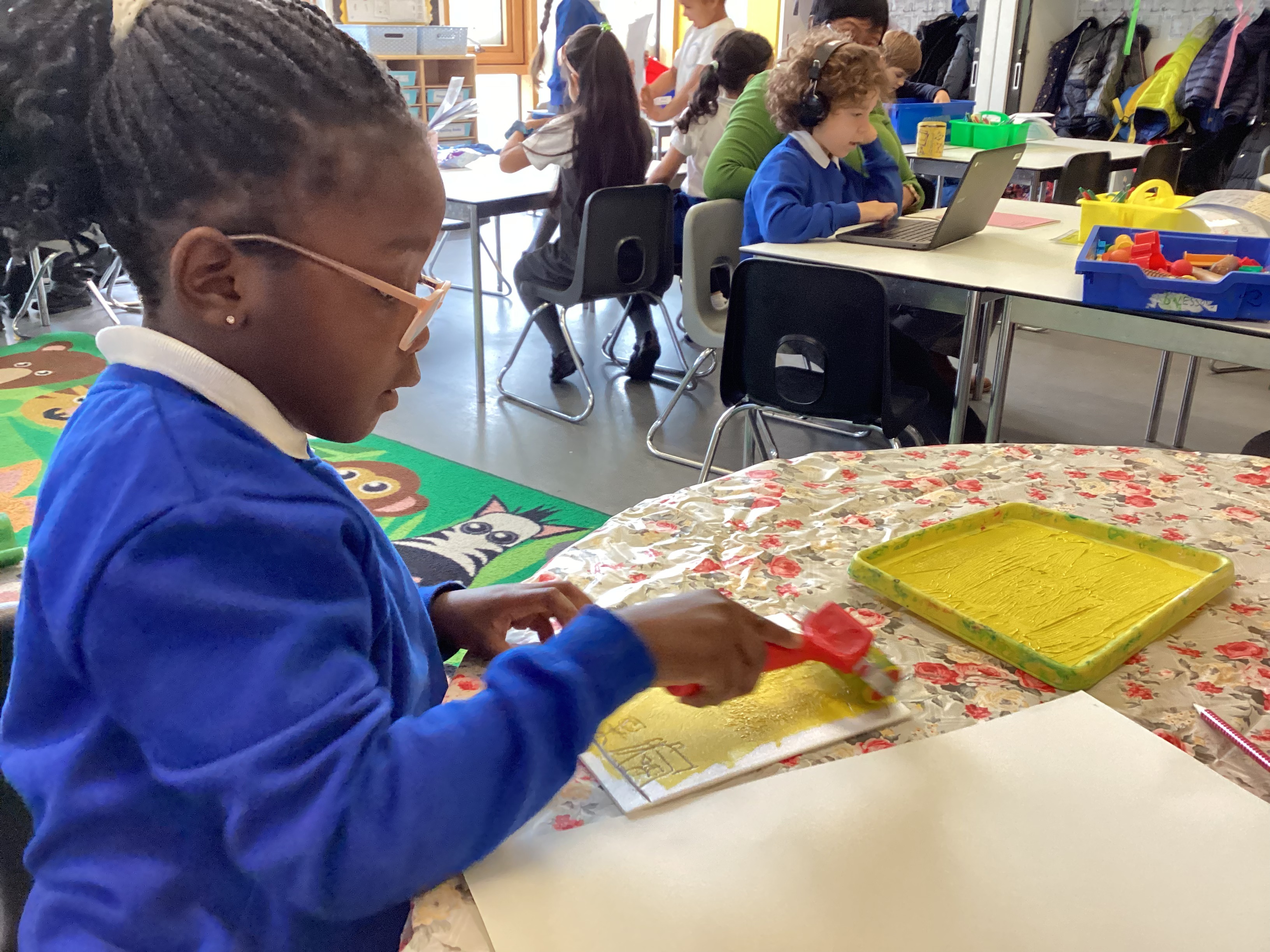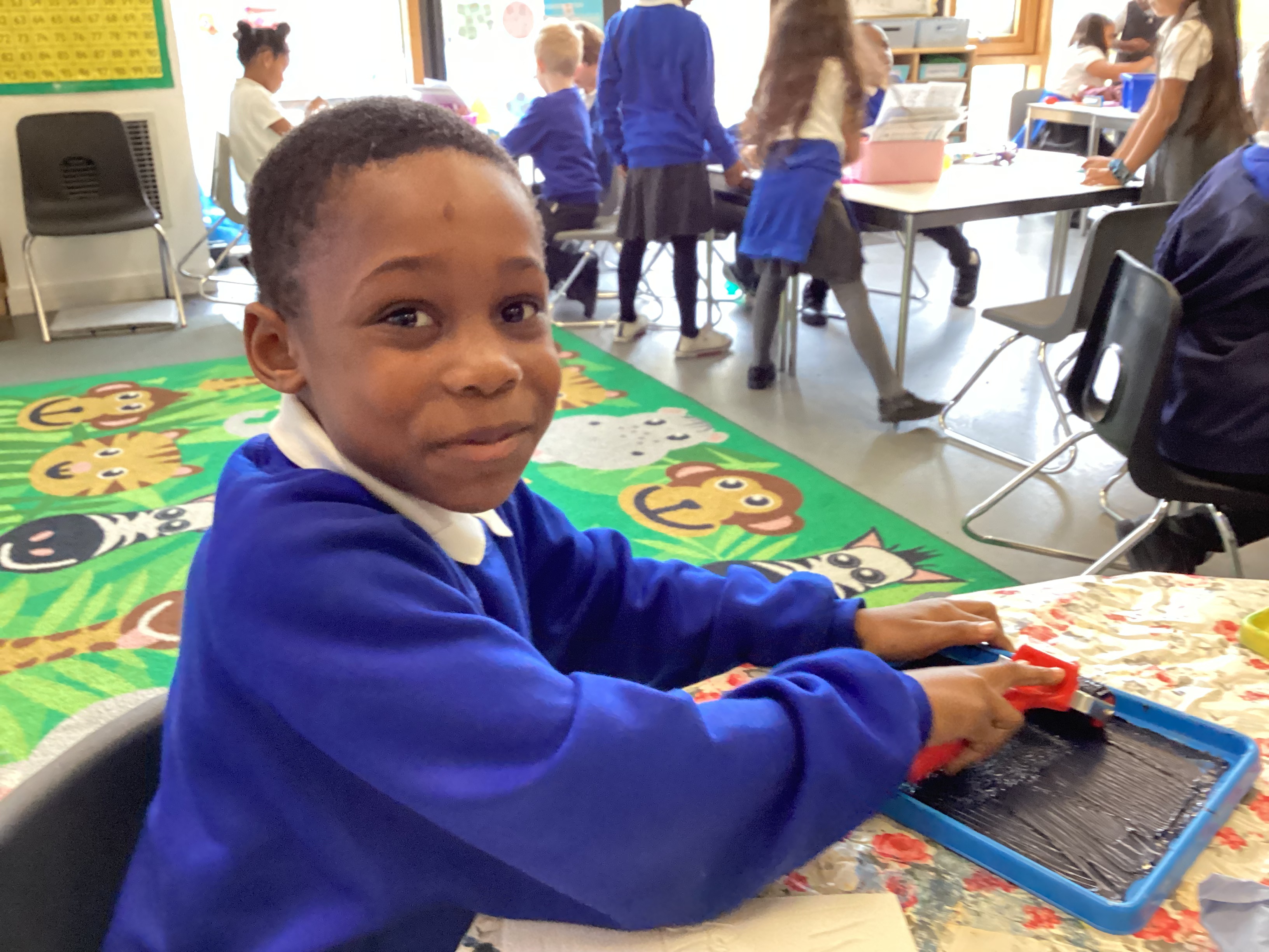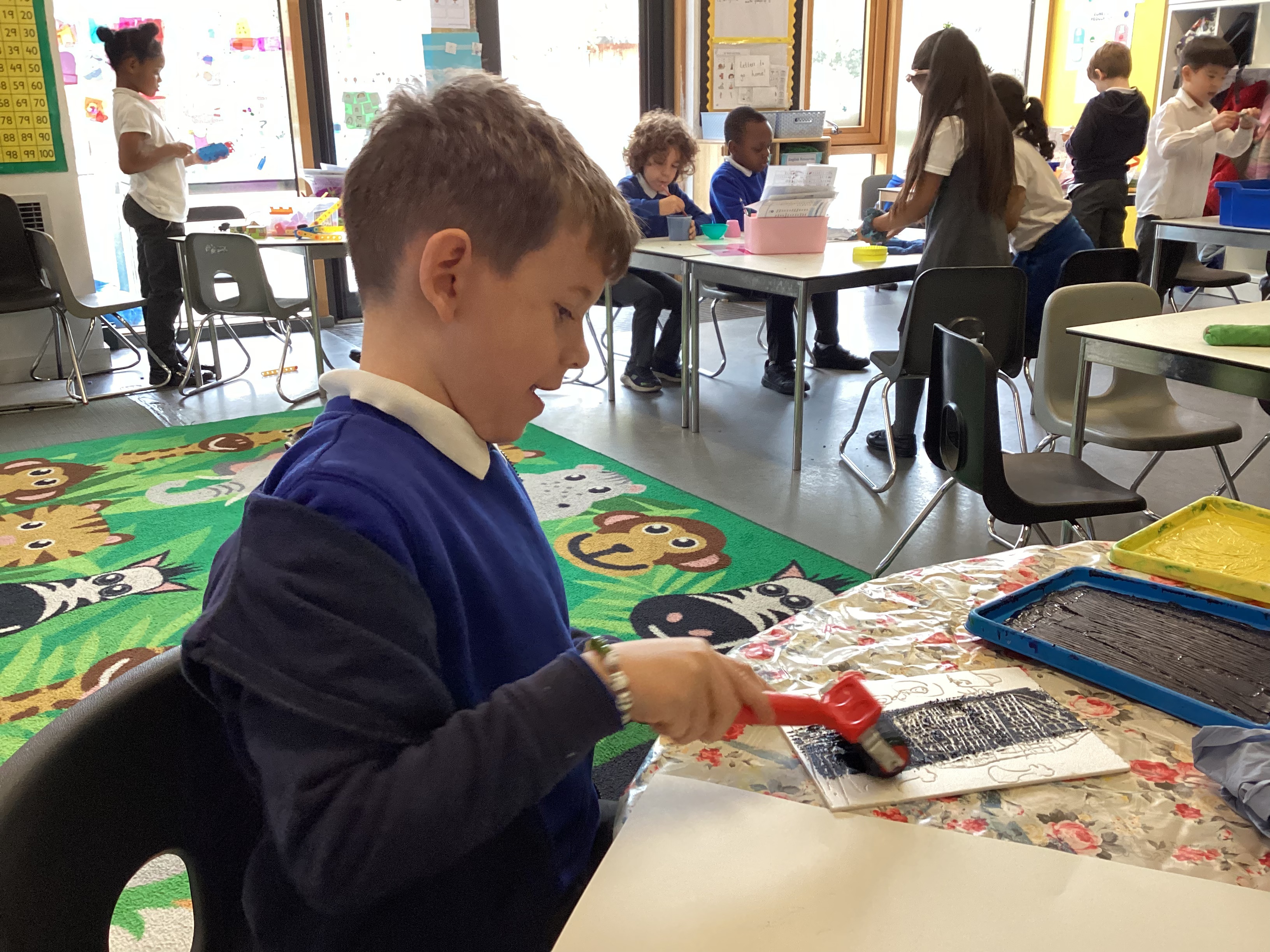 Year 2 have been exploring printing techniques as part of our Art learning. Linking to the National Curriculum objective to develop a wide range of art and design techniques using colour, pattern, texture, line, shape, form and space, the children took a small section of their previously drawn maps and transformed it into a design on a polystyrene tile.