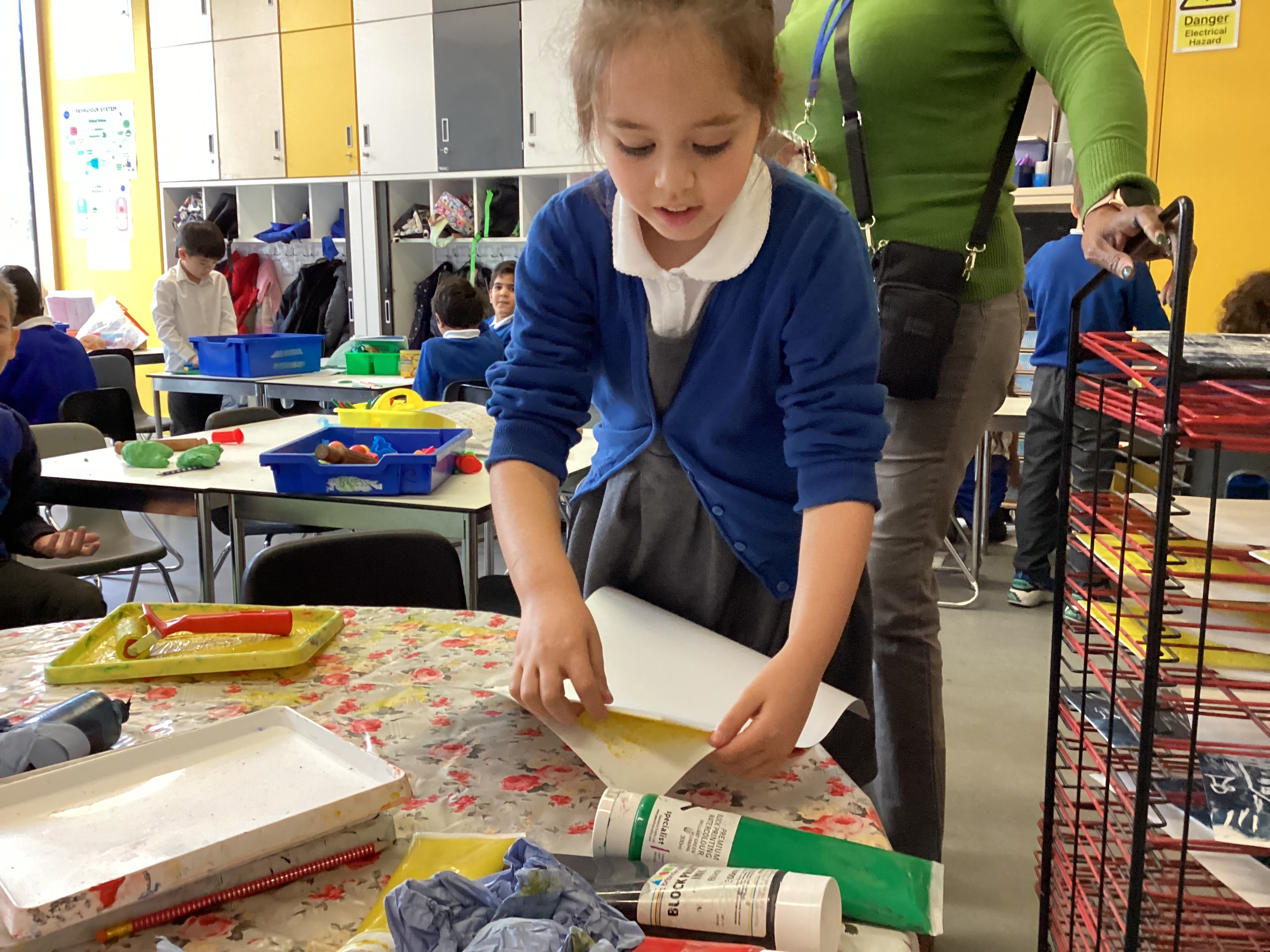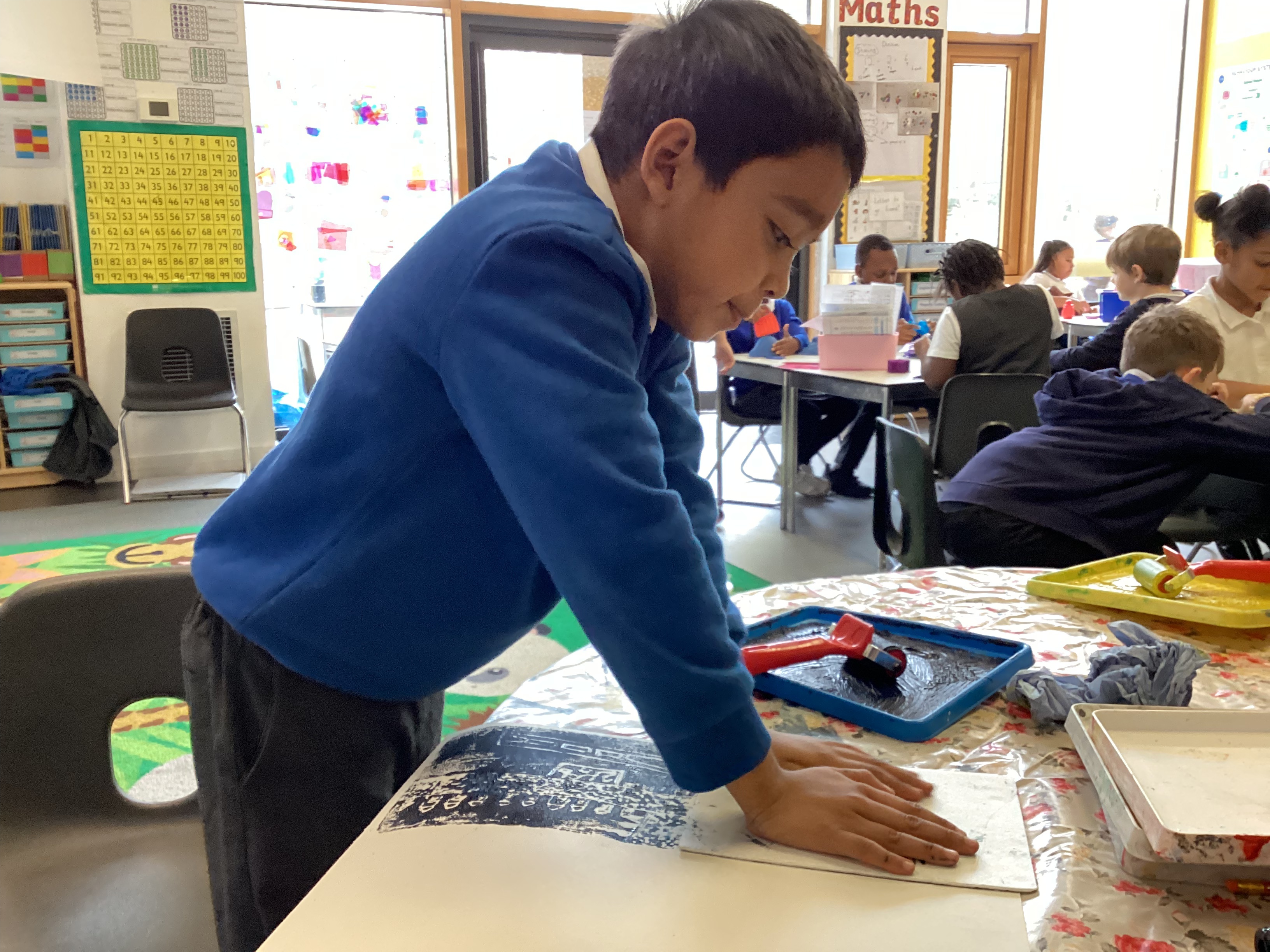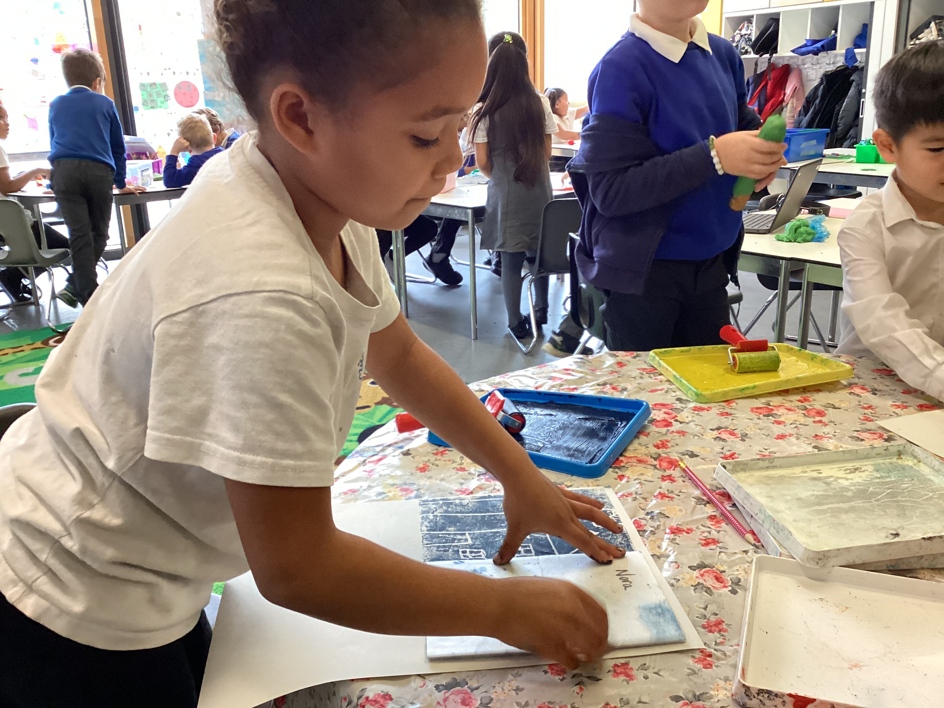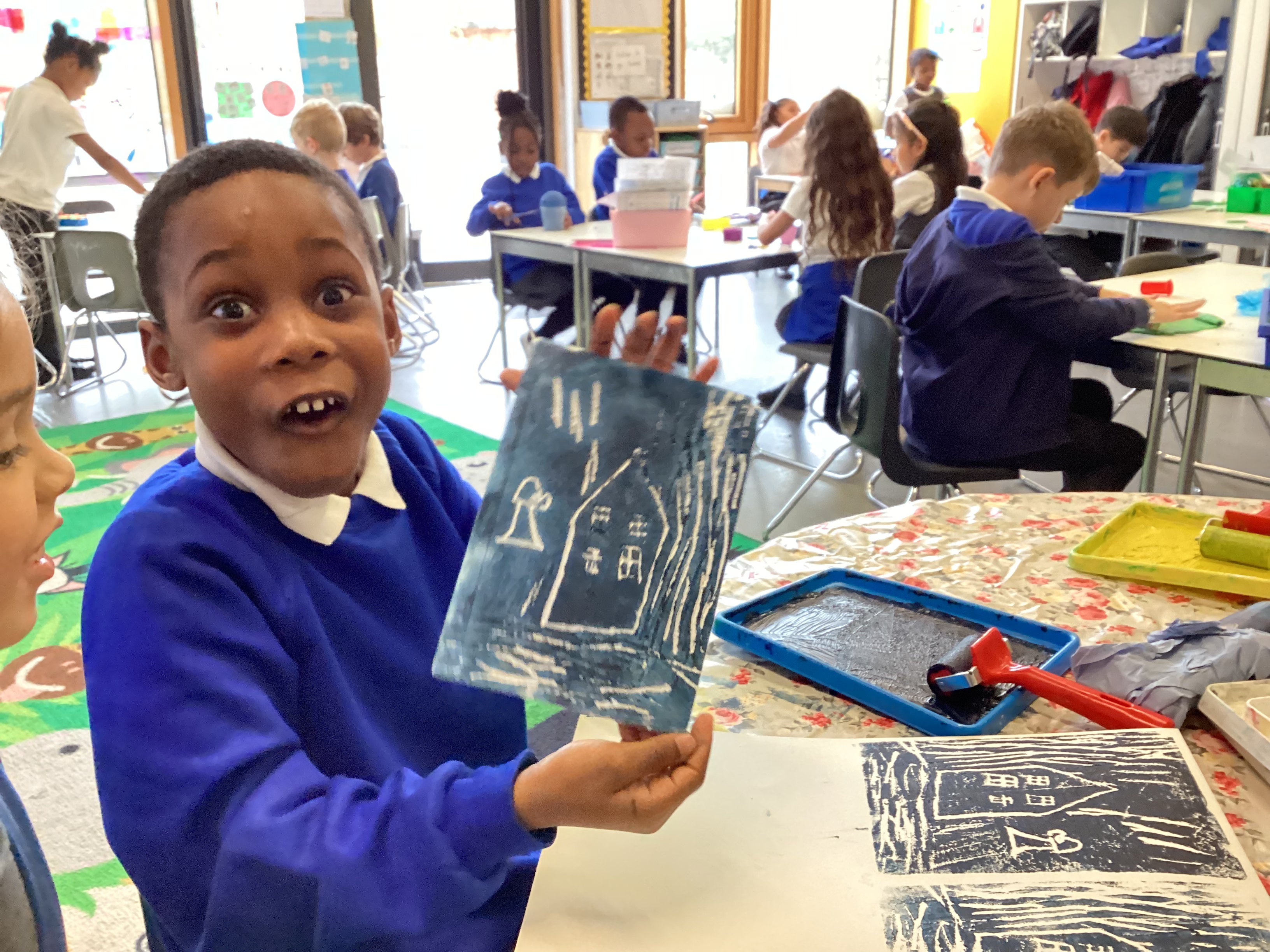They carefully used ink to print their designs, experimenting with colour and pattern to create wonderful results. As you can see, many of us were delighted with how our prints turned out — each one unique and full of creativity!