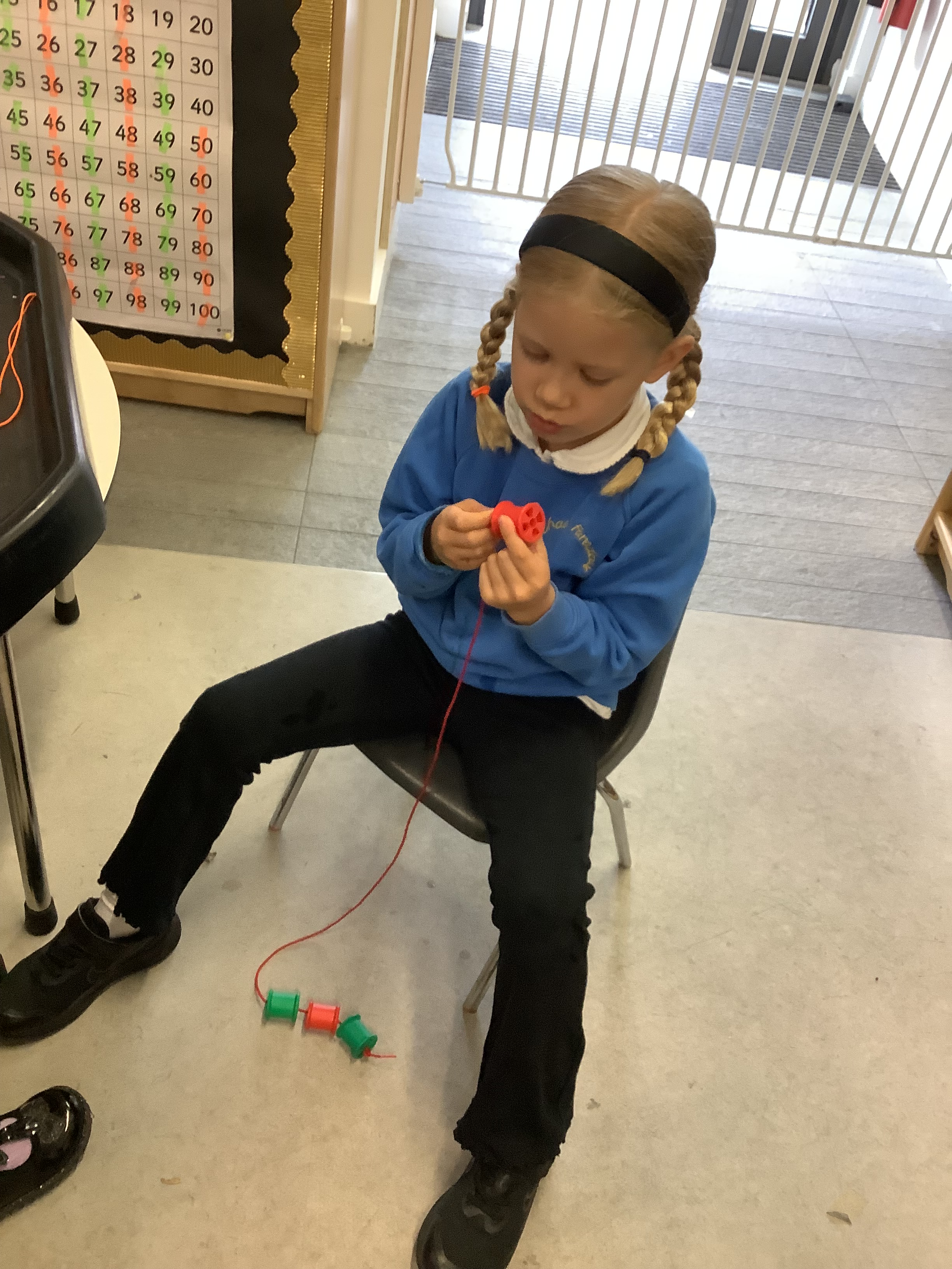 In Maths, we have been exploring matching pairs using Numicon and sorting objects by colour and type. We have also been matching numerals to quantities by counting out objects on ten frames and writing the matching numbers. The children have enjoyed making repeated patterns using dabbers and by threading cotton reels.