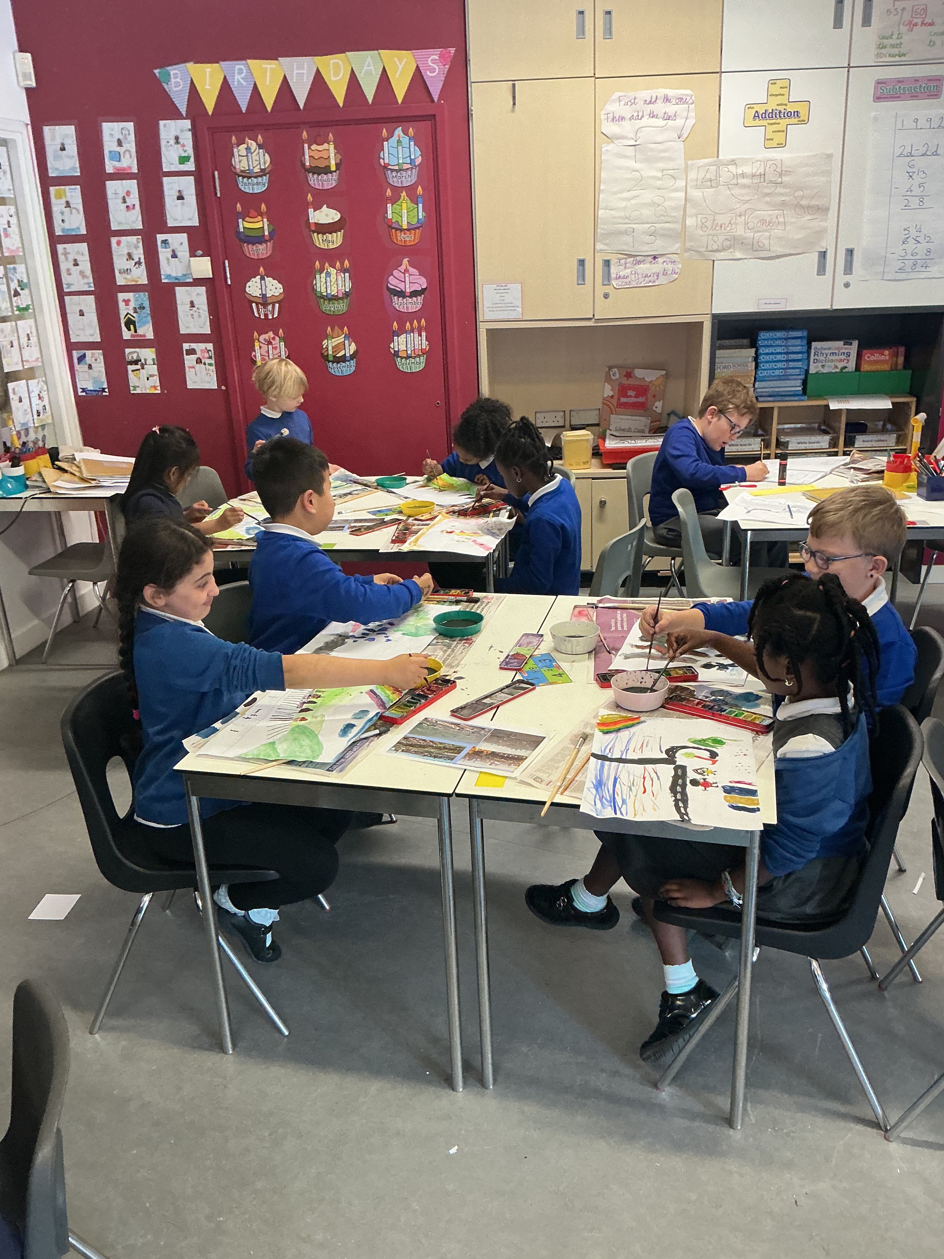 Half of the class time was spent painting stunning South Wales landscapes, inspired by the industrial artwork of L.S. Lowry. The children captured the atmosphere and colours beautifully in their own versions.