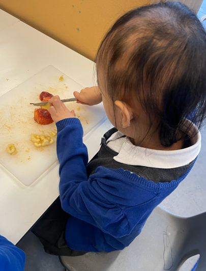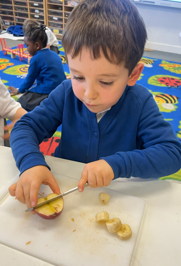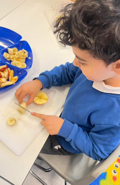 Working in groups, we selected three ingredients to design and make a healthy smoothie. We practised cutting the ingredients independently, learning how to use kitchen tools safely and carefully.