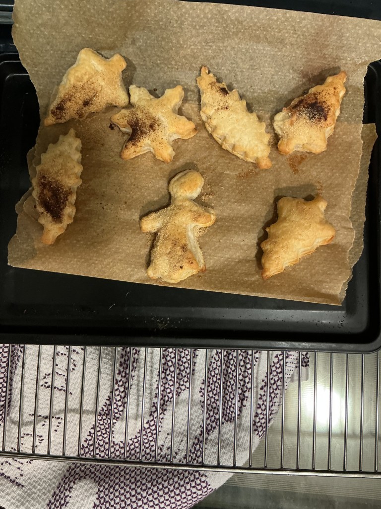 “First you get your Christmas tree one-yeah-shape cutter. Put cinnamon and sugar. Put in the oven. Only for 10 minutes—no, 7 minutes.”