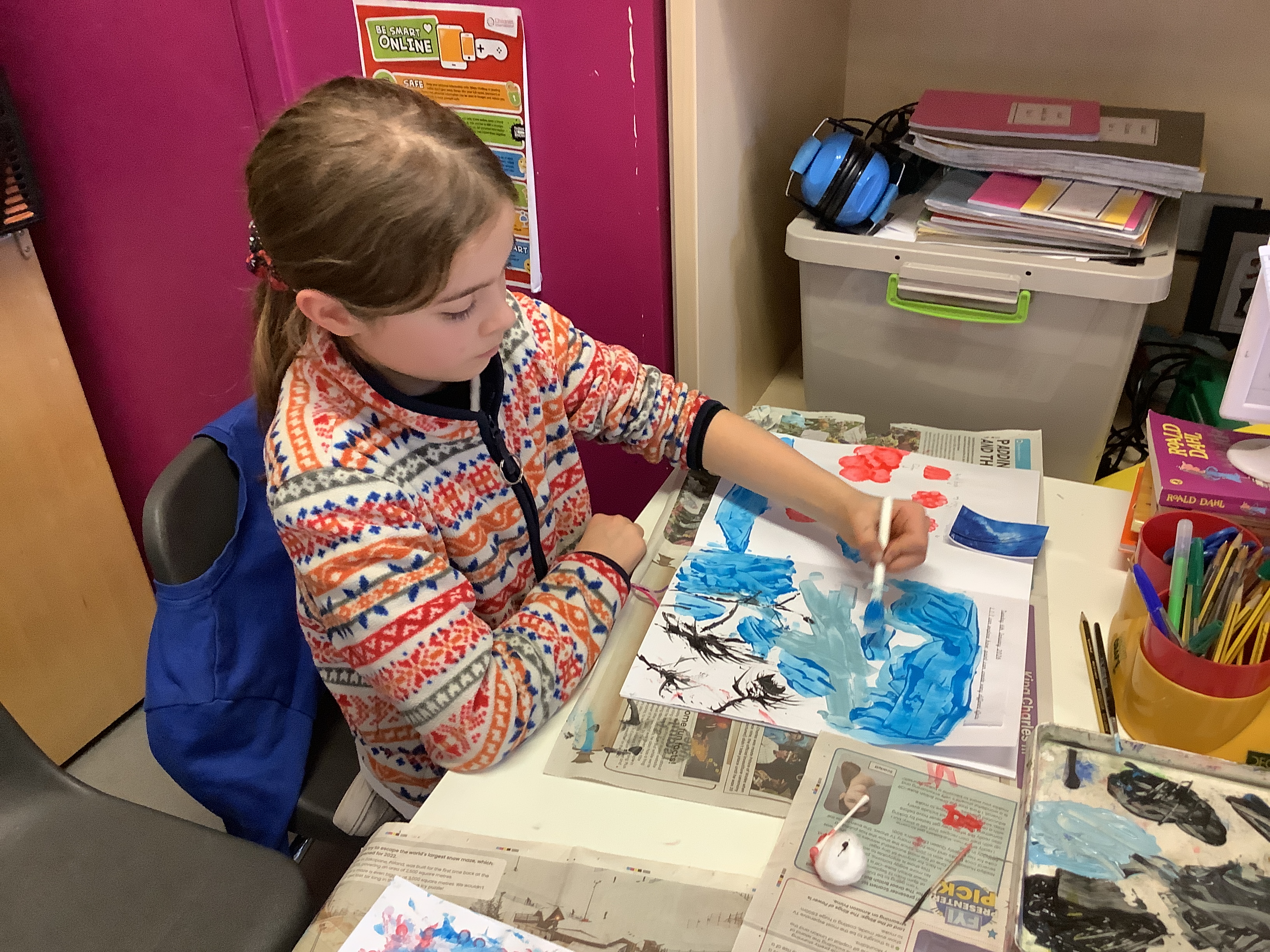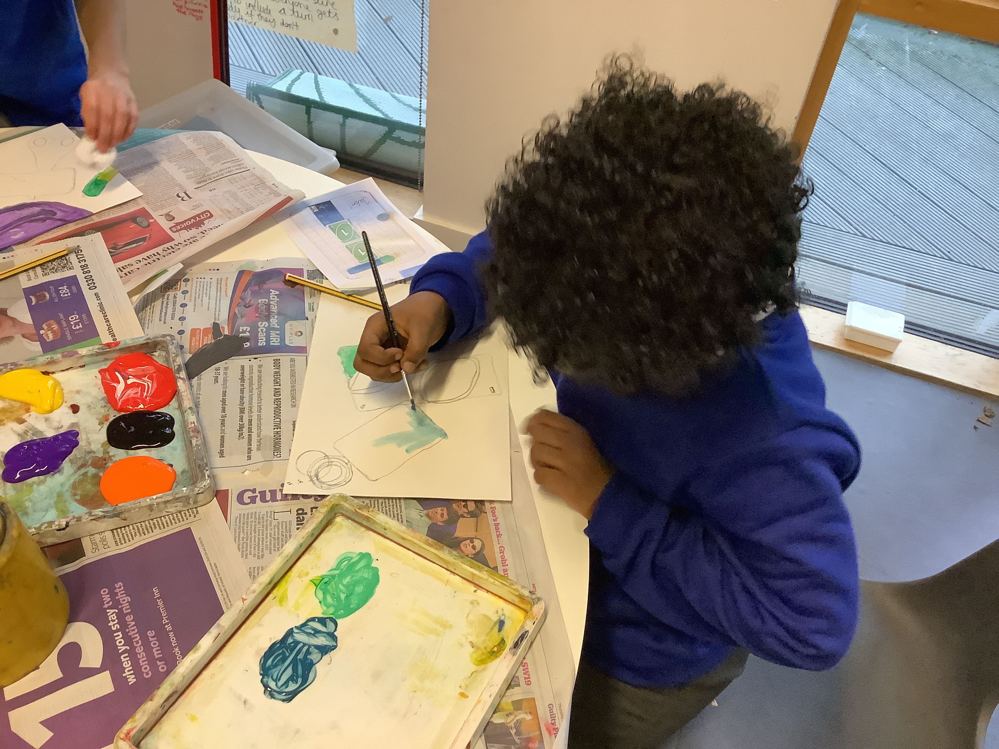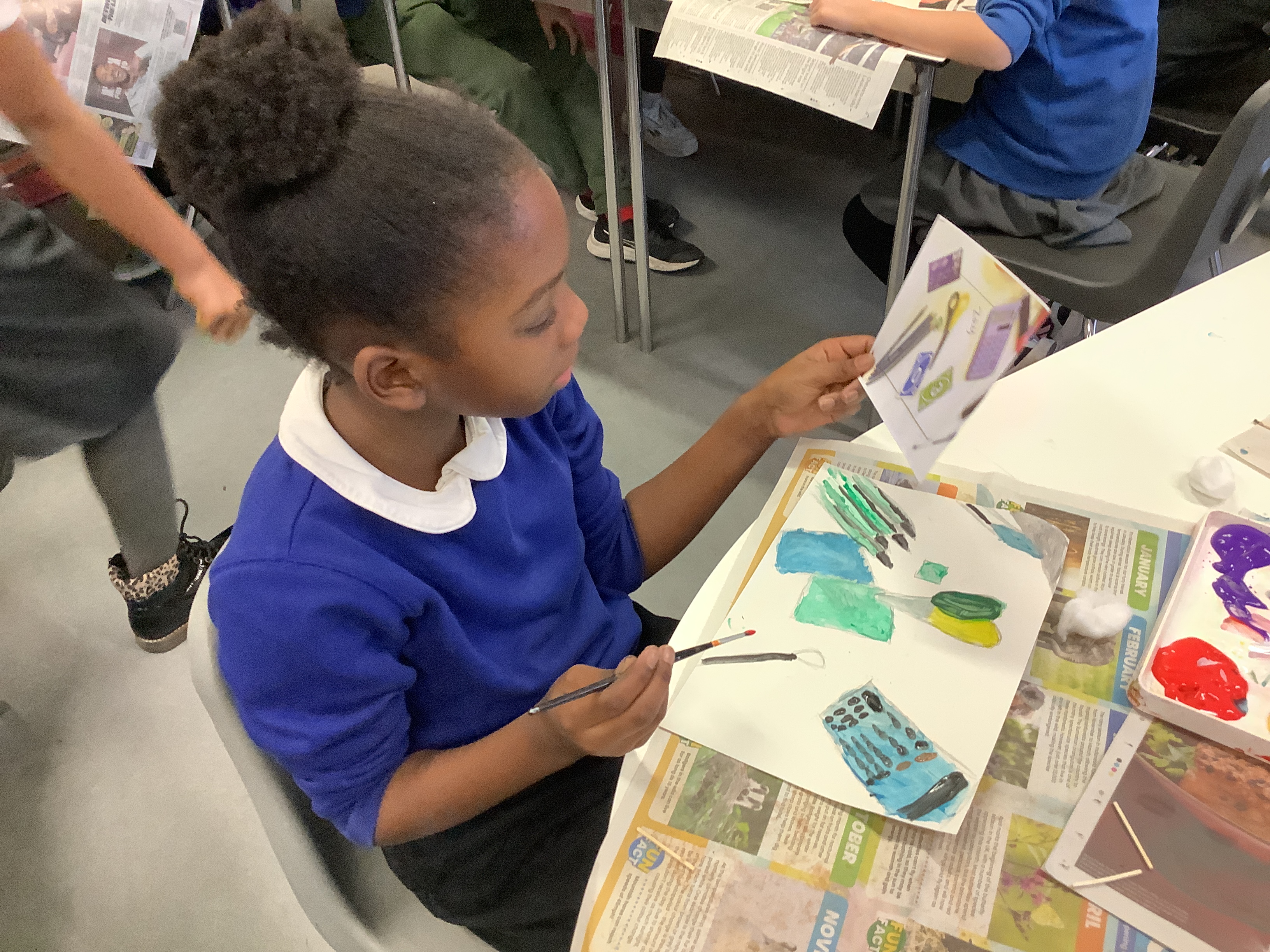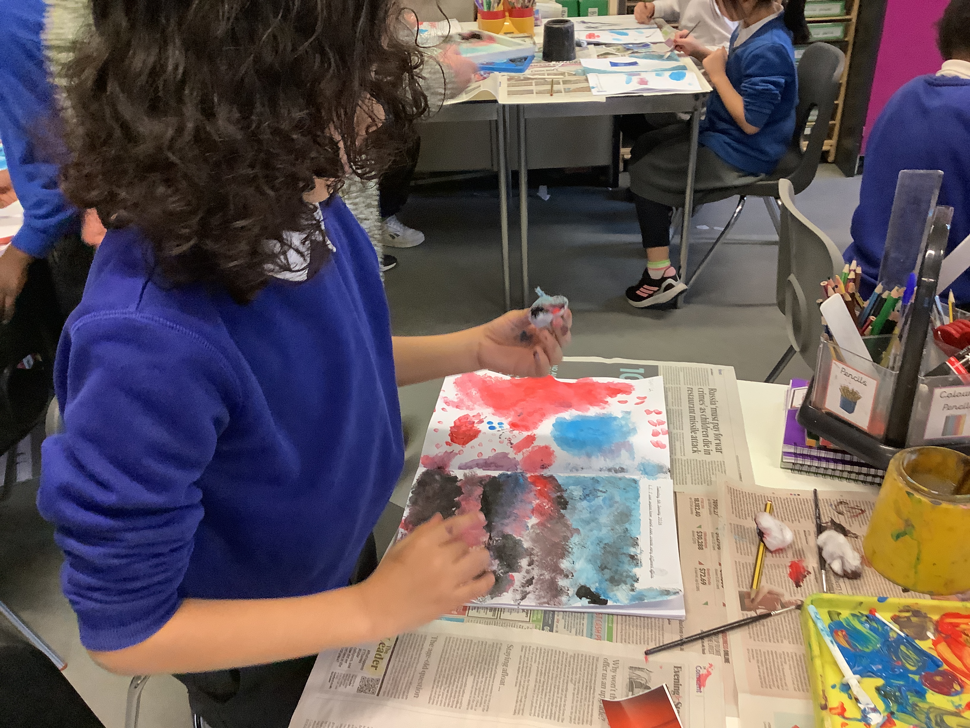 We then explored using different painting tools to change the texture of our work: from cotton wool, to toothpicks… even fingers! We discussed how these can help us create different painting styles, such as pointillism and stippling.