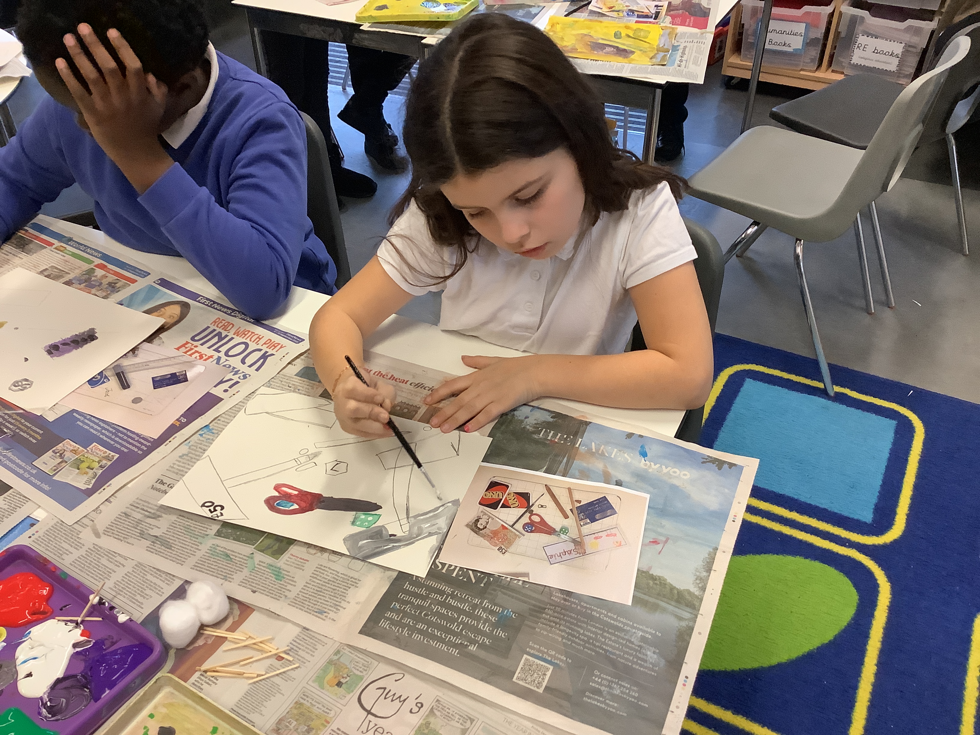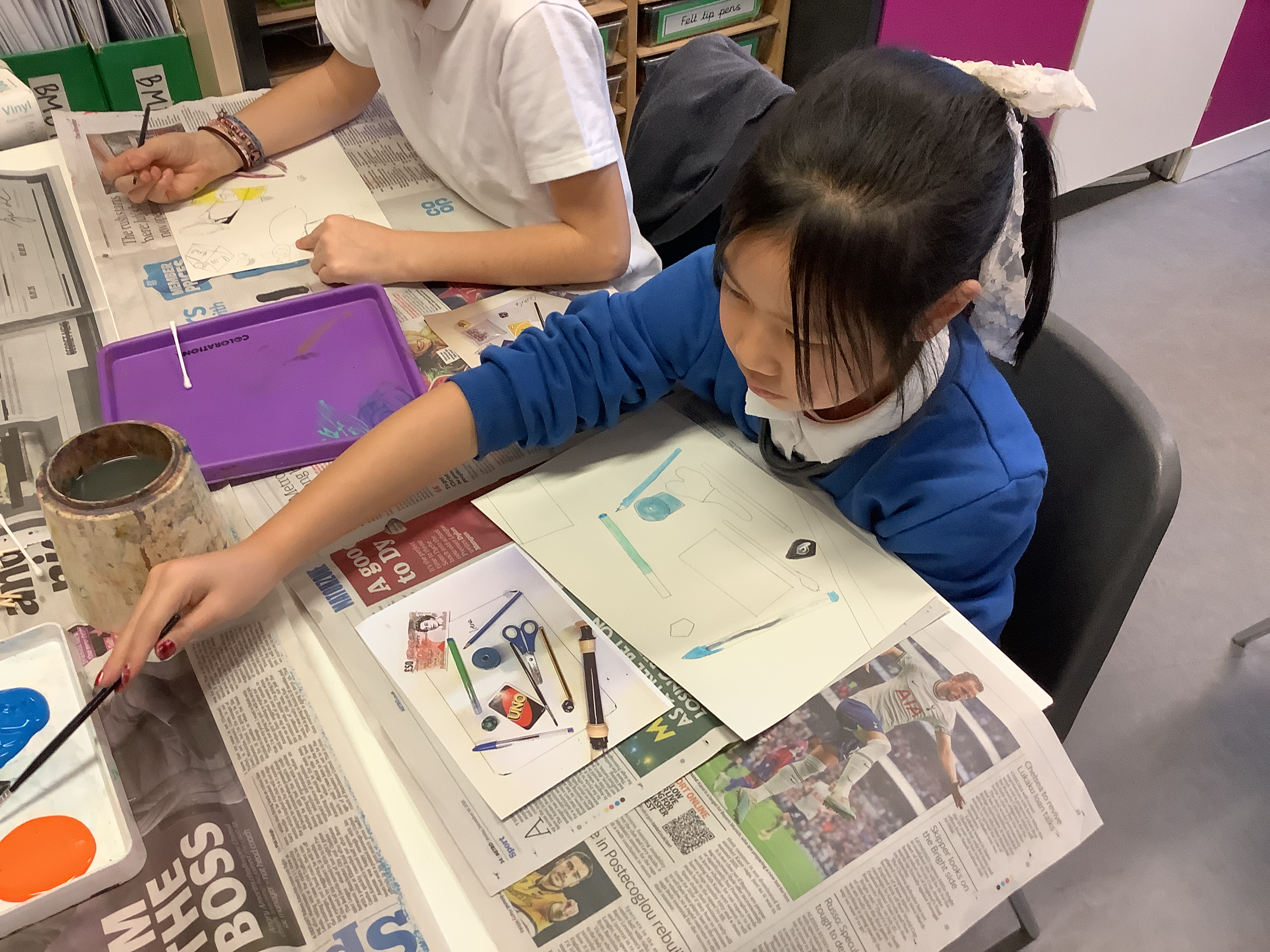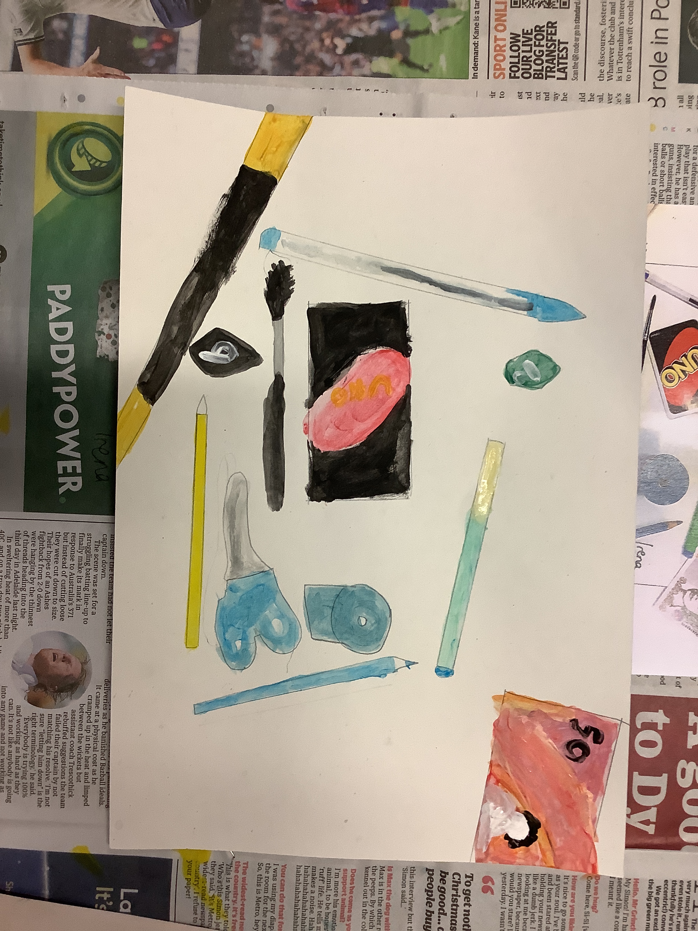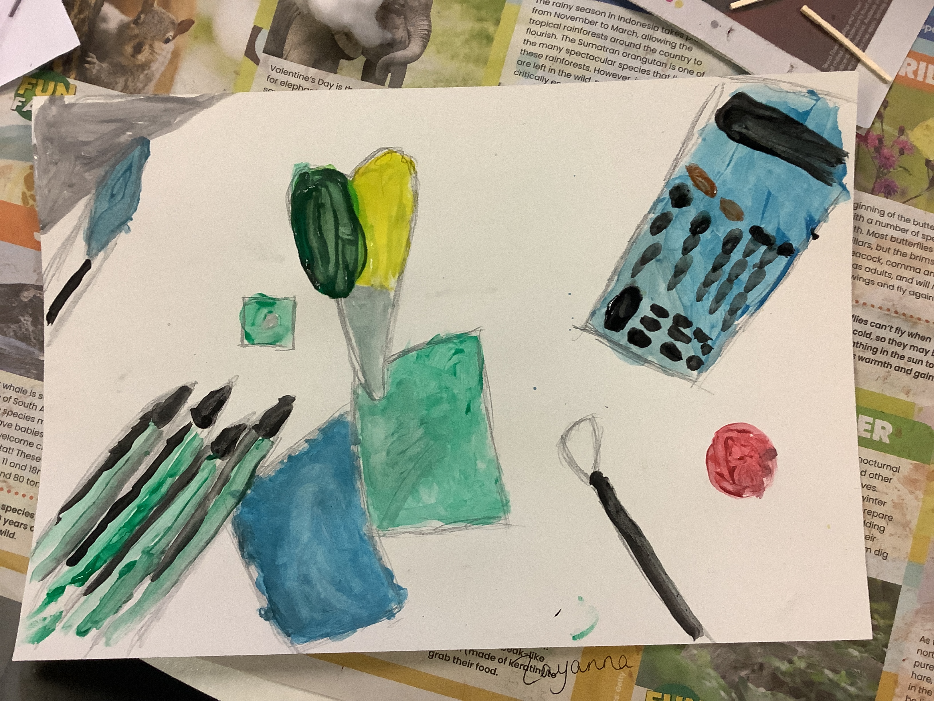 From there, we learnt about still lifes and looked at the work of great artists such as Cezanne. We went for a more modern style of still life, in the style of ‘Queen’ by Audrey Flack, with a top down viewpoint. The children initially arranged random objects in an interesting way to create their composition. They then sketched it, and finally, painted it, employing all the different techniques we’d practised.