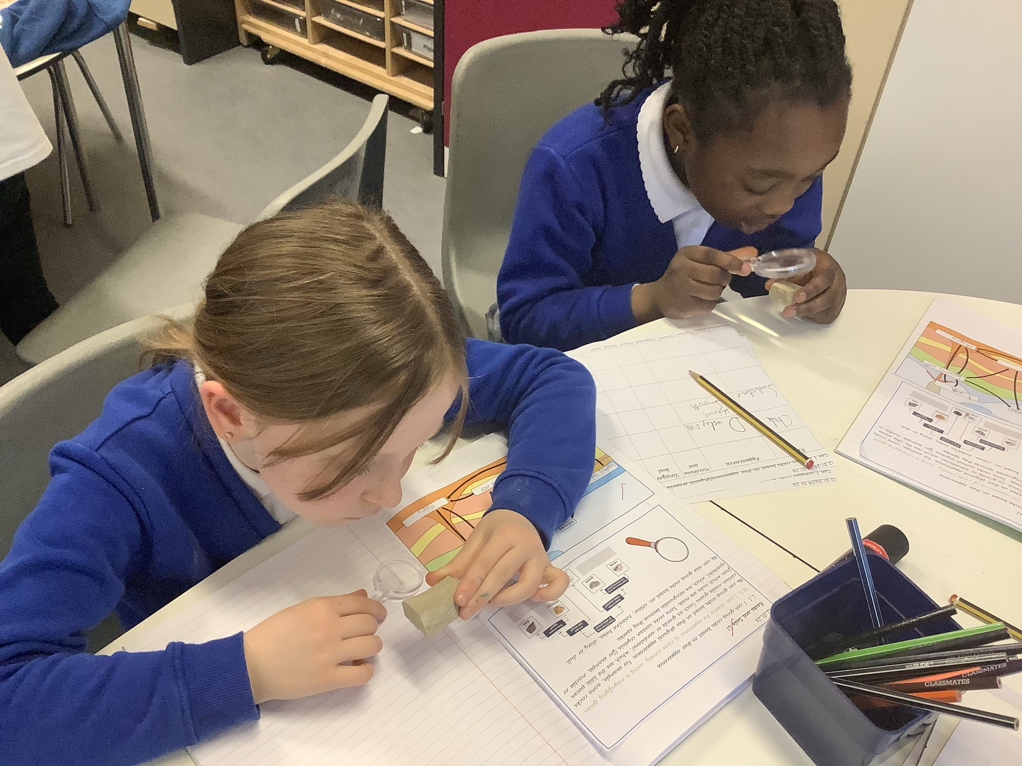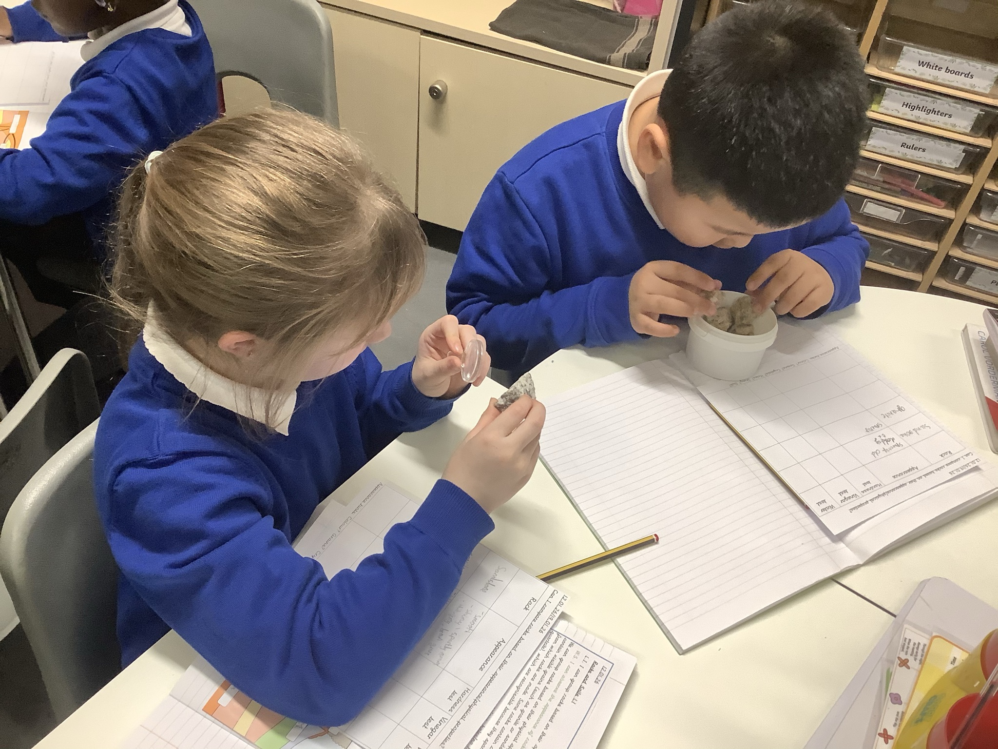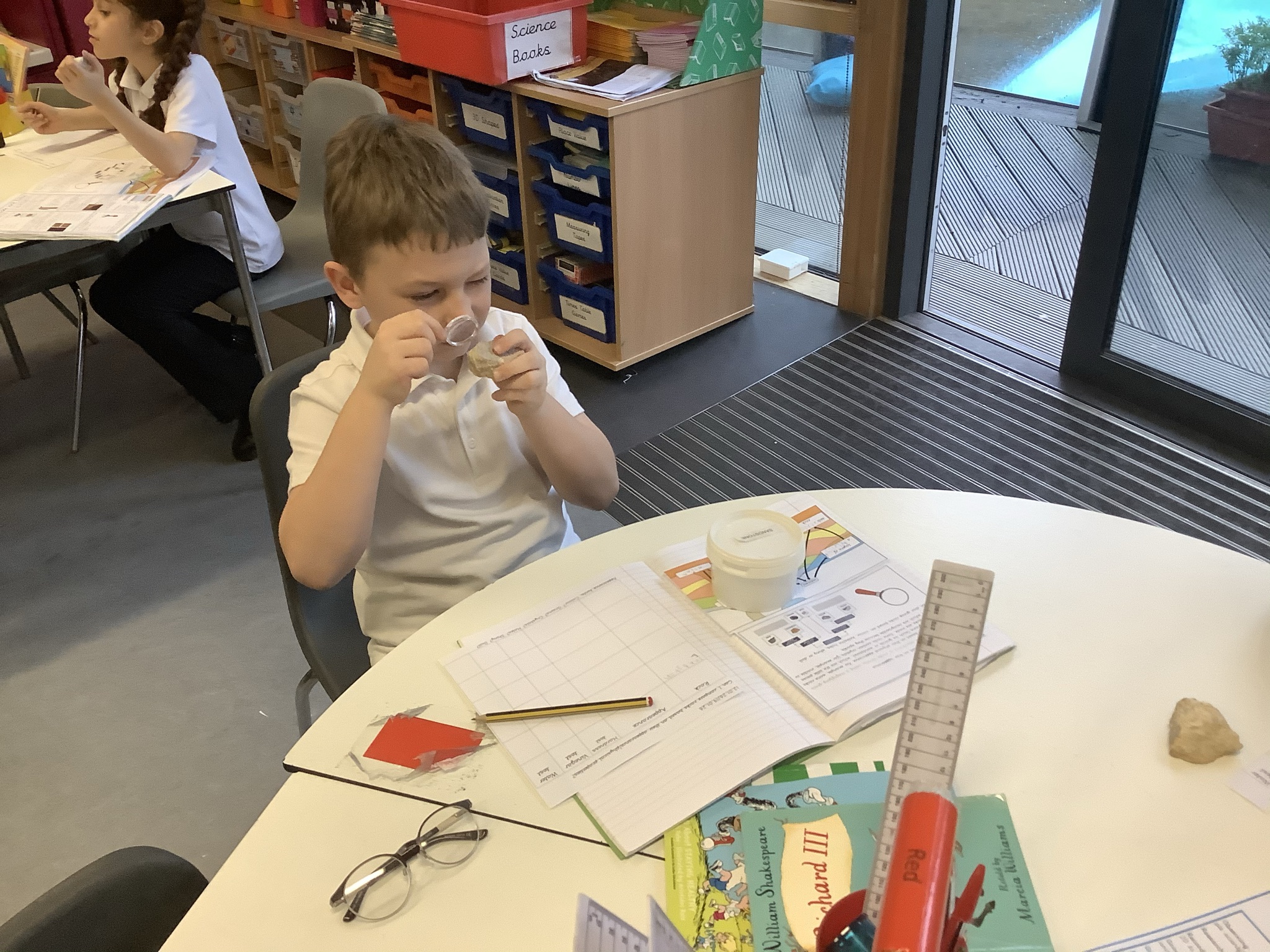 We then had the opportunity to use our scientific skills to look closely at different rock samples and make notes on their appearance. Next lesson, we will be using the same rocks to carry out some experiments to learn more about these types of rocks.
