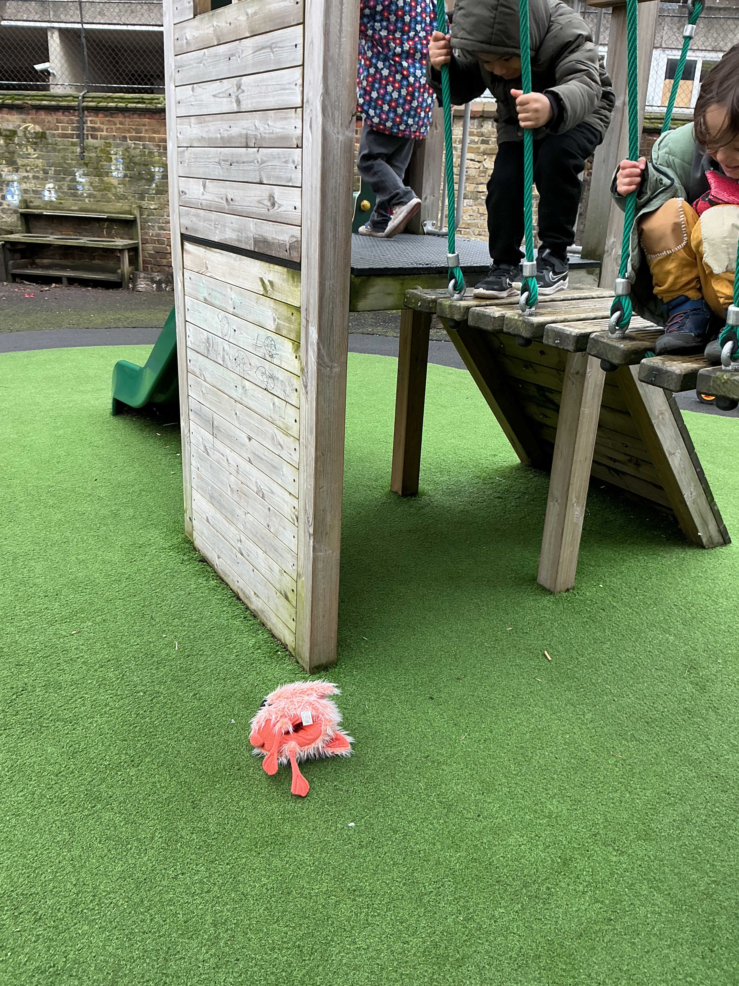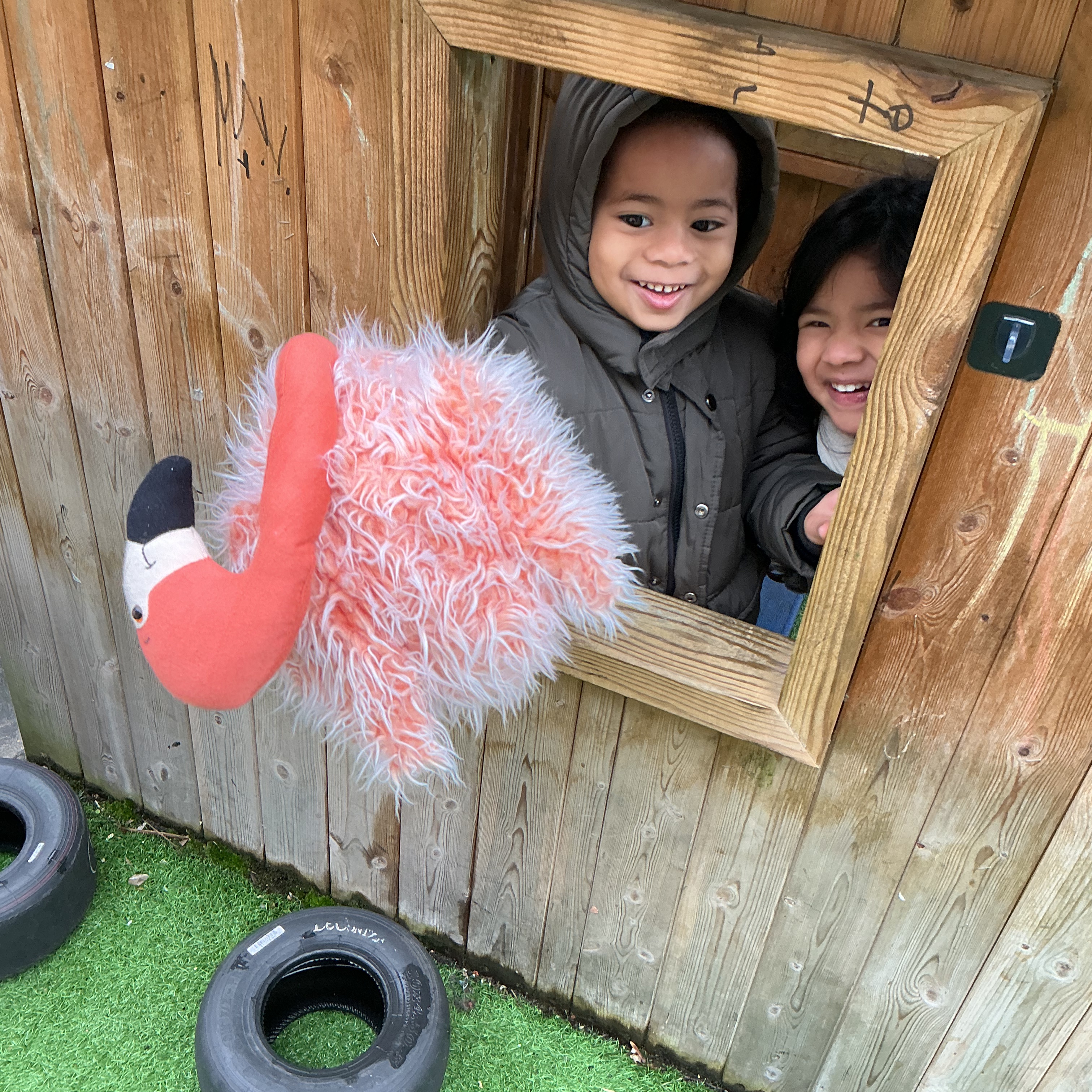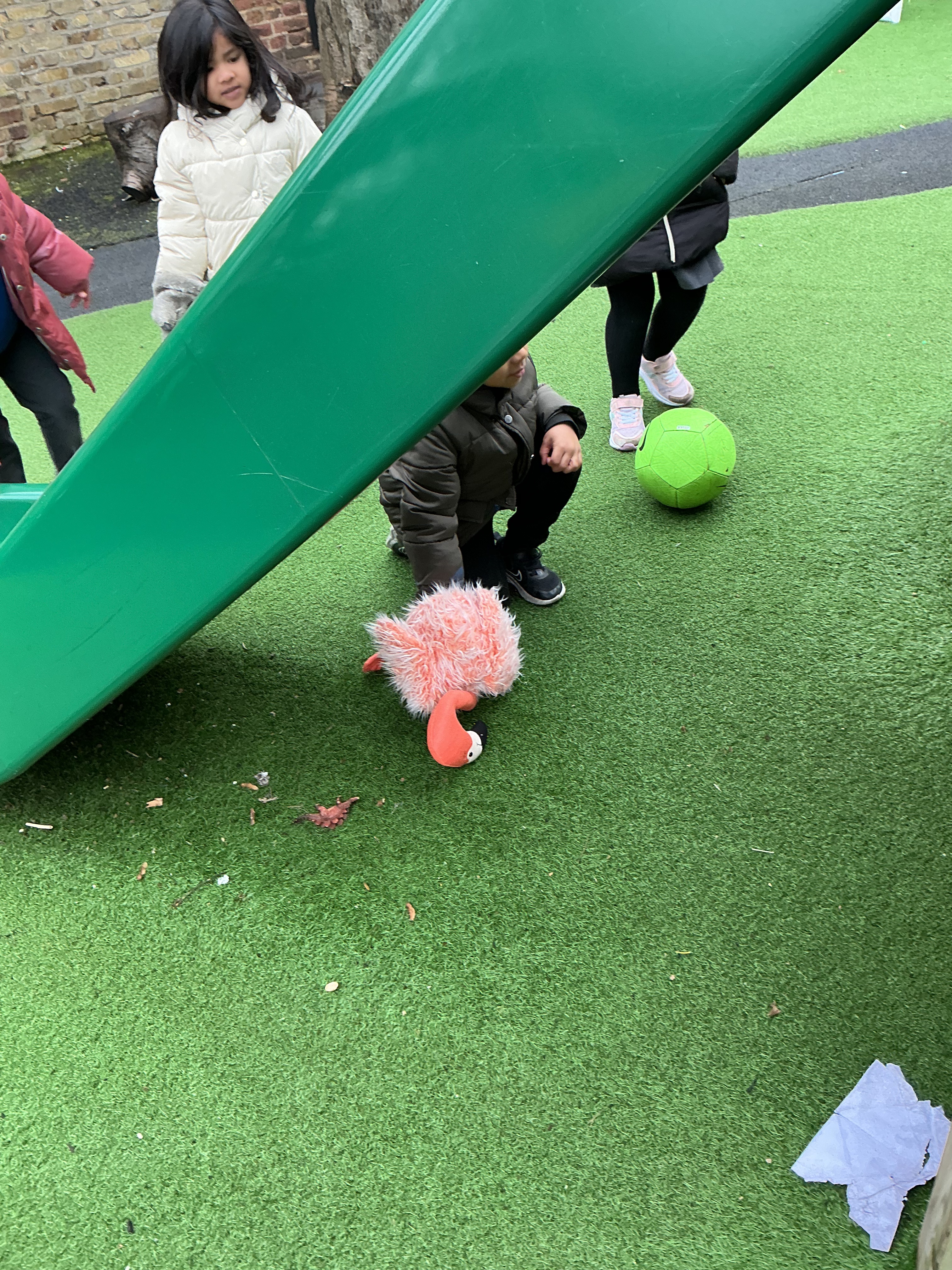 Joseph wondered, “No, he’s not in the oven…where’s the Gingerbread Man gone?” Jayden excitedly described movement, saying, “Flamingo is climbing up, then sliding down!” Olivia spotted a tricky place, “Hiding, in the basketball net,” while Amelia helped her friends by explaining, “He’s only under the slide.”