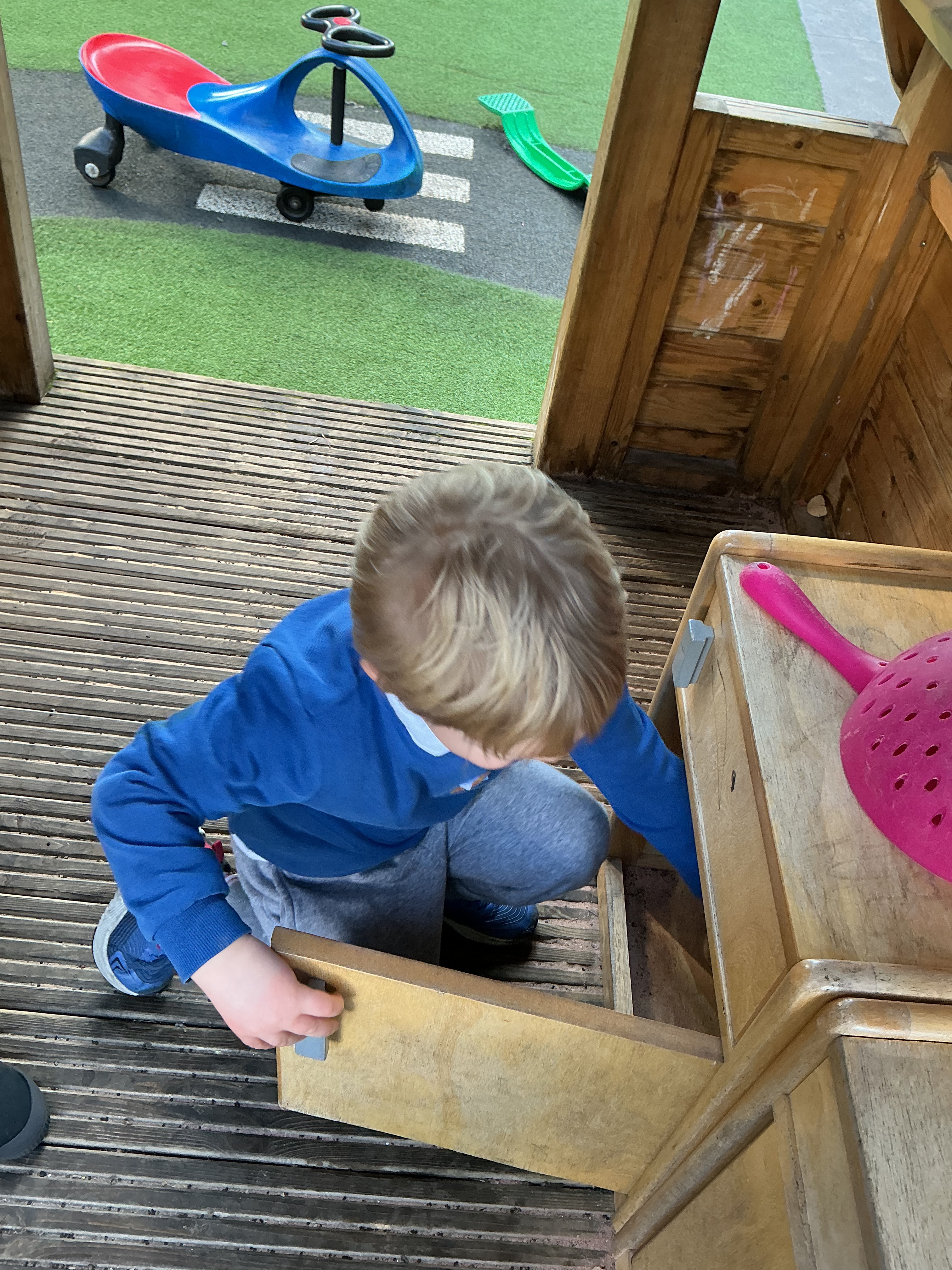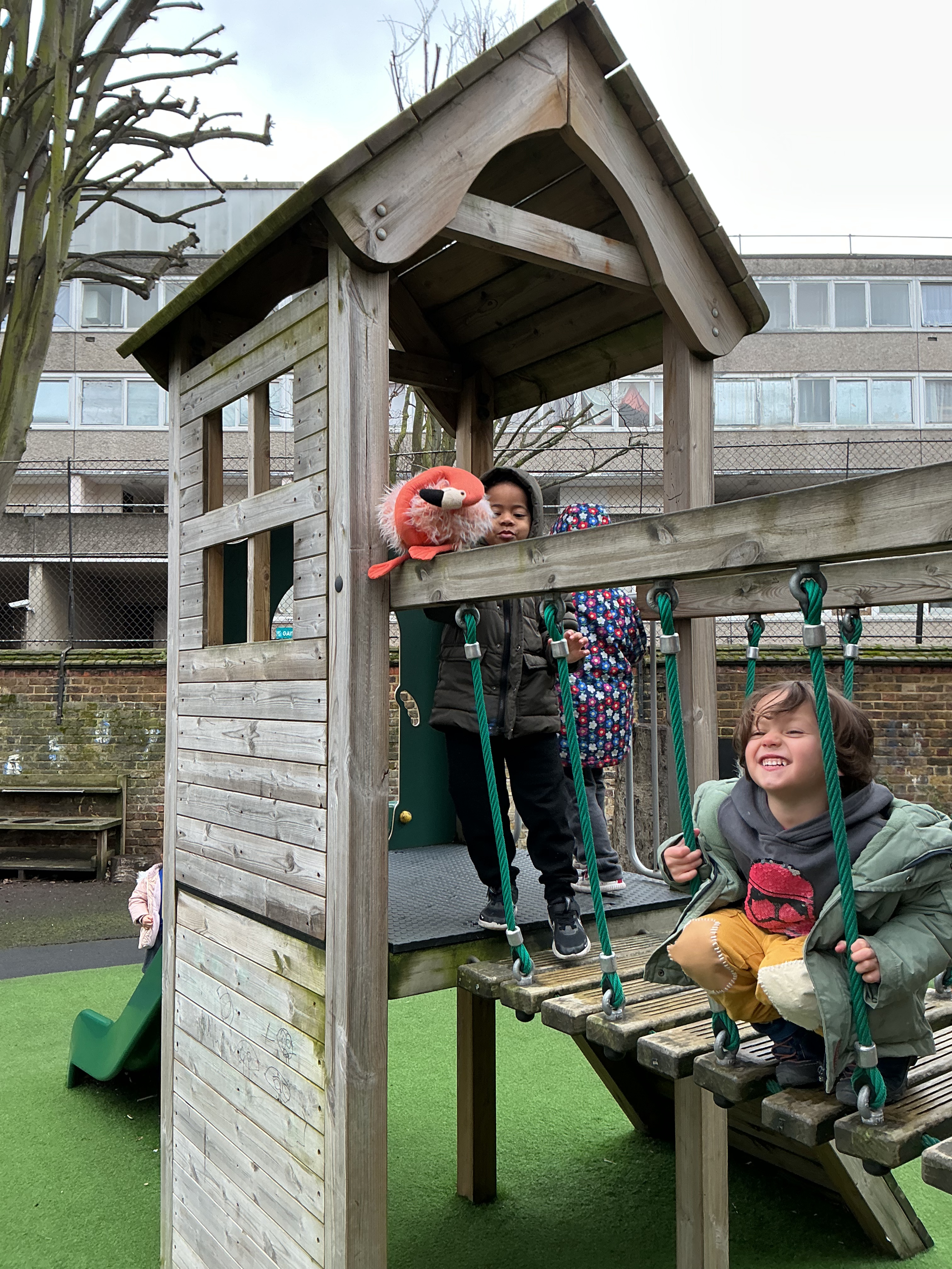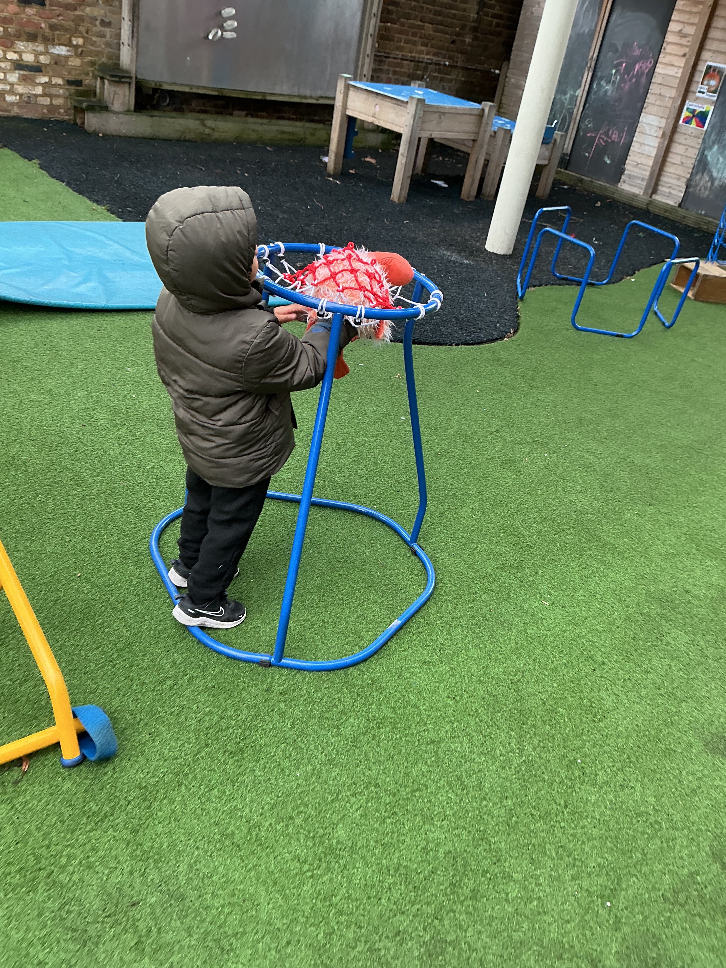 Joseph wondered, “No, he’s not in the oven…where’s the Gingerbread Man gone?” Jayden excitedly described movement, saying, “Flamingo is climbing up, then sliding down!” Olivia spotted a tricky place, “Hiding, in the basketball net,” while Amelia helped her friends by explaining, “He’s only under the slide.”