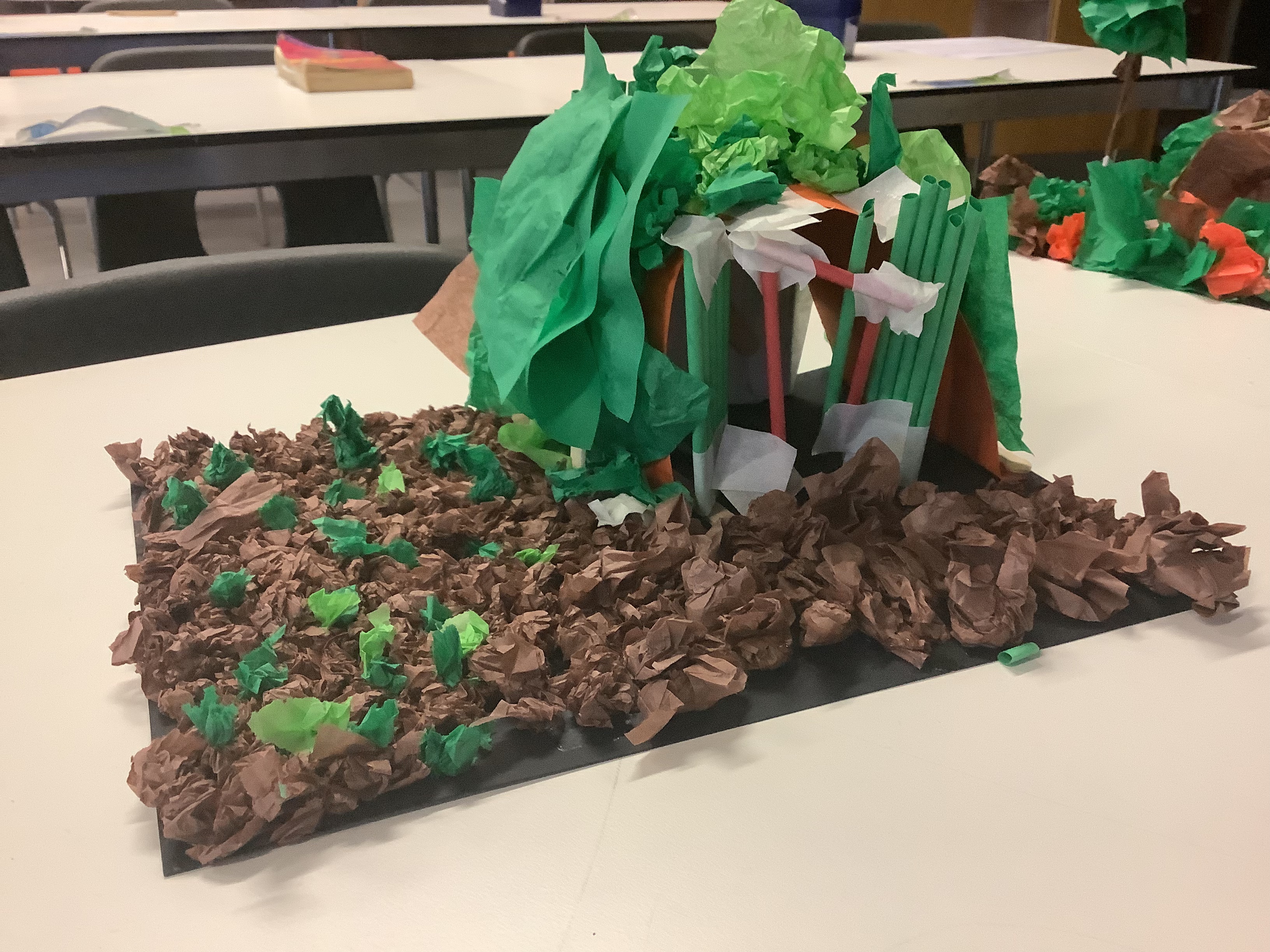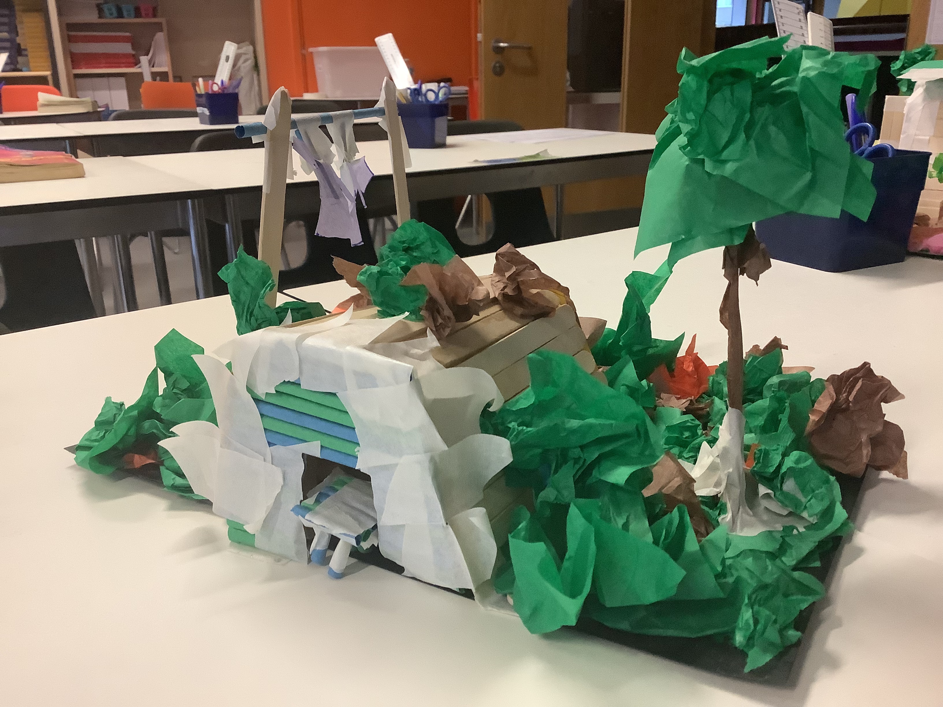 First we designed our shelters and made a plan, then we made them as a team. Some teams had to revise their plans as their original ideas did not work and this provided a good opportunity for problem solving as well as team work. We aimed to make shelters that were strong and realistic as well as adding areas for growing vegetables which was strongly encouraged by the government at the time due to rationing.