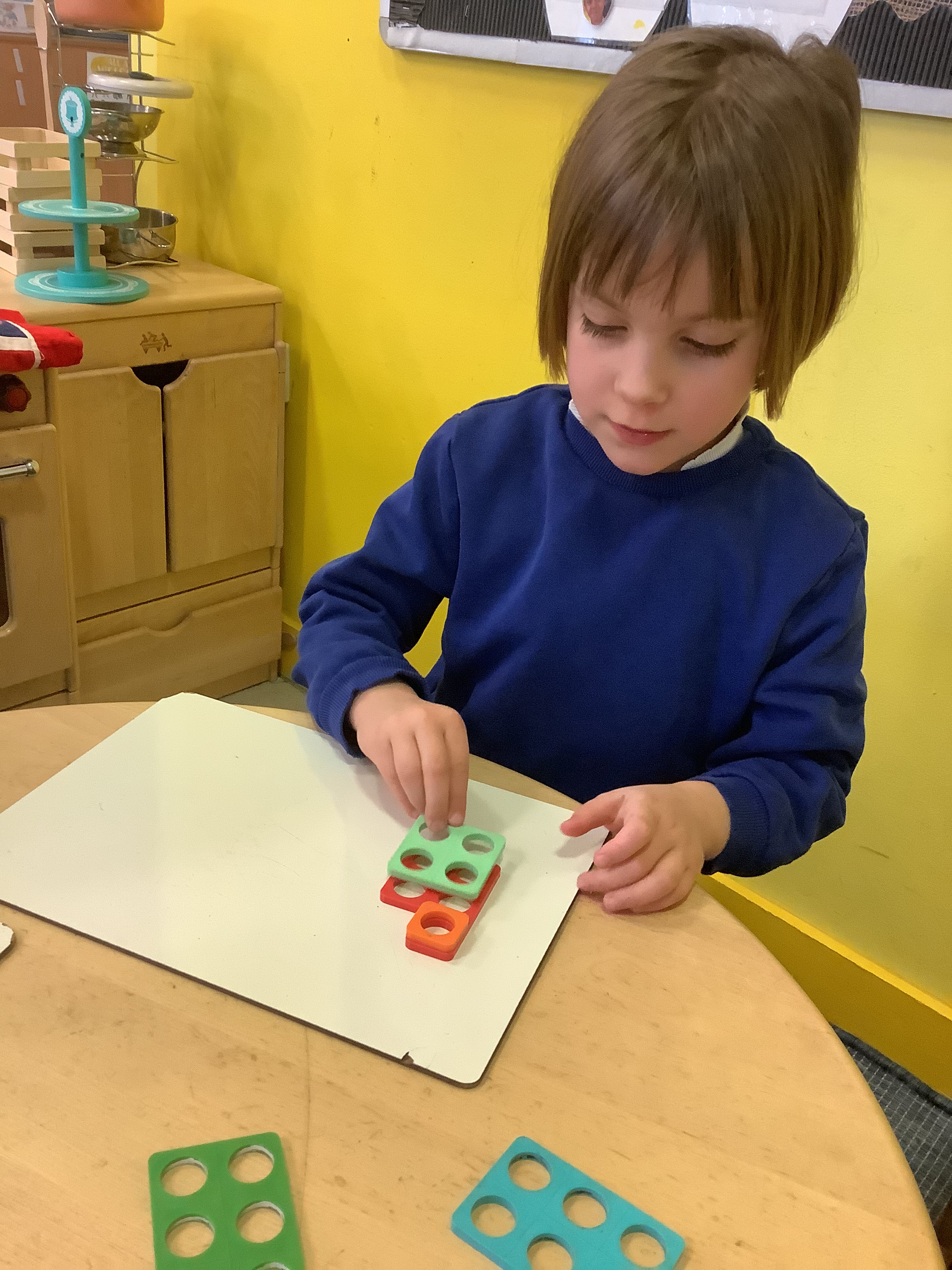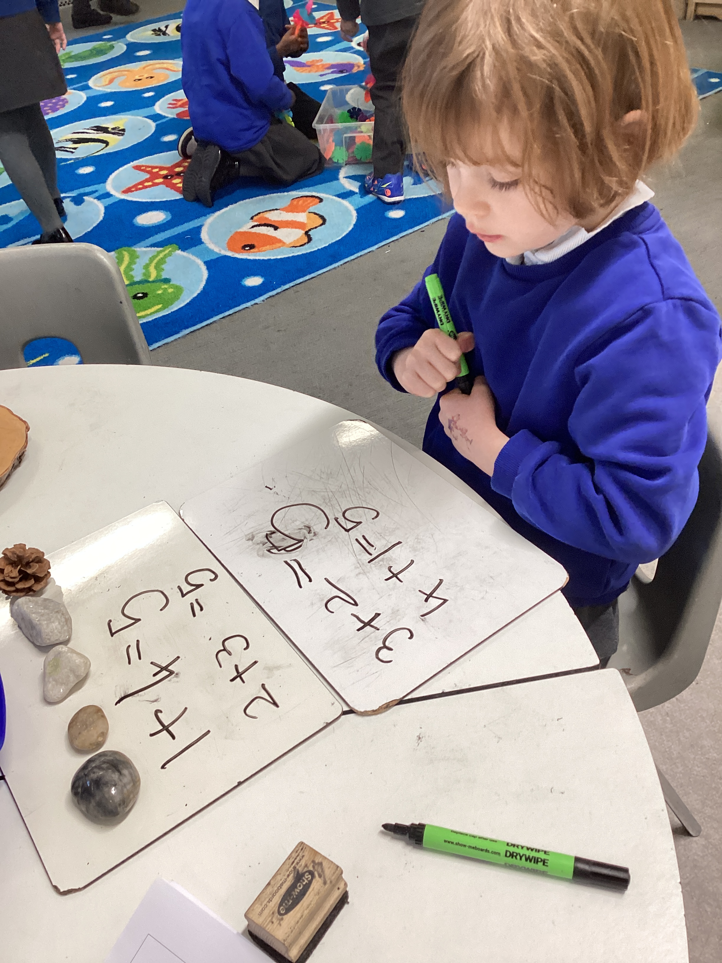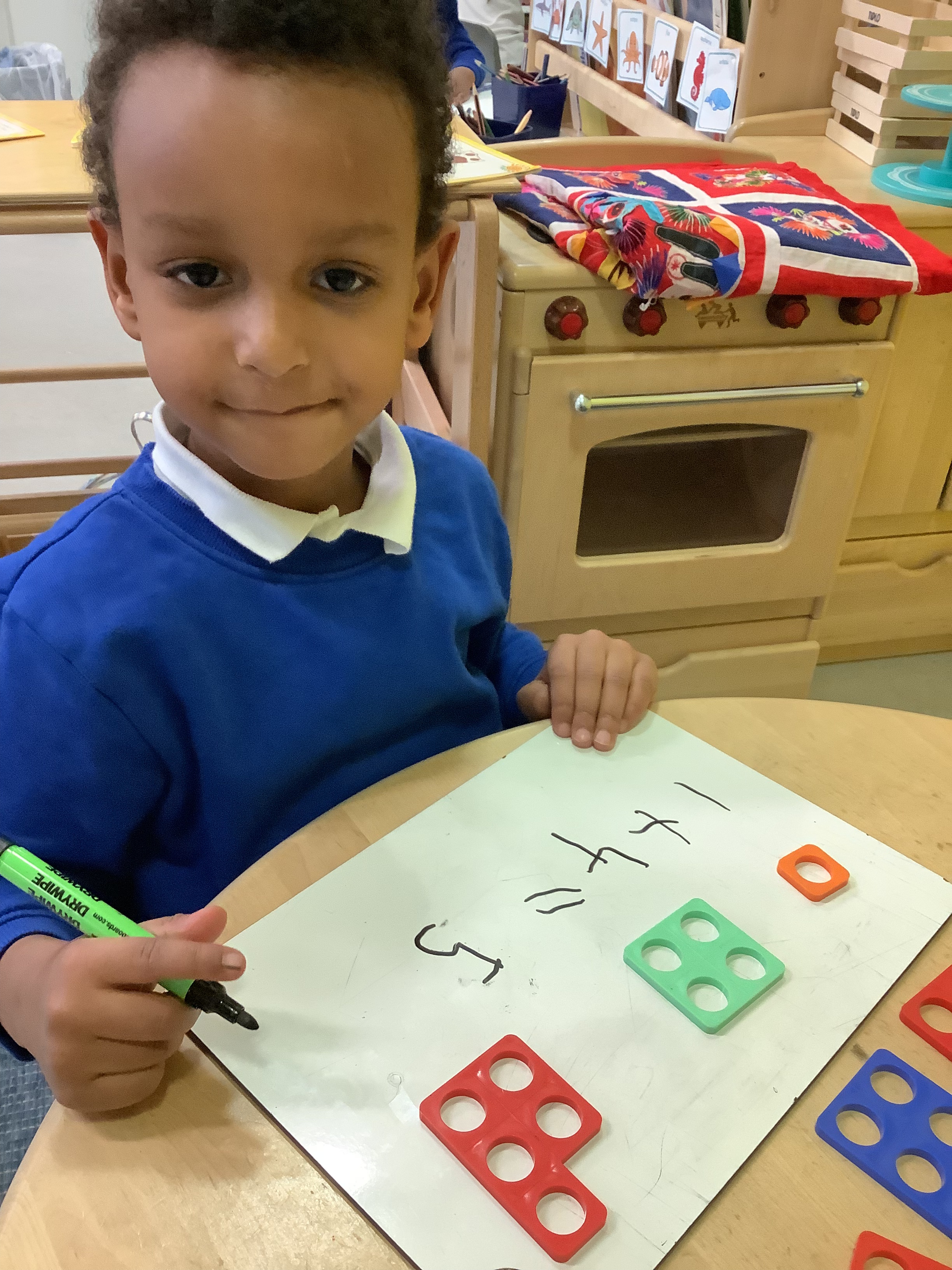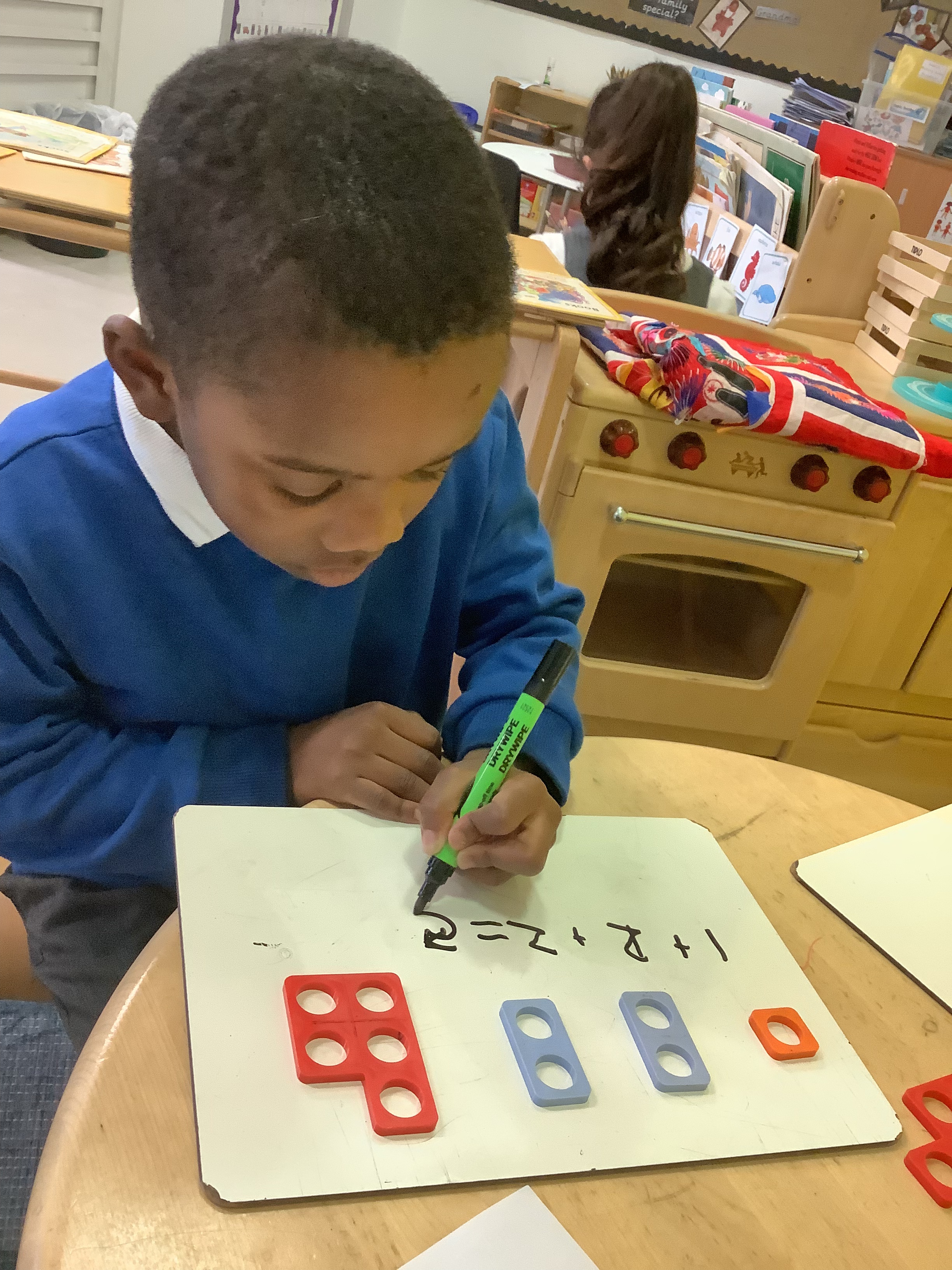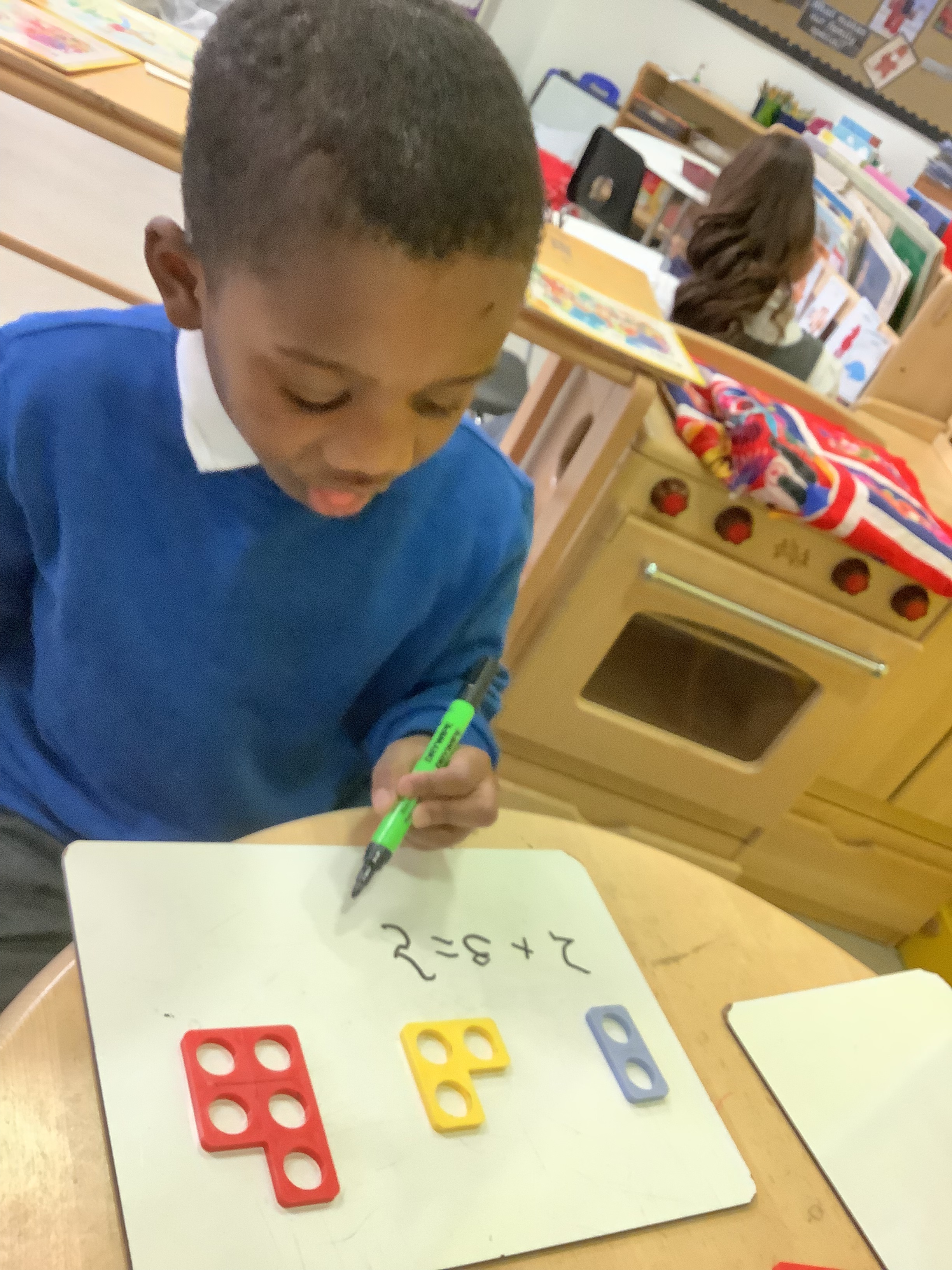 In Maths, we have been exploring number bonds to 5 using Numicon tiles. The children investigated which pairs combine to make 5 and experimented with different combinations. They then began recording their learning as number sentences using the addition and equals signs.