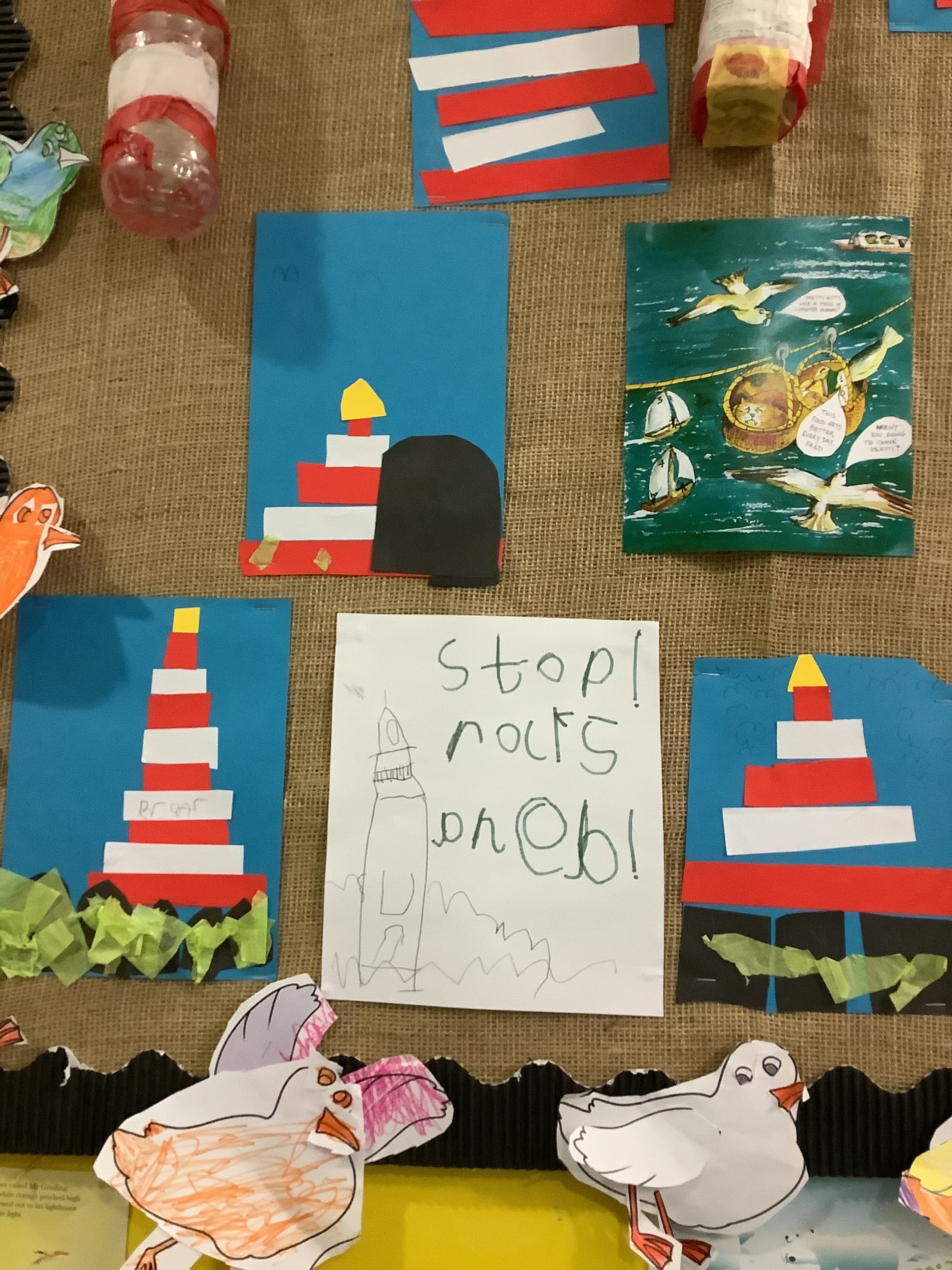 As part of our topic work, we have been reading The Lighthouse Keeper’s Lunch. The story captured the children’s imagination and led to lots of wonderful learning opportunities. We learnt about the purpose of lighthouses and designed and built our own using junk modelling materials. The children showed great creativity and teamwork while constructing their models. Inspired by the story, we made jam and cheese sandwiches and wrote simple instructions explaining the steps. We also designed warning posters to protect the Lighthouse Keeper’s lunch from the mischievous seagulls, thinking carefully about bold lettering and clear messages for passing ships!