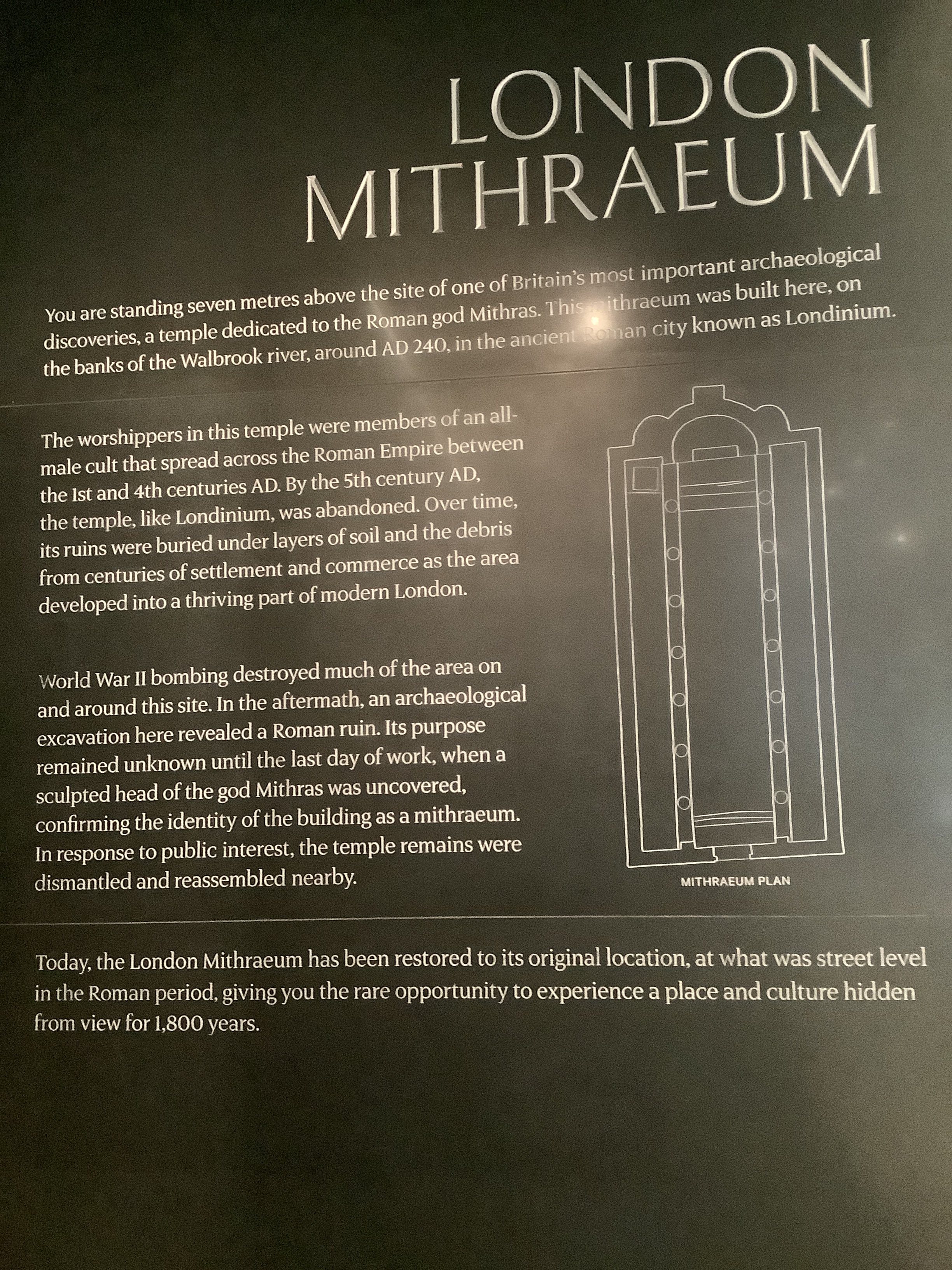 We visited London Mithraeum, which was discovered during the rebuilding of the city post WW2. A Mithraeum is a special temple dedicated to the Roman god Mithras. Followers of Mithras were very secretive, which explains the temple’s small size. A reconstruction helps us imagine how it would’ve been then: dark and smokey inside, full of male followers who chanted in Latin and dined together. We were told by our guide that only men were allowed inside the temple and that they would have to take part in a special initiation ceremony to prove themselves worthy of joining.