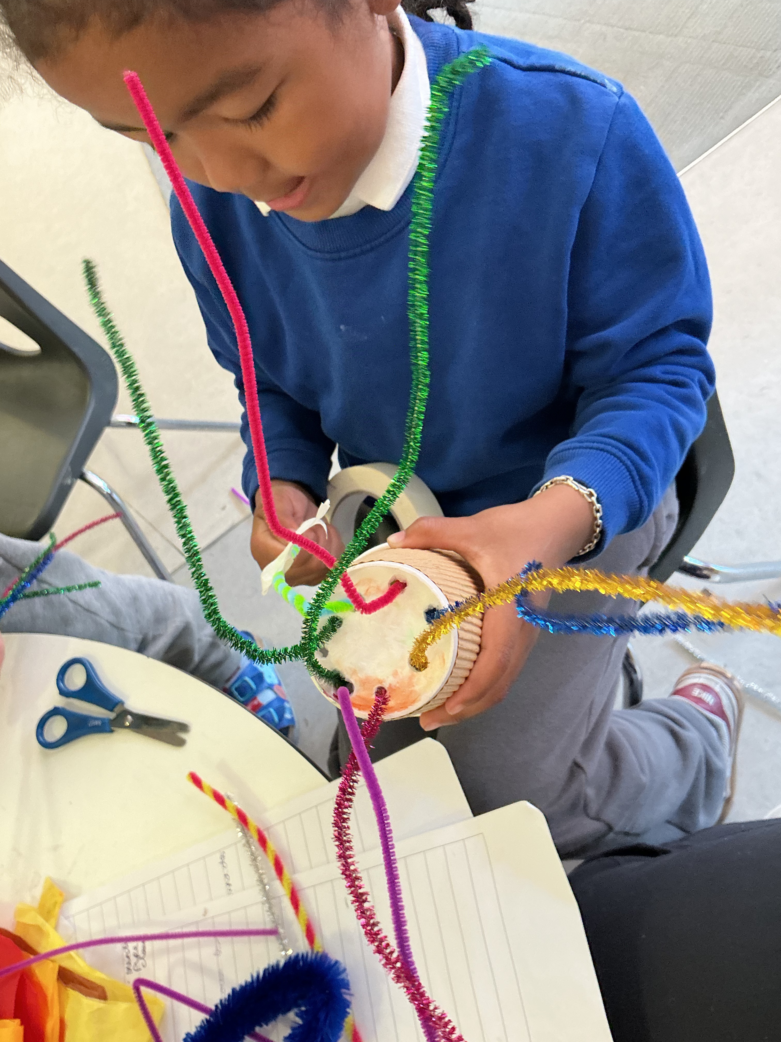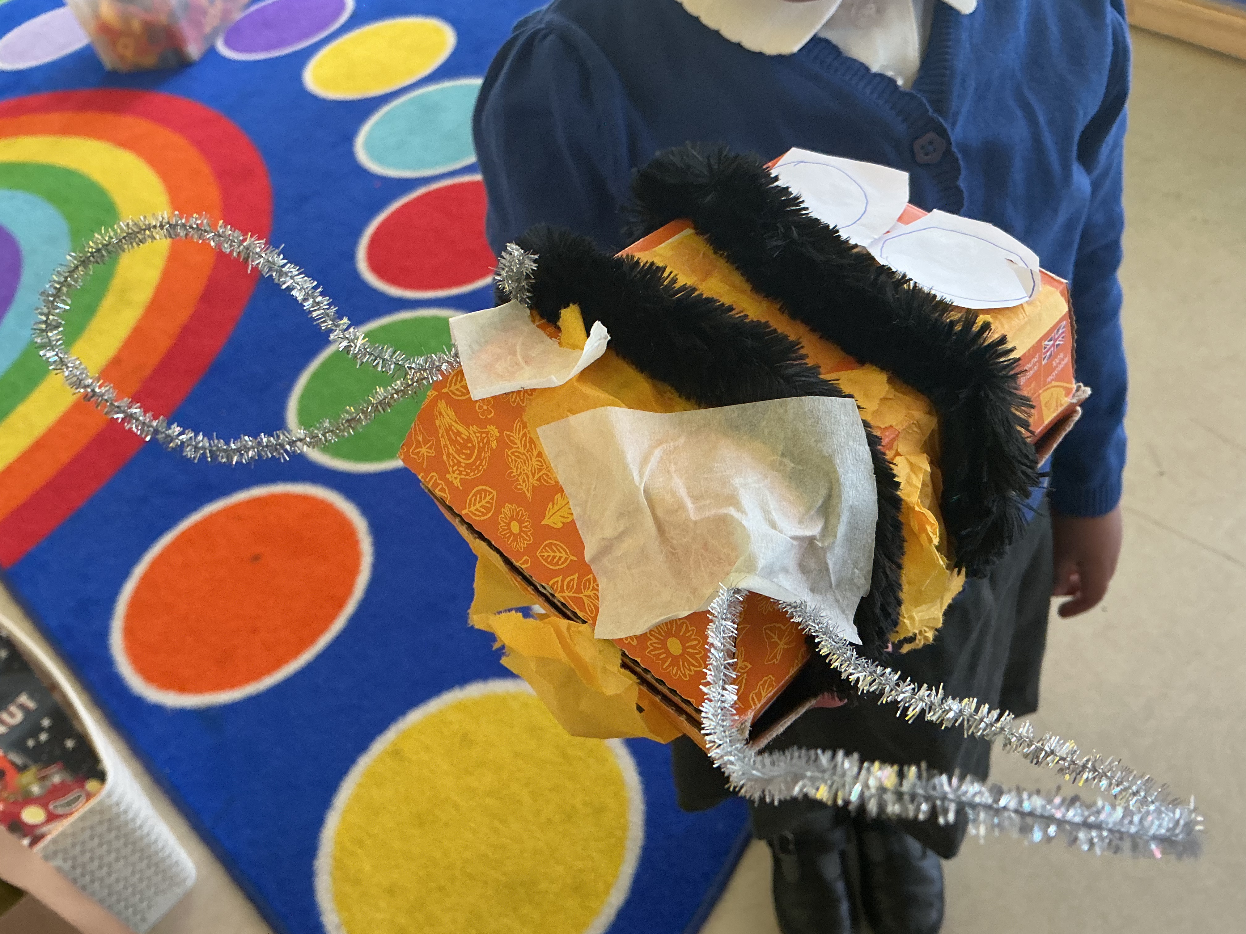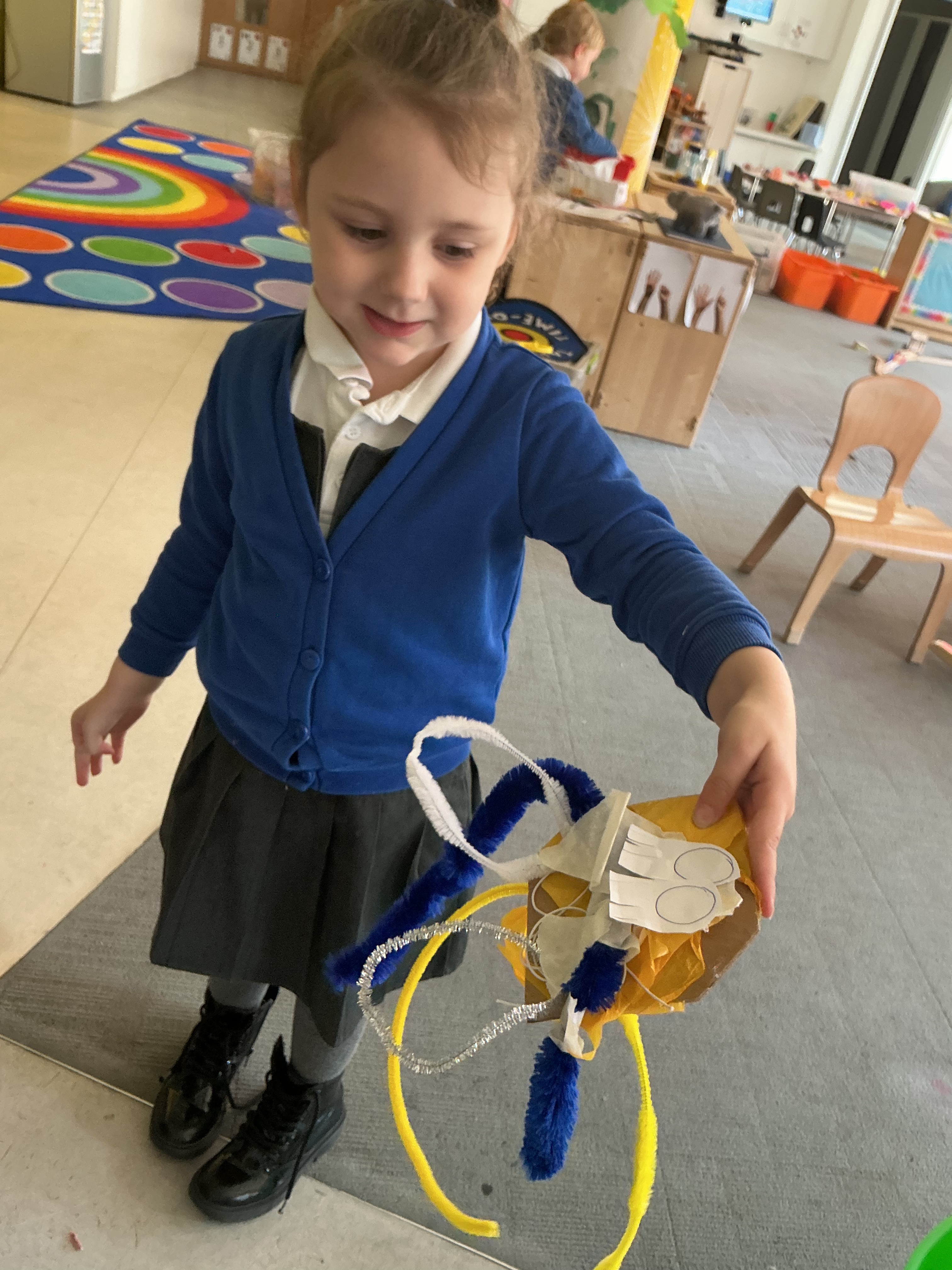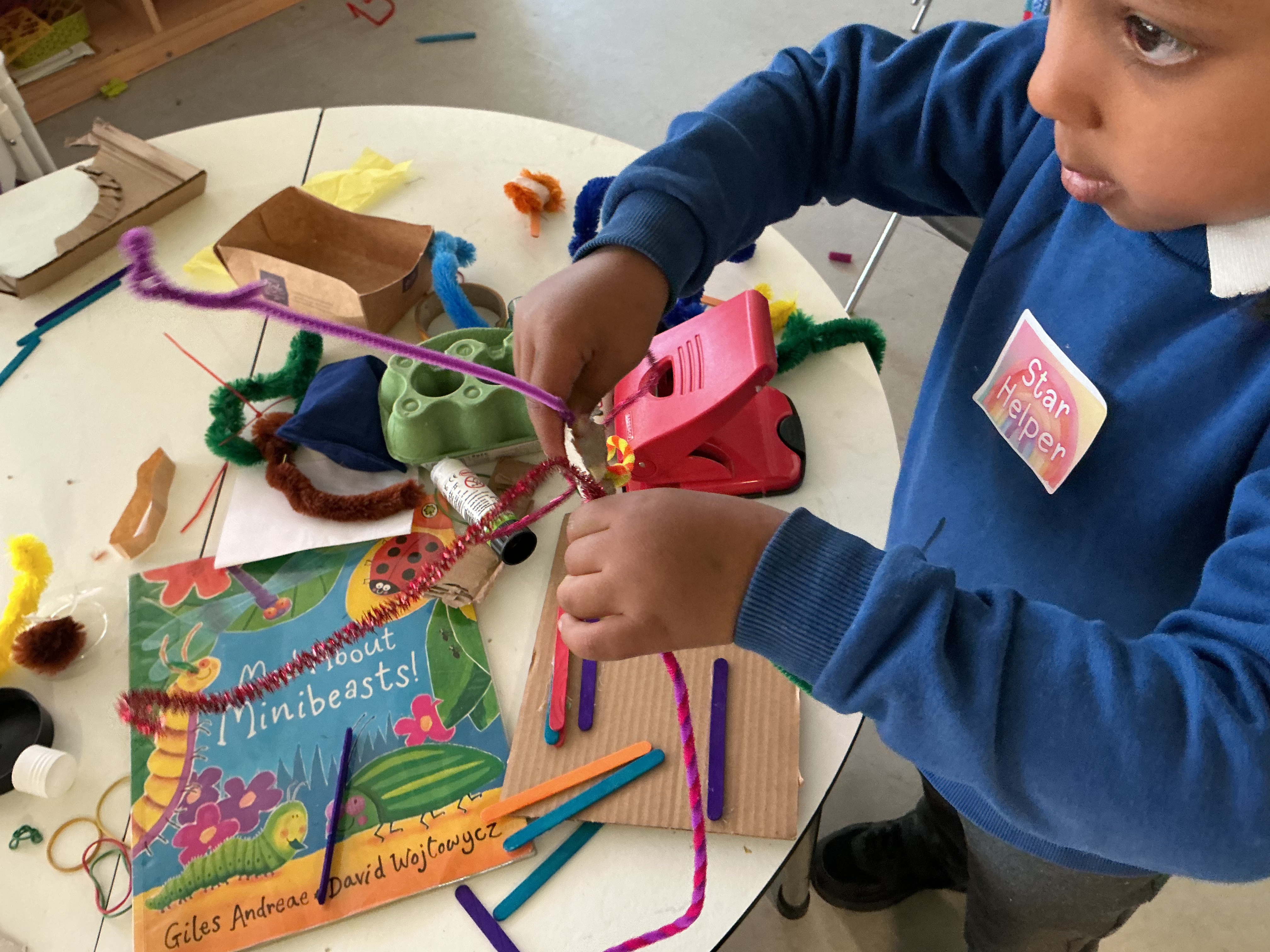The children have enjoyed identifying minibeasts during Forest School sessions and whilst exploring in our Nursery Outdoor area. One of the activities has been to set a challenge to design a minibeast which involves using different skills to attach different body parts, (without them falling off!)